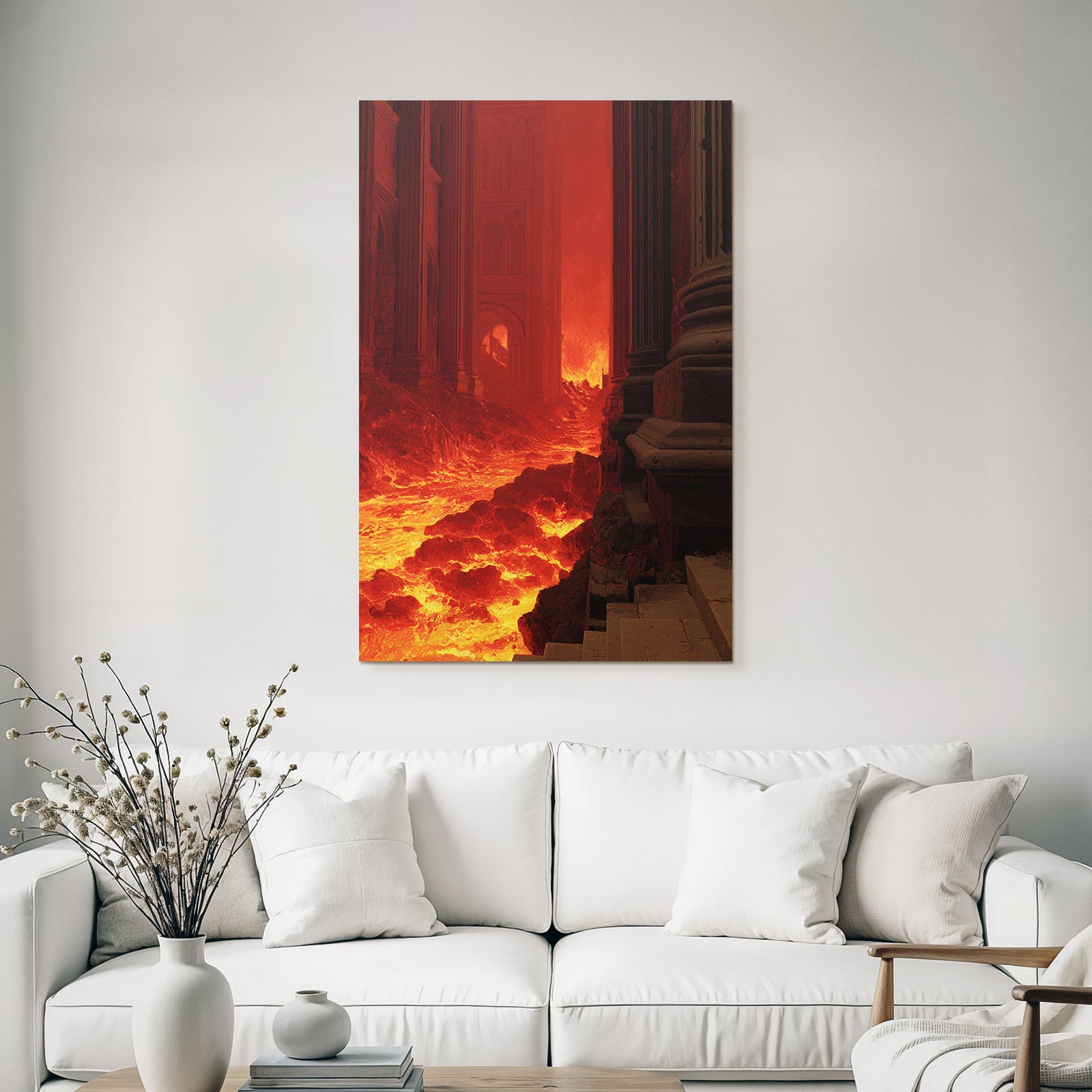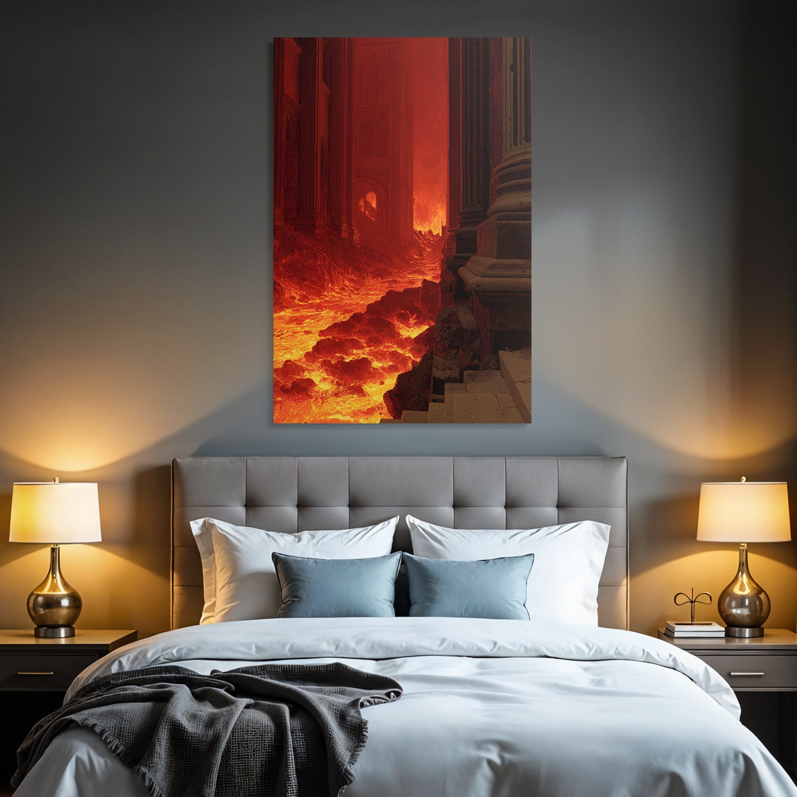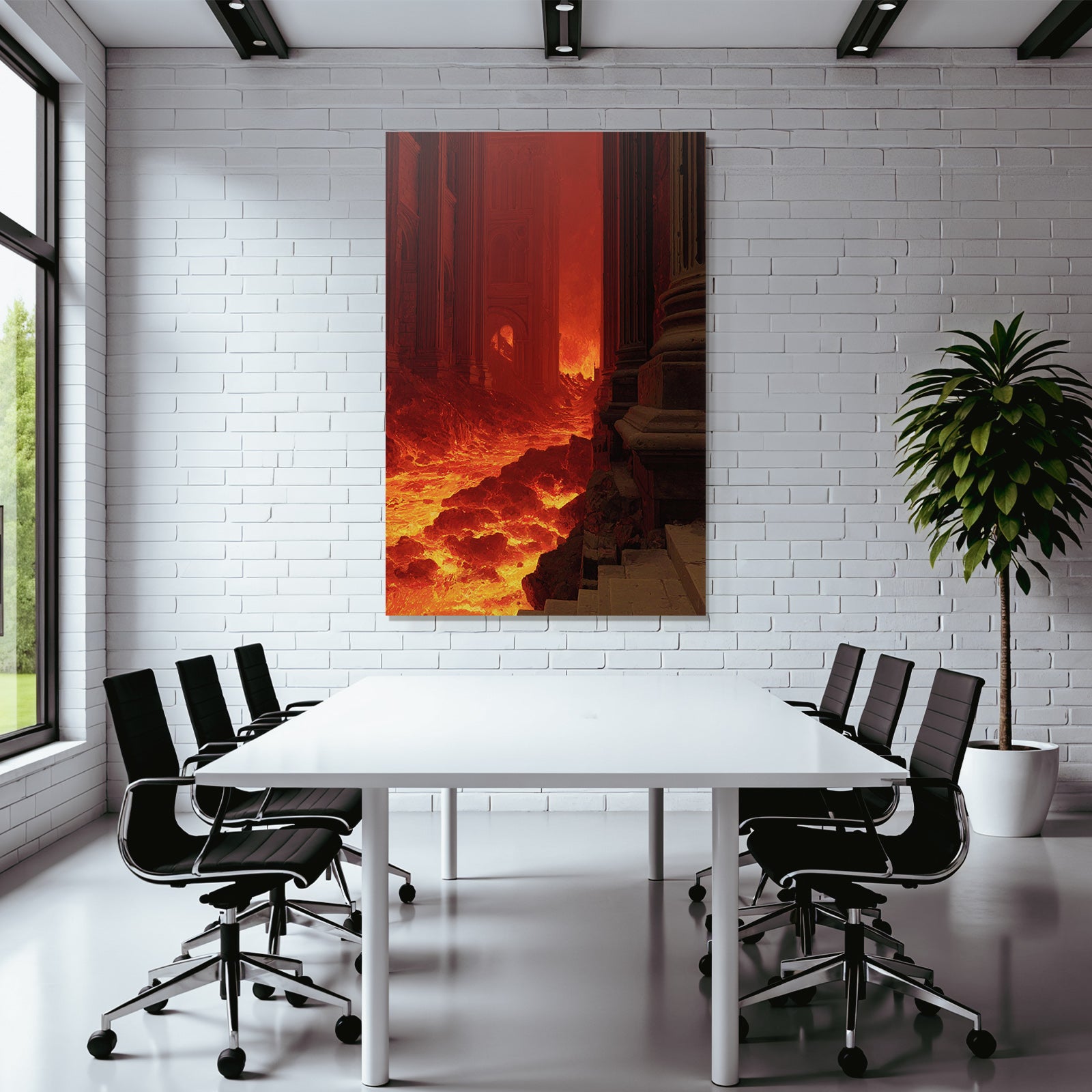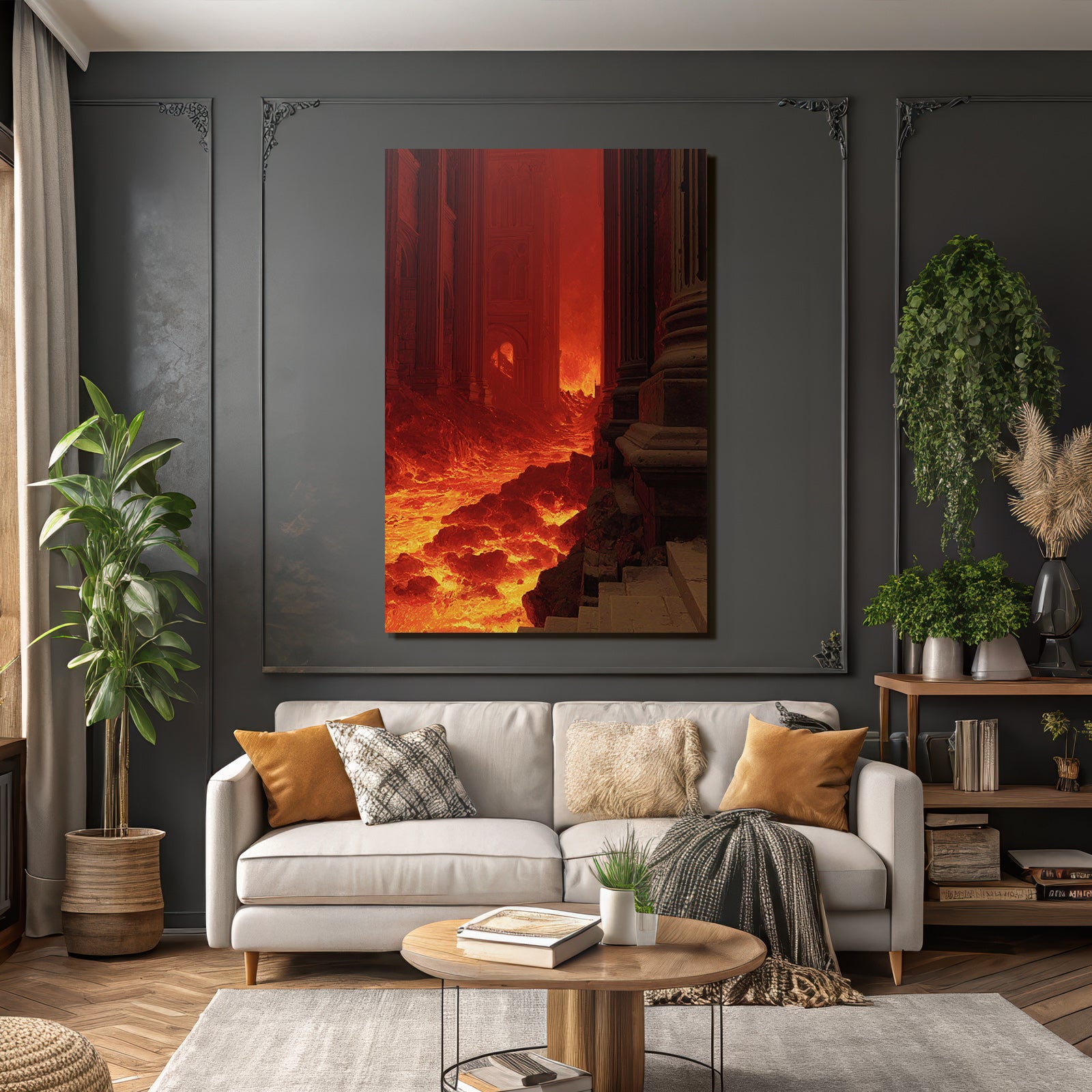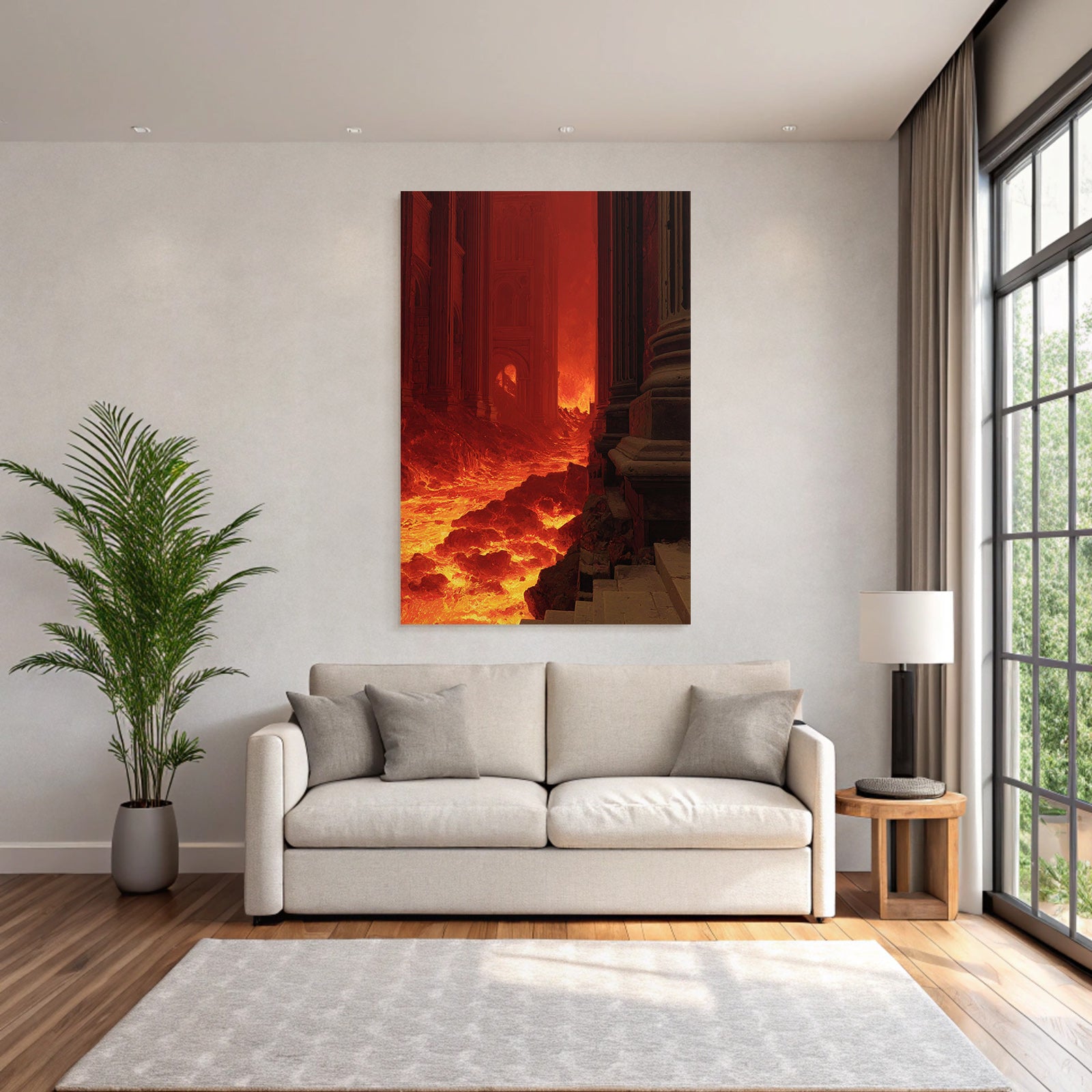 Ein Highlight für Wohnzimmer, Studio oder Empfangsbereich: „Feurige Vulkanlandschaft Mit Ruinen“ bringt den Stil Feuer und Vulkane auf Stoff – gespannt im edlen FameFrame.