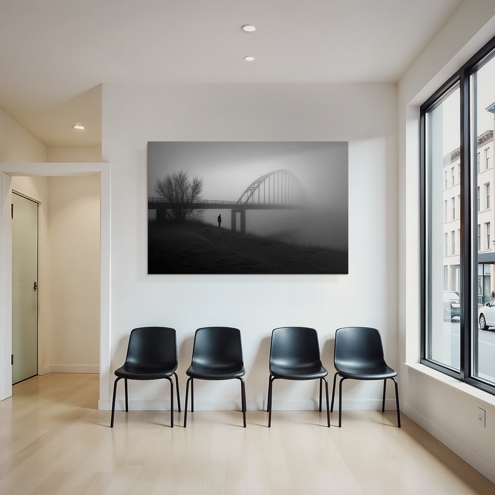 „Figur An Brücke Umgeben Von Nebel“ bringt den Stil Fotografie an Deine Wand – perfekt für Schlafzimmer, Homeoffice oder Besprechungsräume, edel gerahmt im FameFrame.