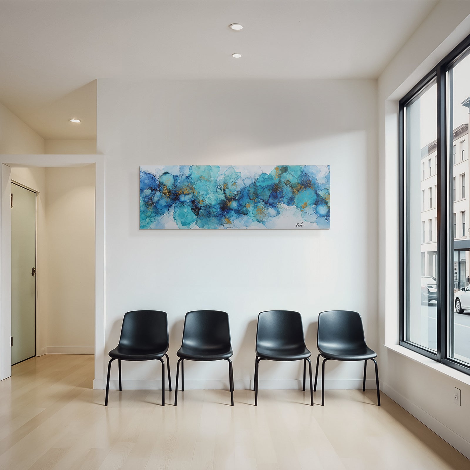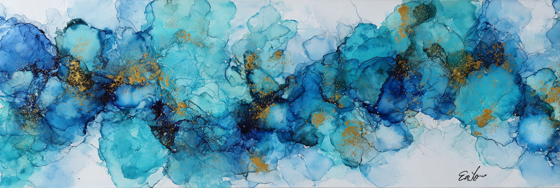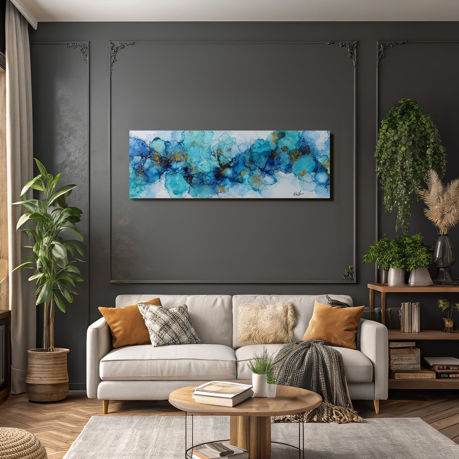Lassen Sie „Fluide Art Blau Türkis Goldakzente“ für sich sprechen. Dieses Werk im Abstrakt-Design wird durch die Präsentation im FameFrame zu einem echten Galerie-Stück für Ihr Zuhause.