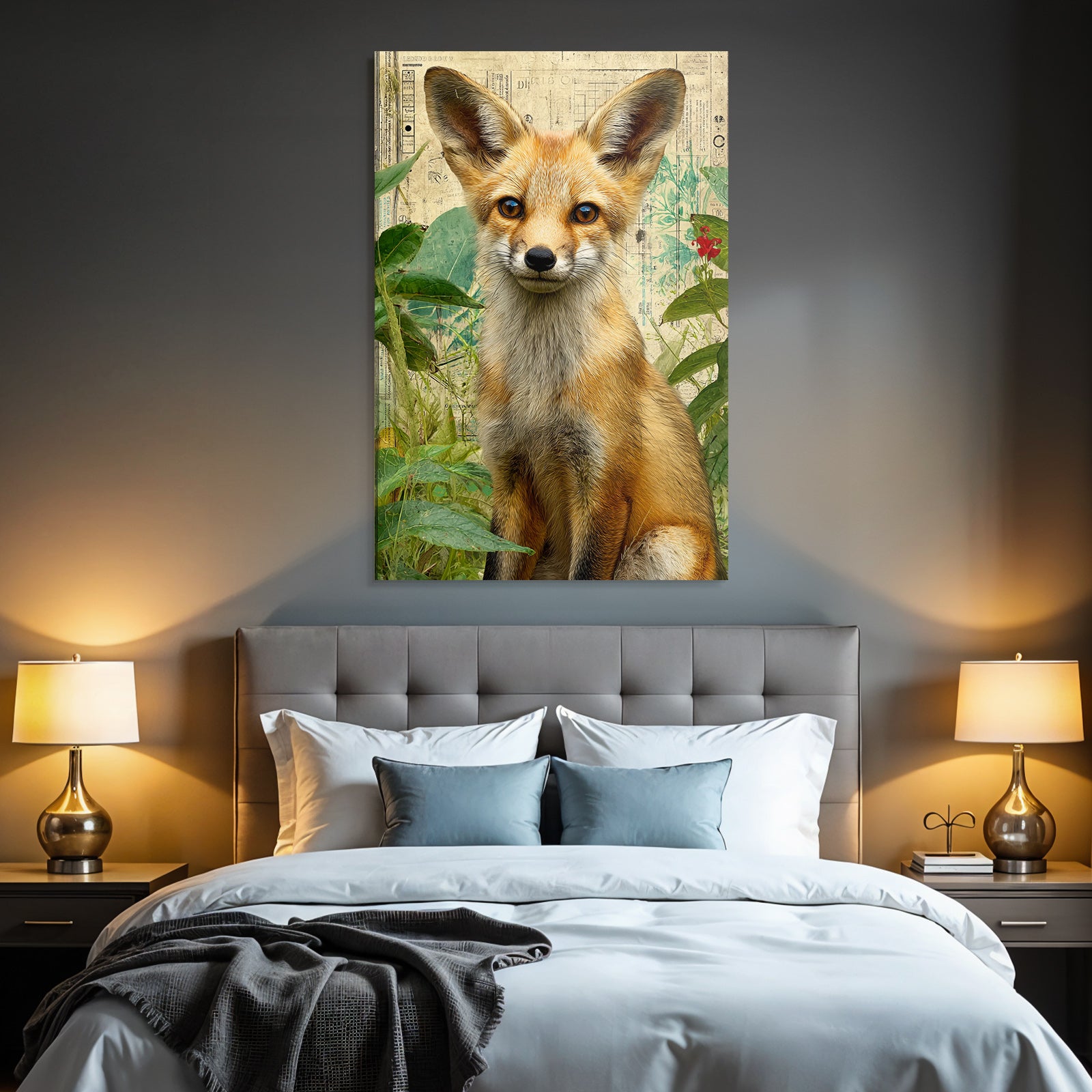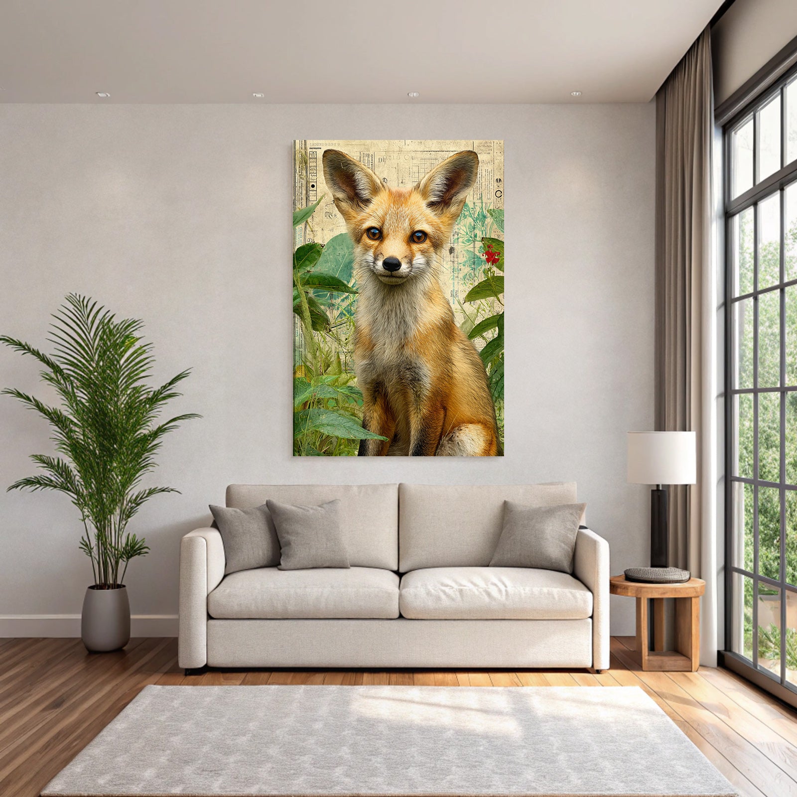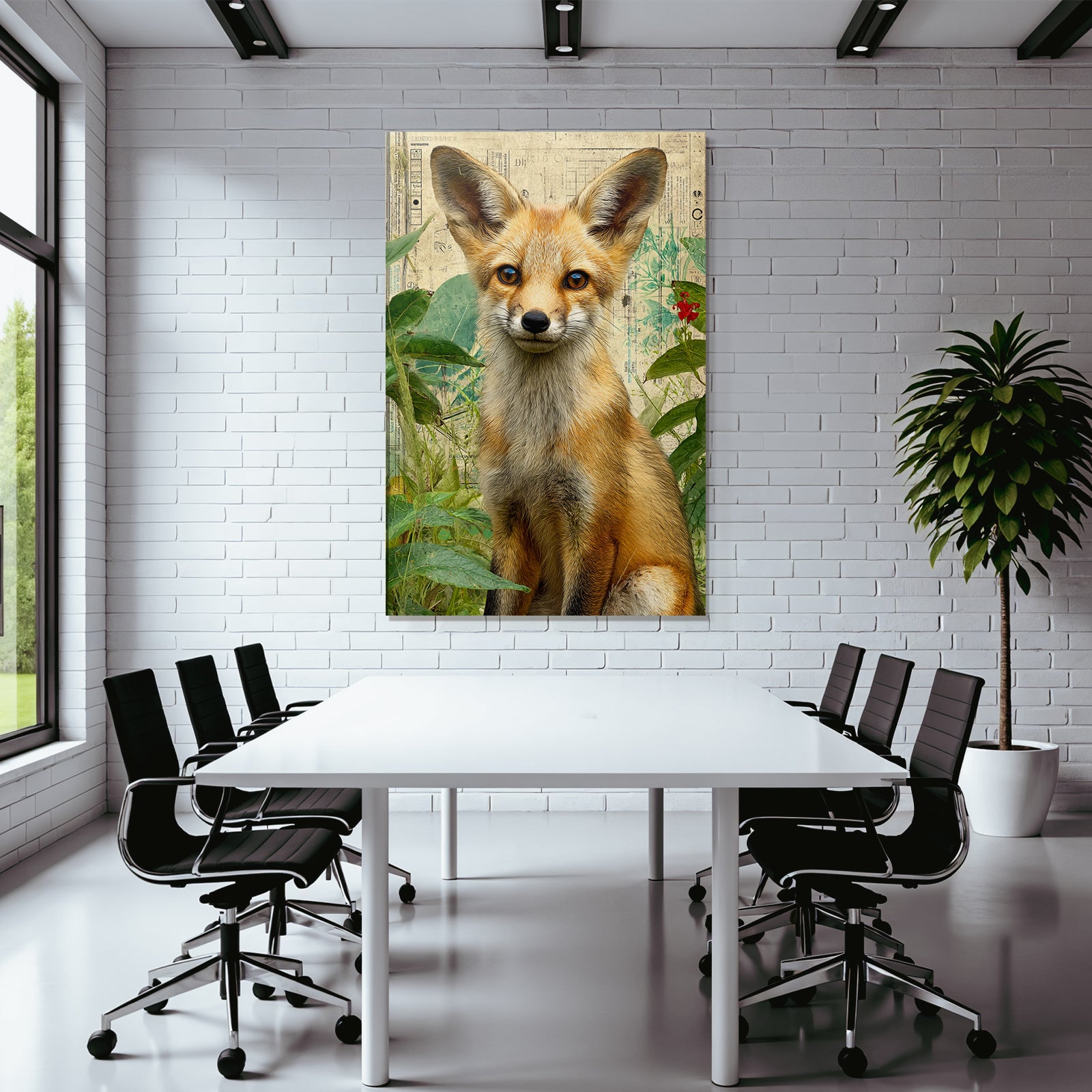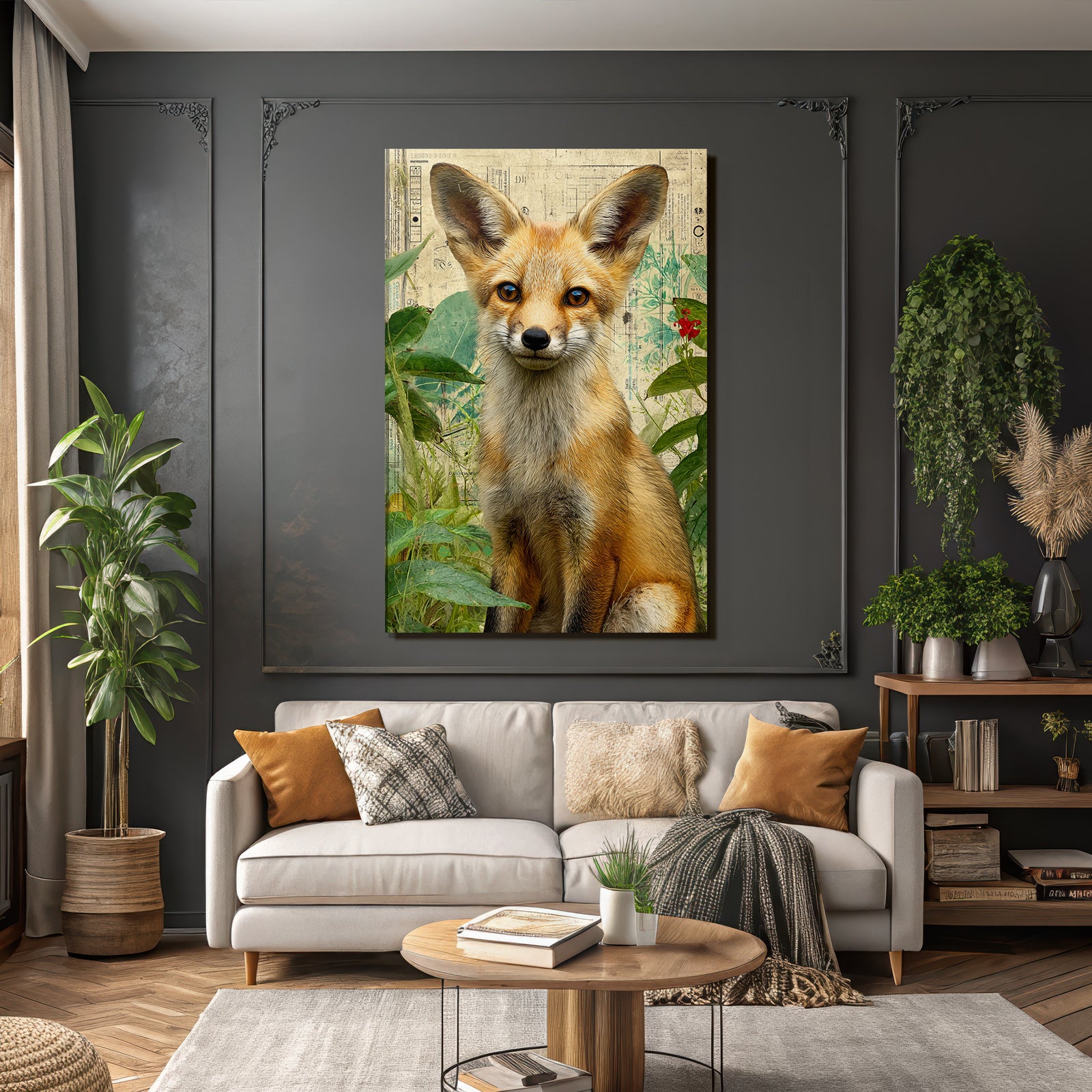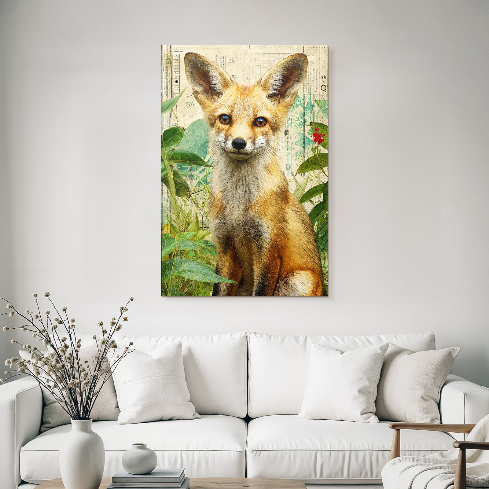 Ein einzigartiges Kunstwerk der Produktlinie FameFrame mit dem Titel „„Fuechse In Gruenem Hintergrund Kuenstlerische Darstellung““, im Stil Collagen.