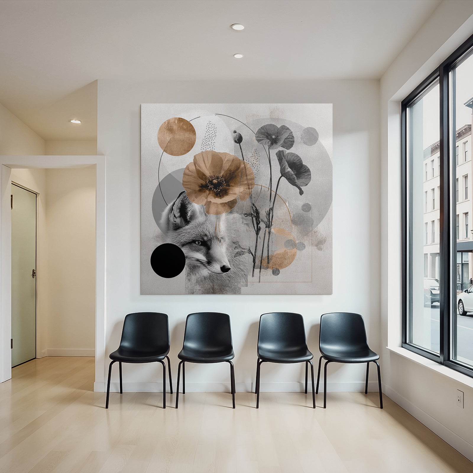 Ein Stück Collagen für Deine vier Wände: Das Werk „„Fuechse Und Blumen Kollage Geometrische Grafik Abstrakt““ im hochwertigen FameFrame bringt kreative Energie in jeden Raum.
