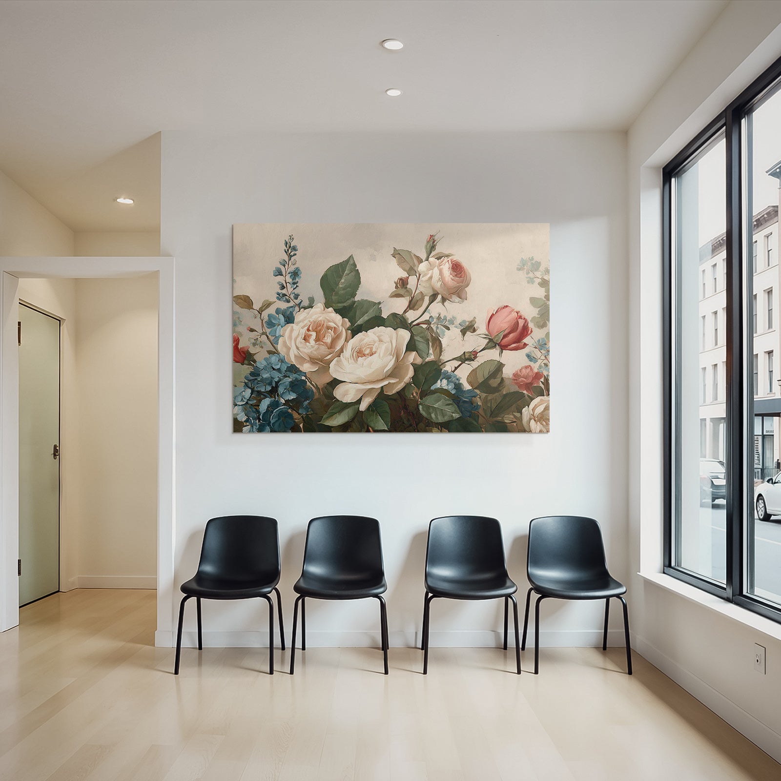 Entdecken Sie die Facetten von „Gemälde Rosen Und Blaü Blüten“. Dieses Motiv im Look von Rosen Tulpen Lavendel ist eine Zierde für jeden Raum und wird im FameFrame elegant inszeniert.