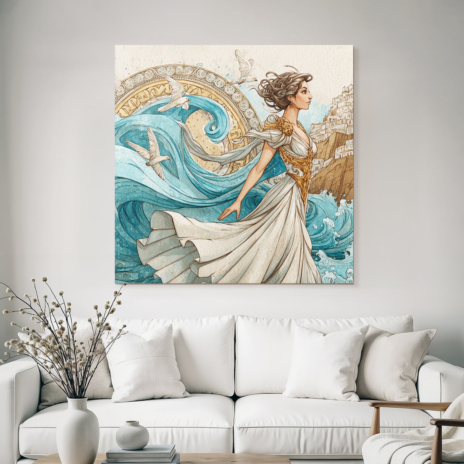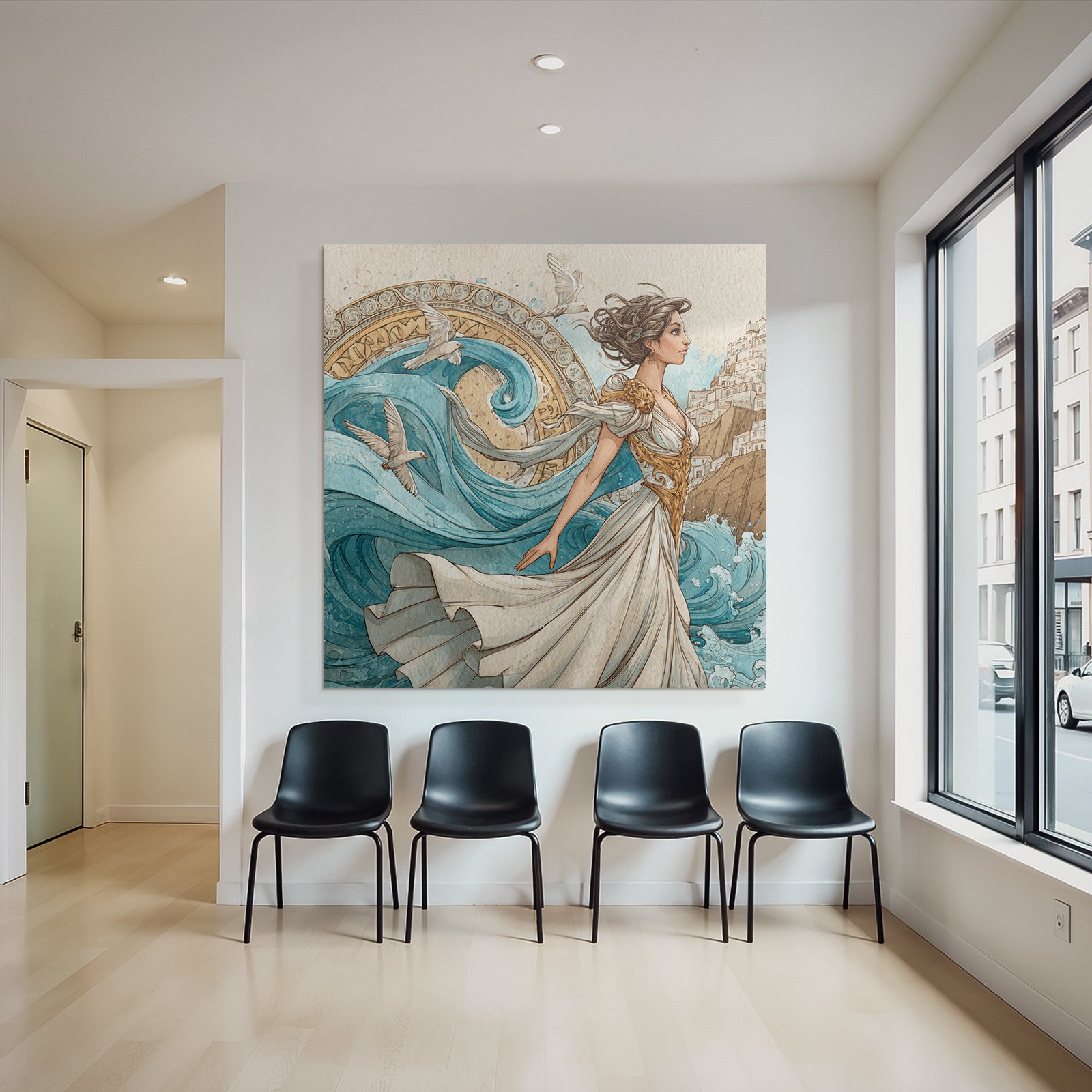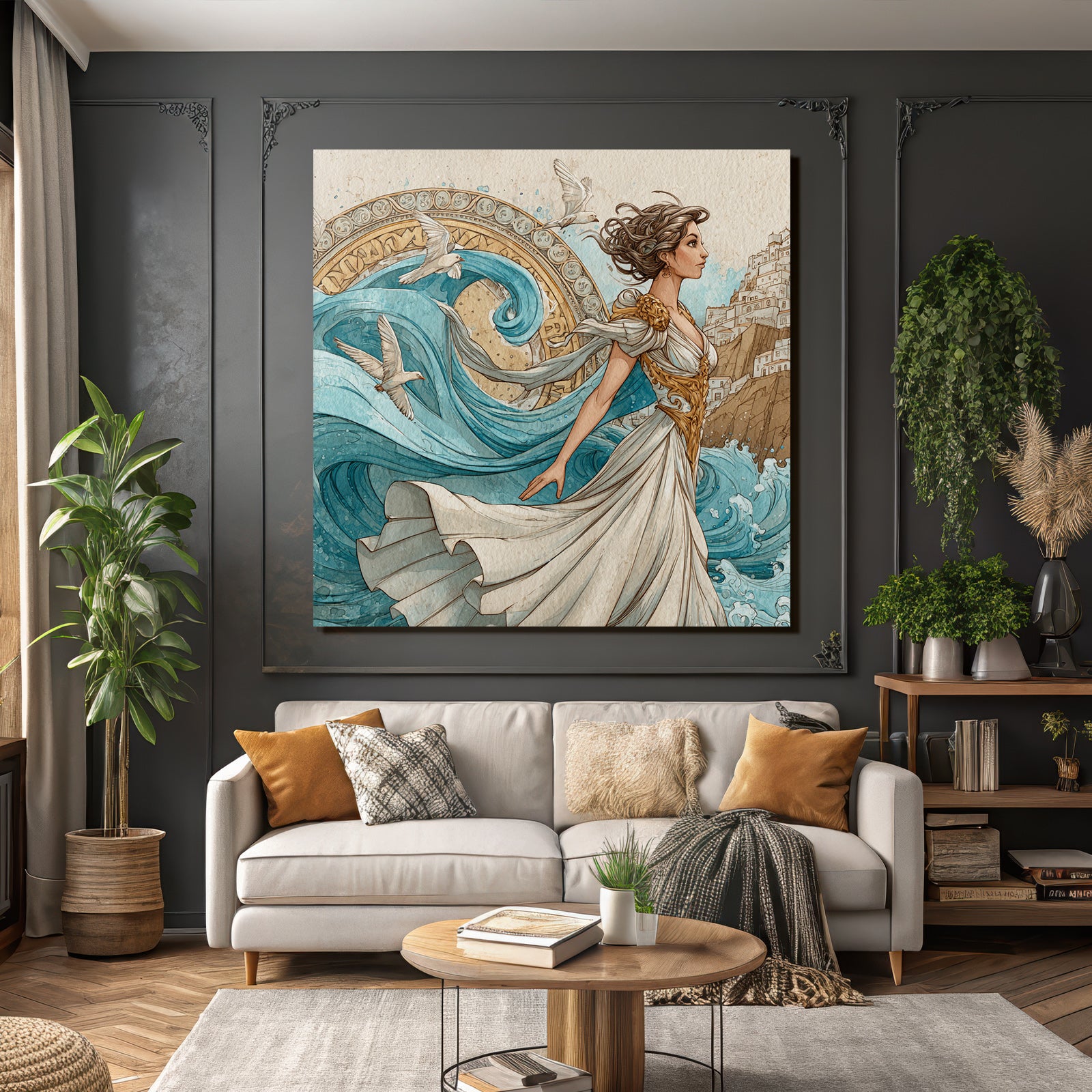 „Göttin Am Küstenufer Mit Wellen Und Vögeln“ verleiht Ihrem Raum Charakter. Die Anlehnung an den Stil Jugendstil, kombiniert mit der schlichten Eleganz des FameFrame™, schafft eine einzigartige Atmosphäre.