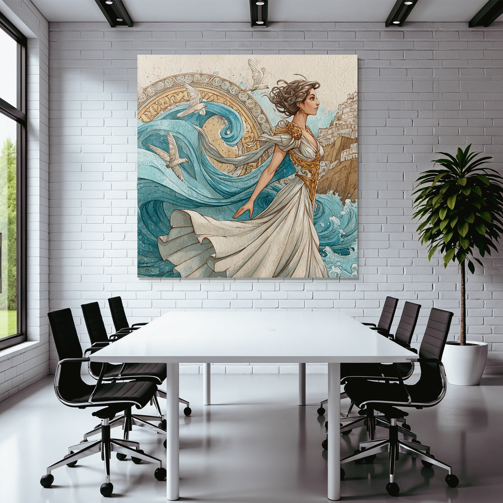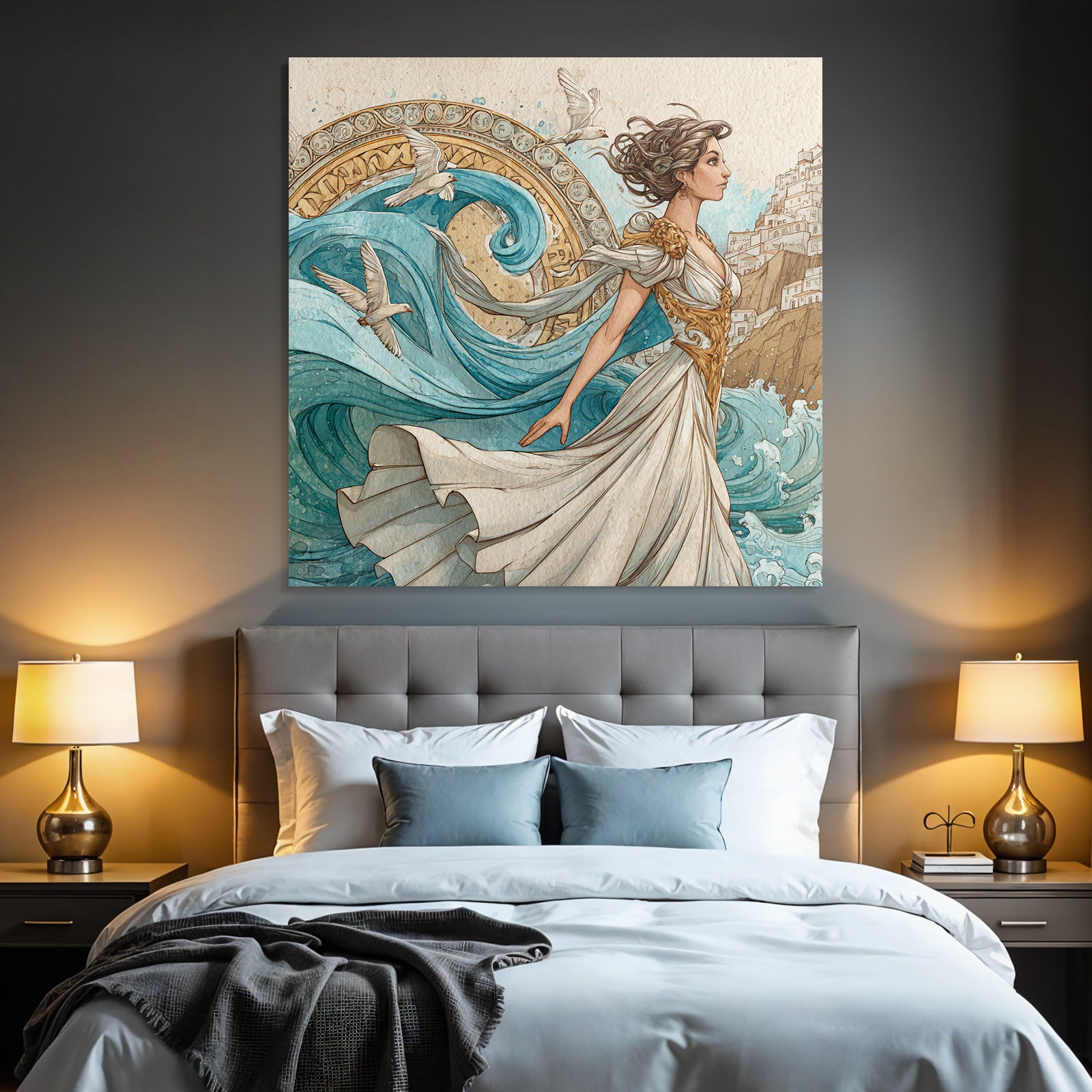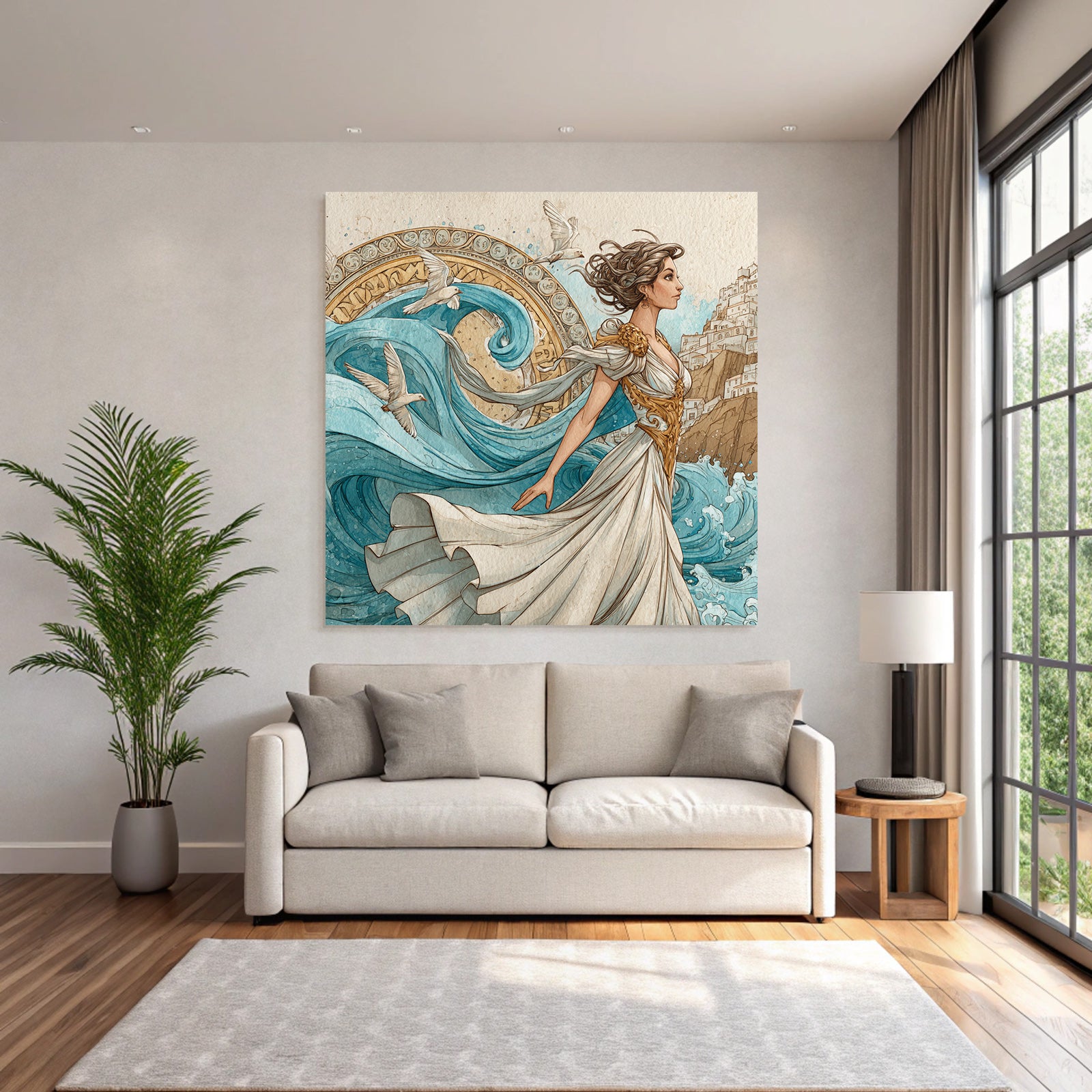 „Göttin Am Küstenufer Mit Wellen Und Vögeln“ verleiht Ihrem Raum Charakter. Die Anlehnung an den Stil Jugendstil, kombiniert mit der schlichten Eleganz des FameFrame™, schafft eine einzigartige Atmosphäre.