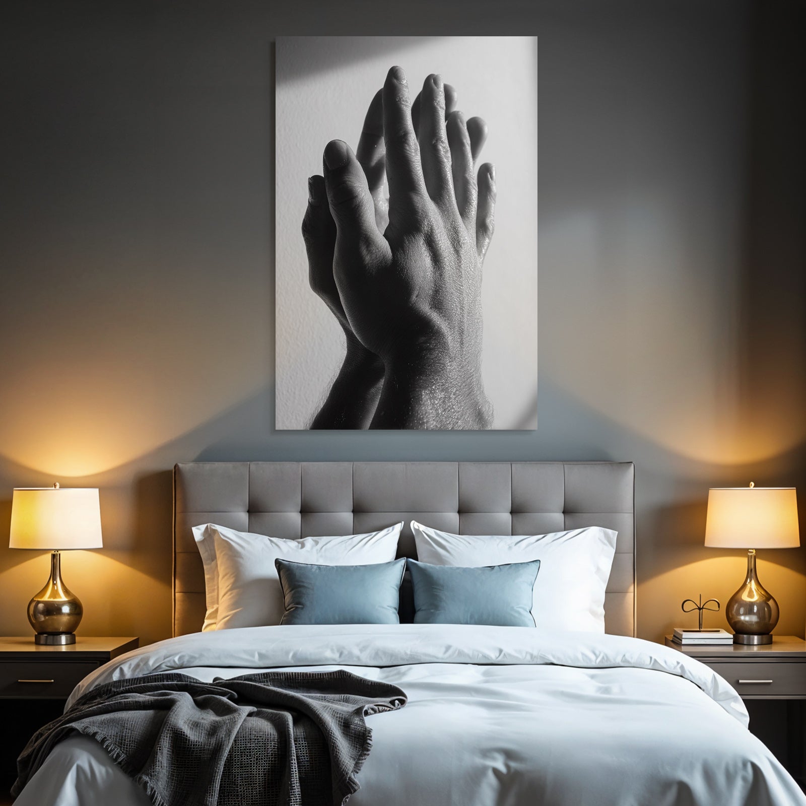 Erleben Sie die pure Essenz von Hände und Gestik. Das Werk „Hände Im Contrast Bw Licht Hintergrund Texturen Und Formen“ wird durch den hochwertigen Textildruck im FameFrame™ zu einem Statement-Piece.
