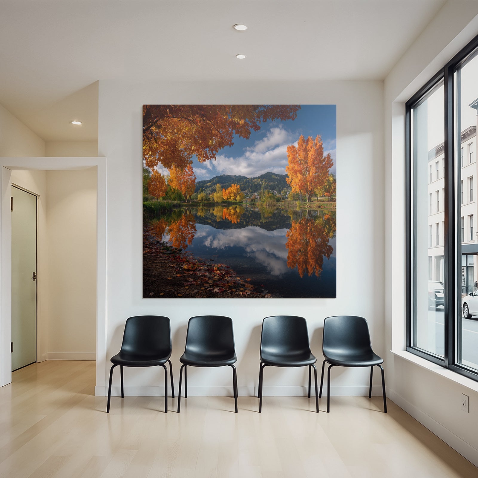 Verschönere Dein Zuhause mit diesem Werk im Stil Indian Summer. Der Titel „Herbstlandschaft Reflexion Beruhigende Ruhe“ kommt im hochwertigen FameFrame perfekt zur Geltung.