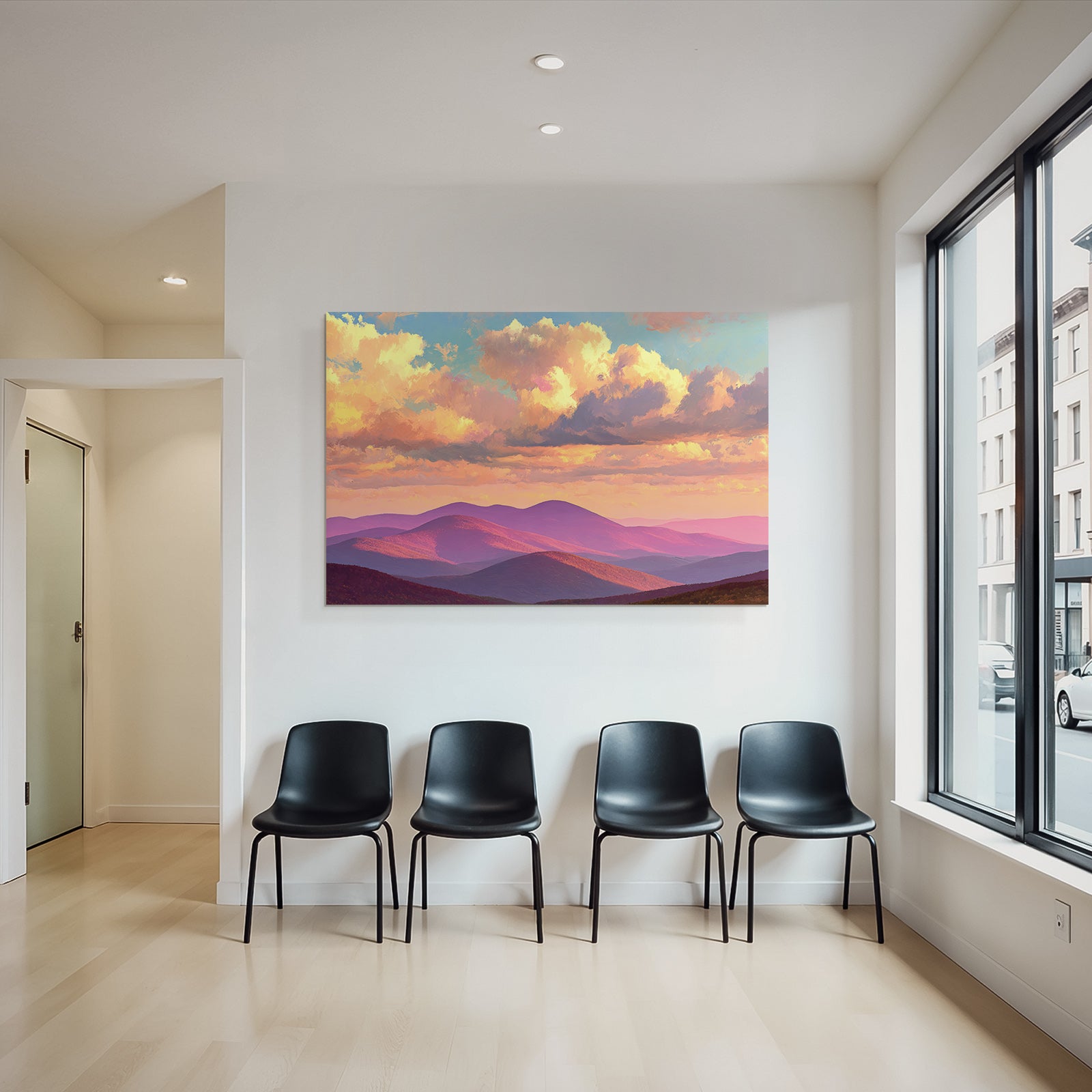 Die Kombination aus dem Motiv „Impressionistische Hügellandschaft Beim Sonnenuntergang“ und dem Stil Himmel und Wolken schafft eine Brücke zwischen Klassik und Moderne. Der FameFrame vollendet dieses Zusammenspiel perfekt.