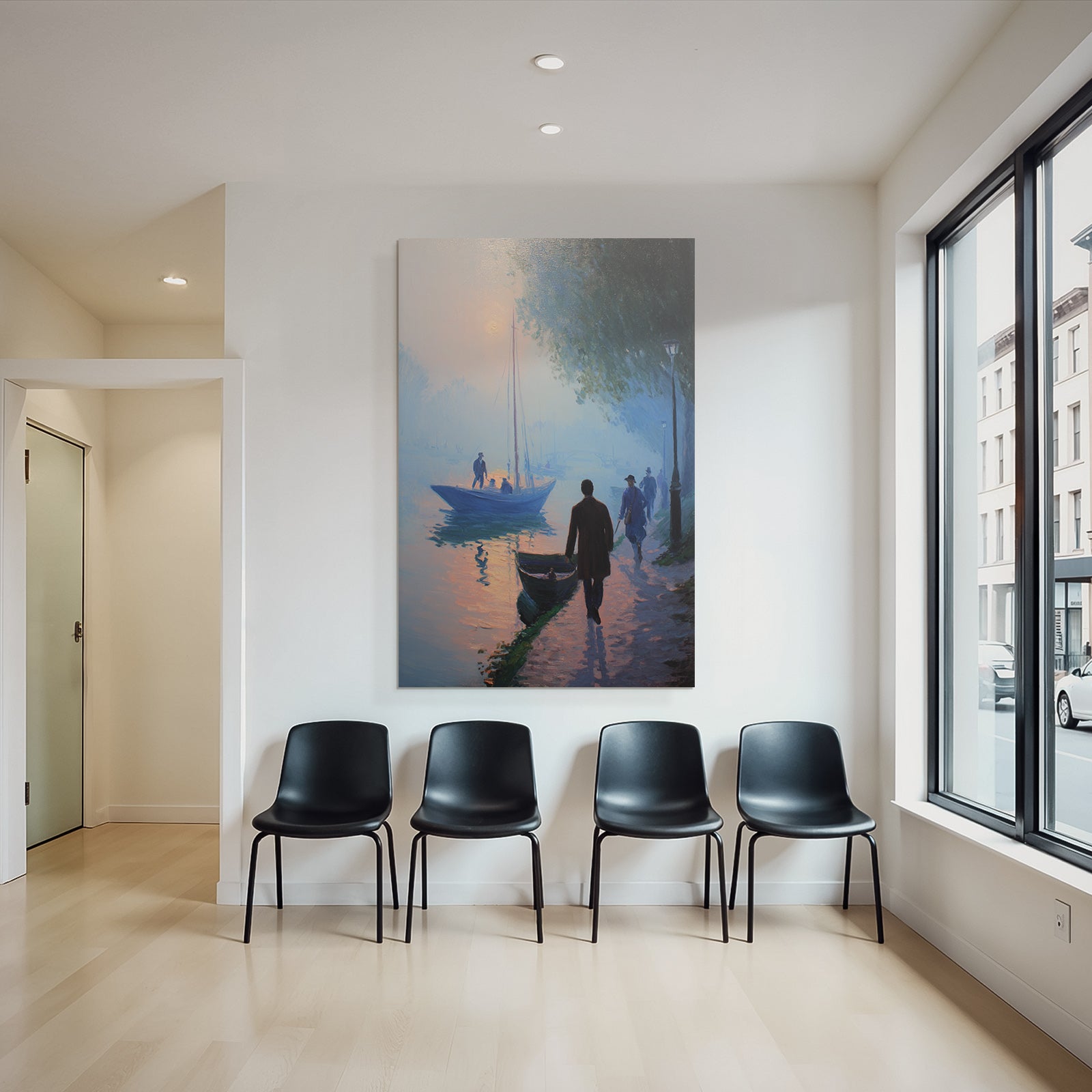 Die Kombination aus dem Motiv „Impressionistische Wasserlandschaft Mit Booten Und Nebel“ und dem Stil Jugendstil schafft eine Brücke zwischen Klassik und Moderne. Der FameFrame™ vollendet dieses Zusammenspiel perfekt.