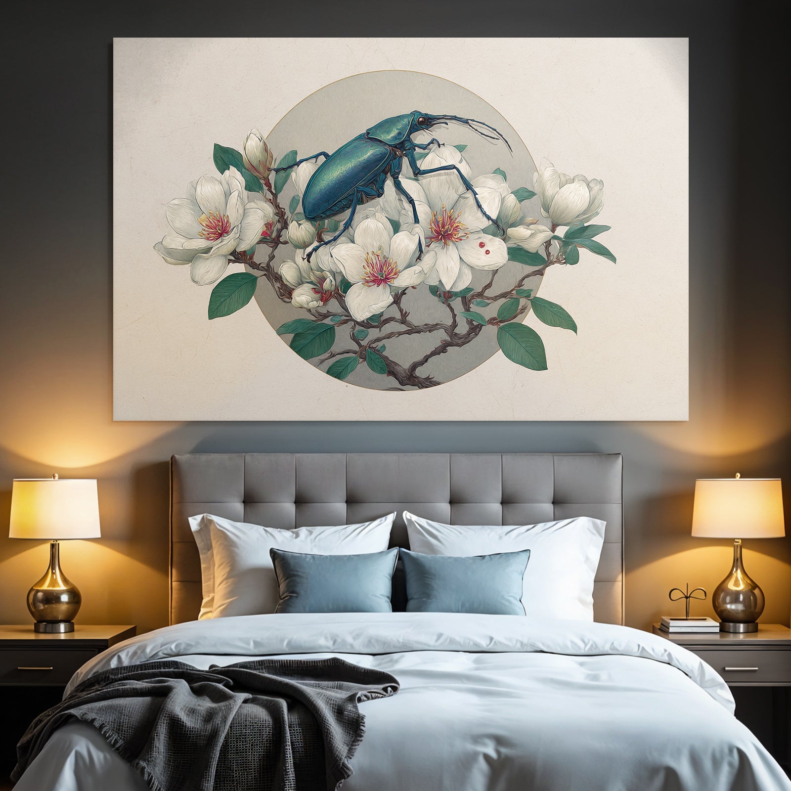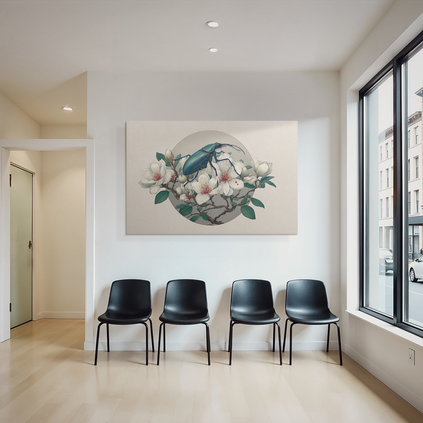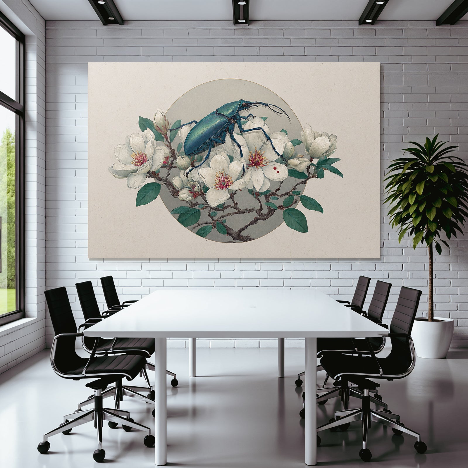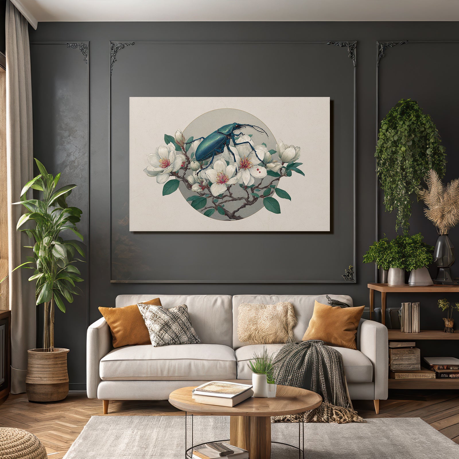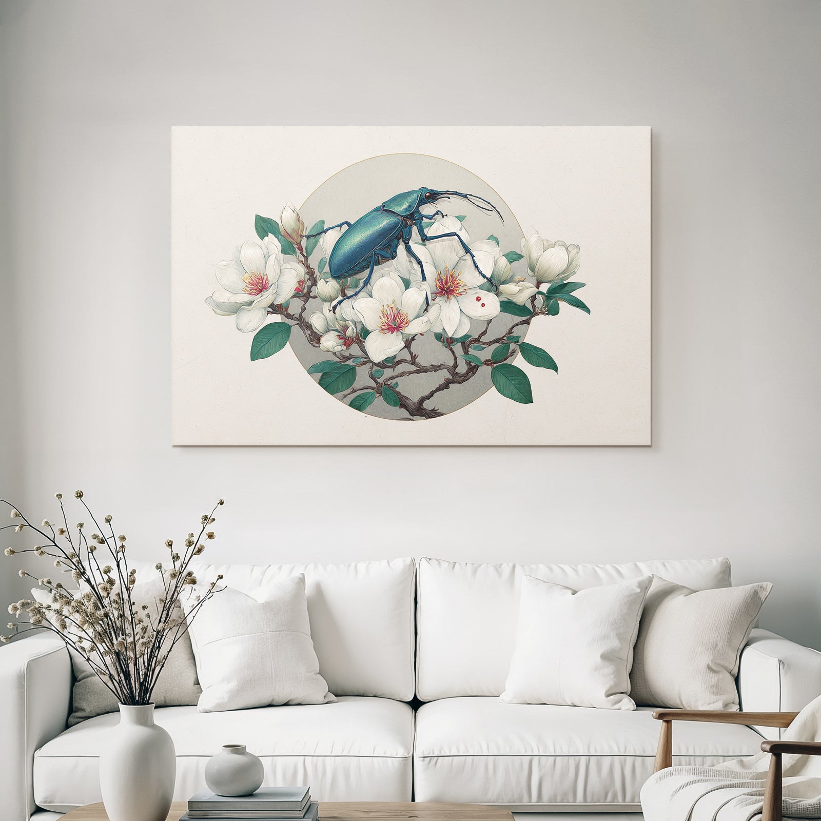 Erlebe Kunst im Stil Collagen neu: „„Kaefer Auf Zweig Mit Weissen Blueten““ wird durch den eleganten FameFrame zum Blickfang in jedem Raum.