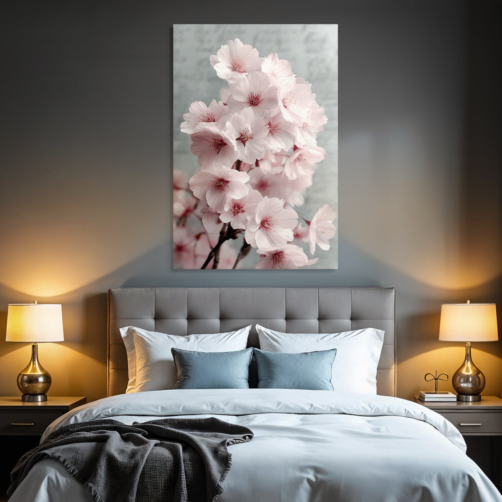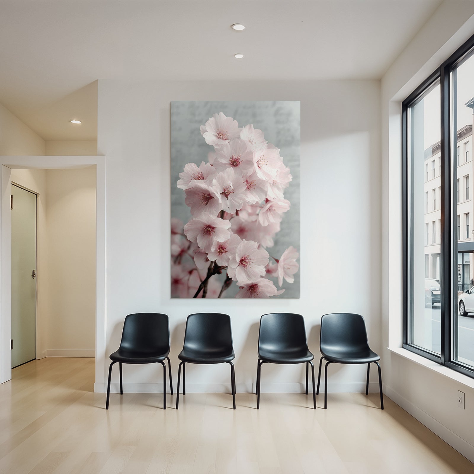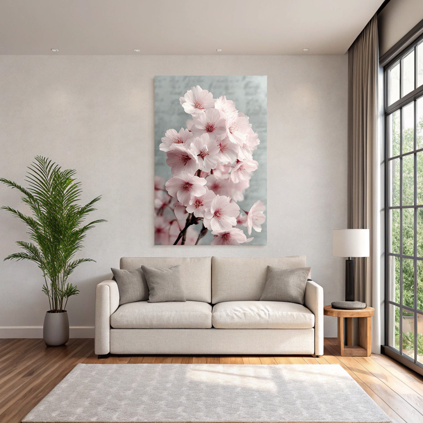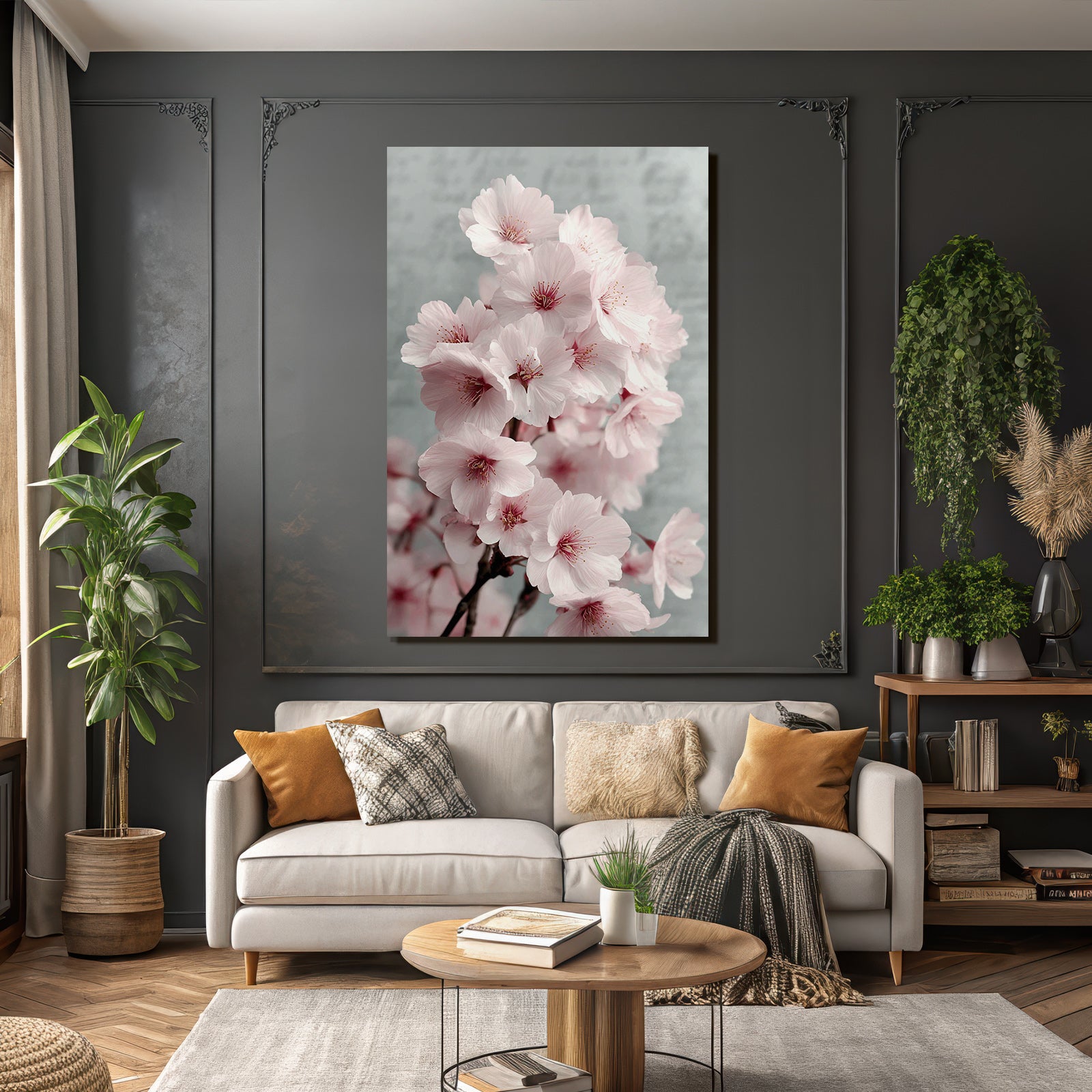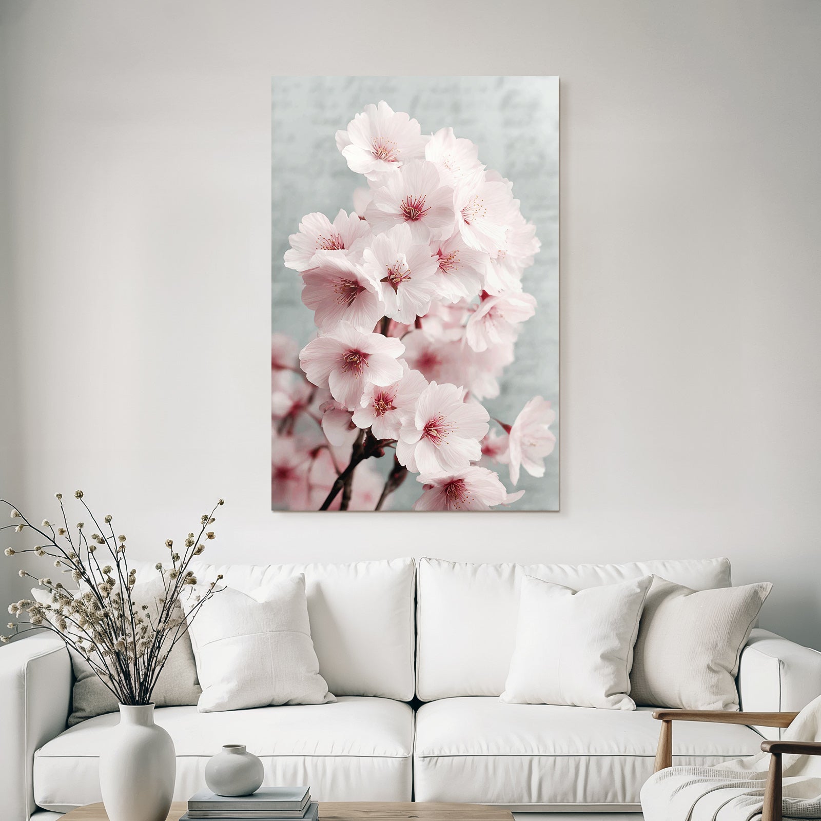 Ein Highlight für Wohnzimmer, Studio oder Empfangsbereich: „Kirschblüten Im Frühling“ bringt den Stil Japanische Zierkirsche auf Stoff – gespannt im edlen FameFrame.