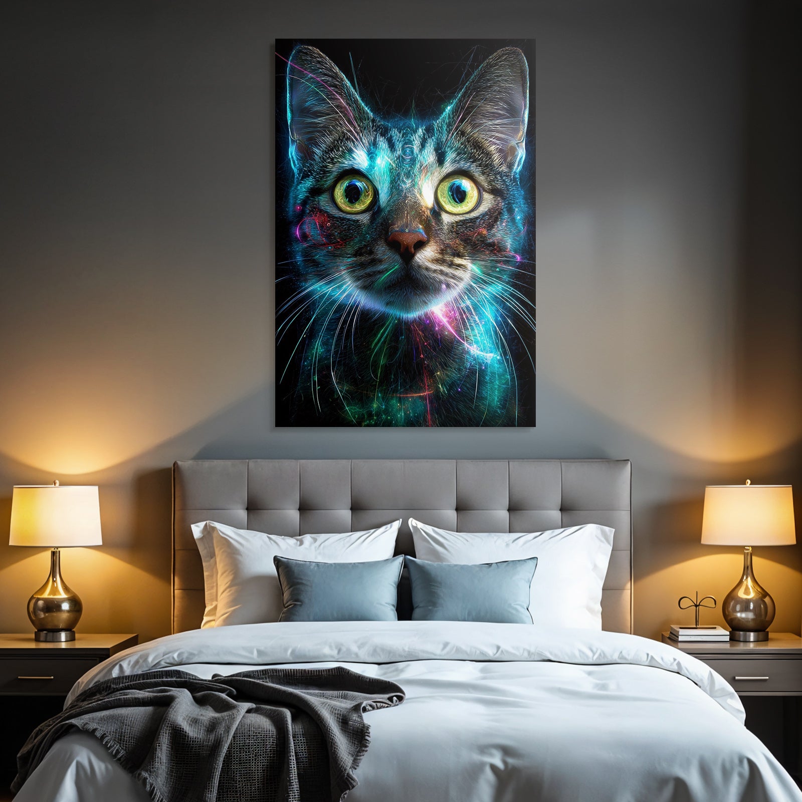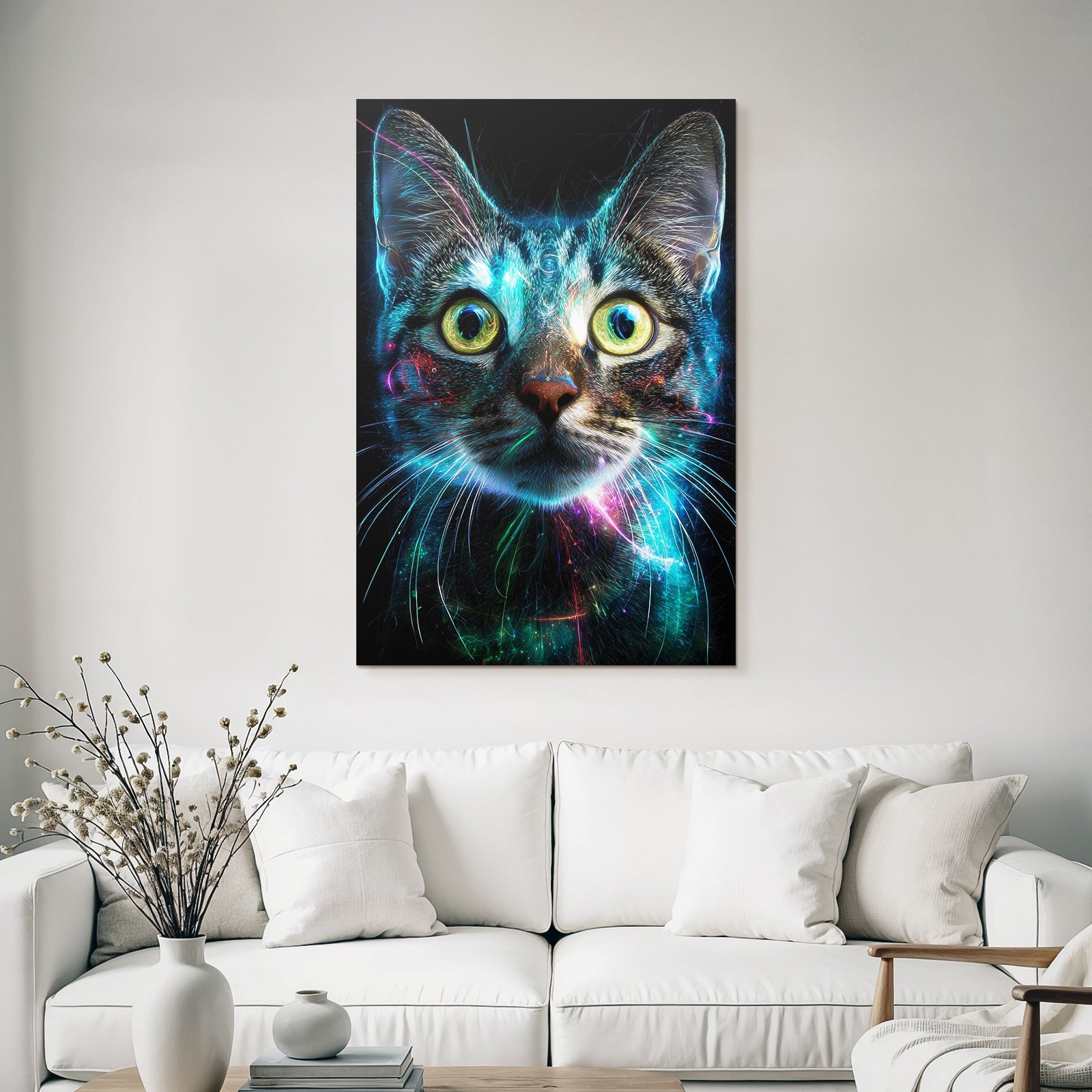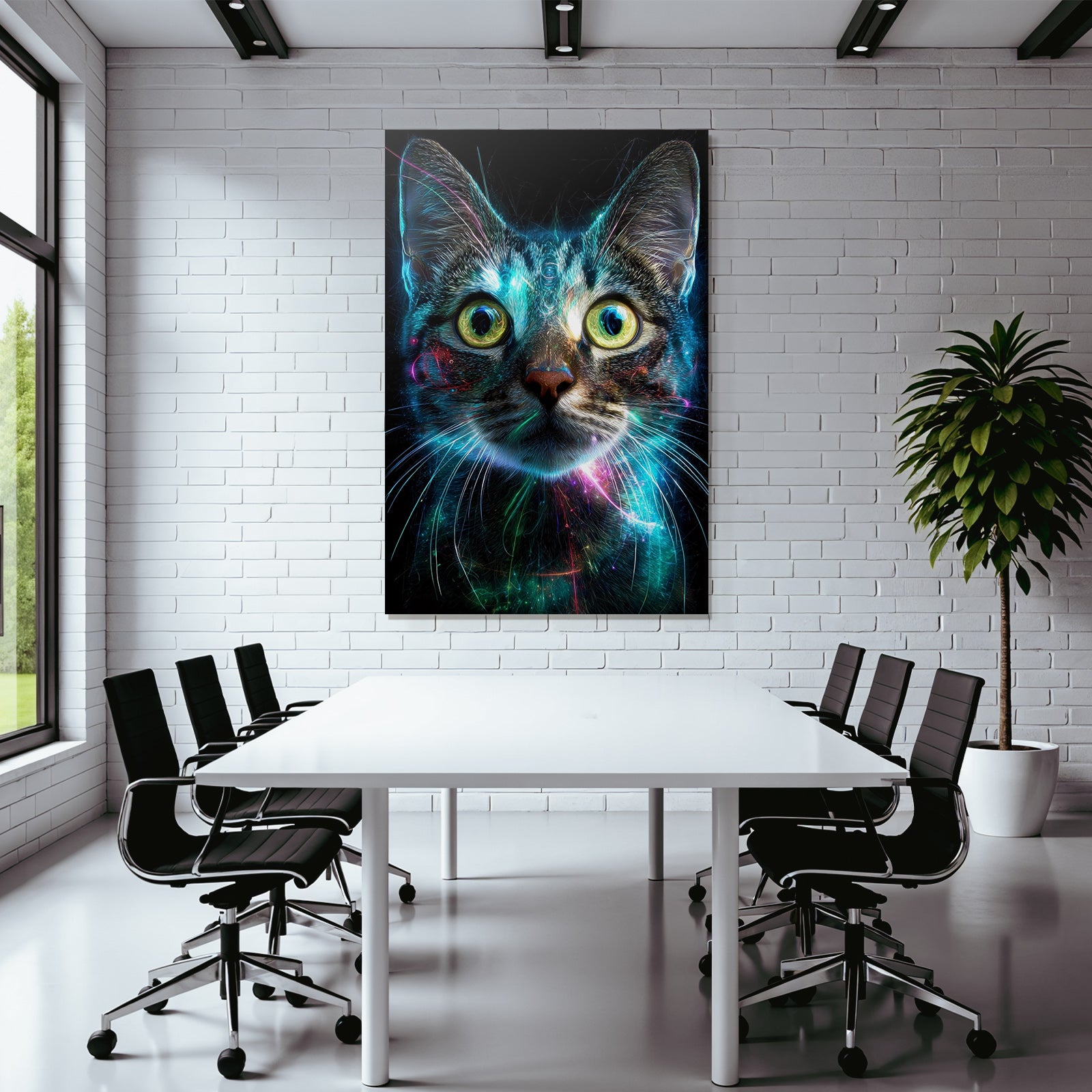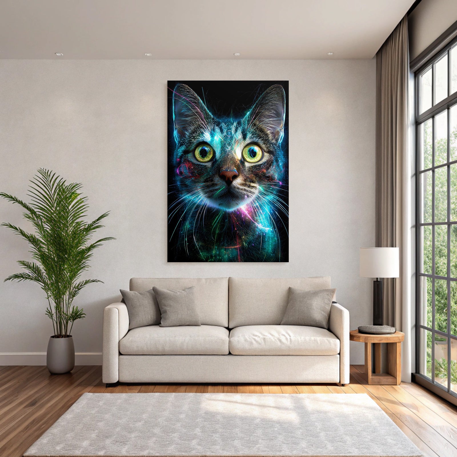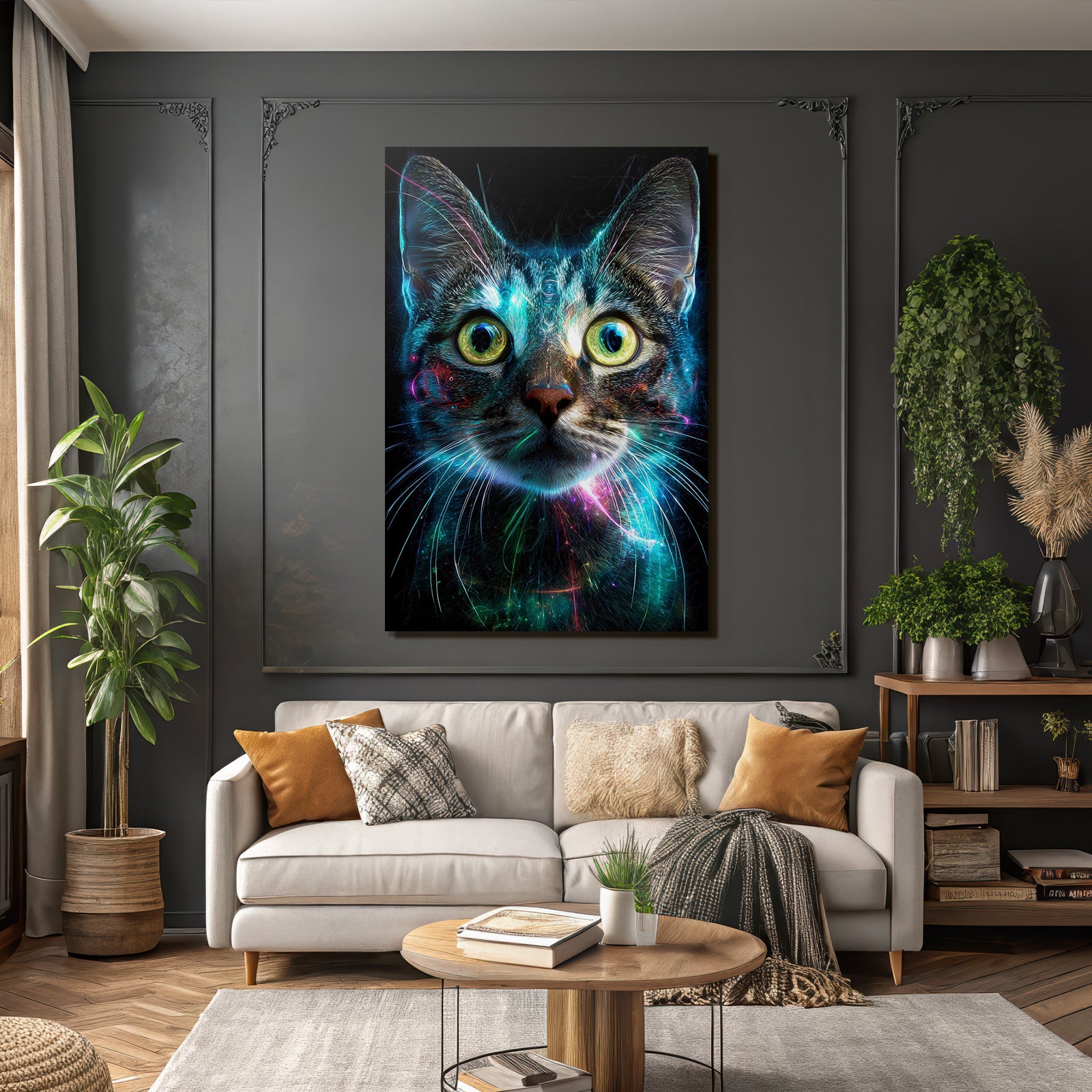 Mit Psychedelische Kunst-Elementen und klarer Wirkung verleiht „Kosmischer Katzenkopf Im Fantastischen Glühen“ Deinem Raum Persönlichkeit – eingerahmt im exklusiven FameFrame™.