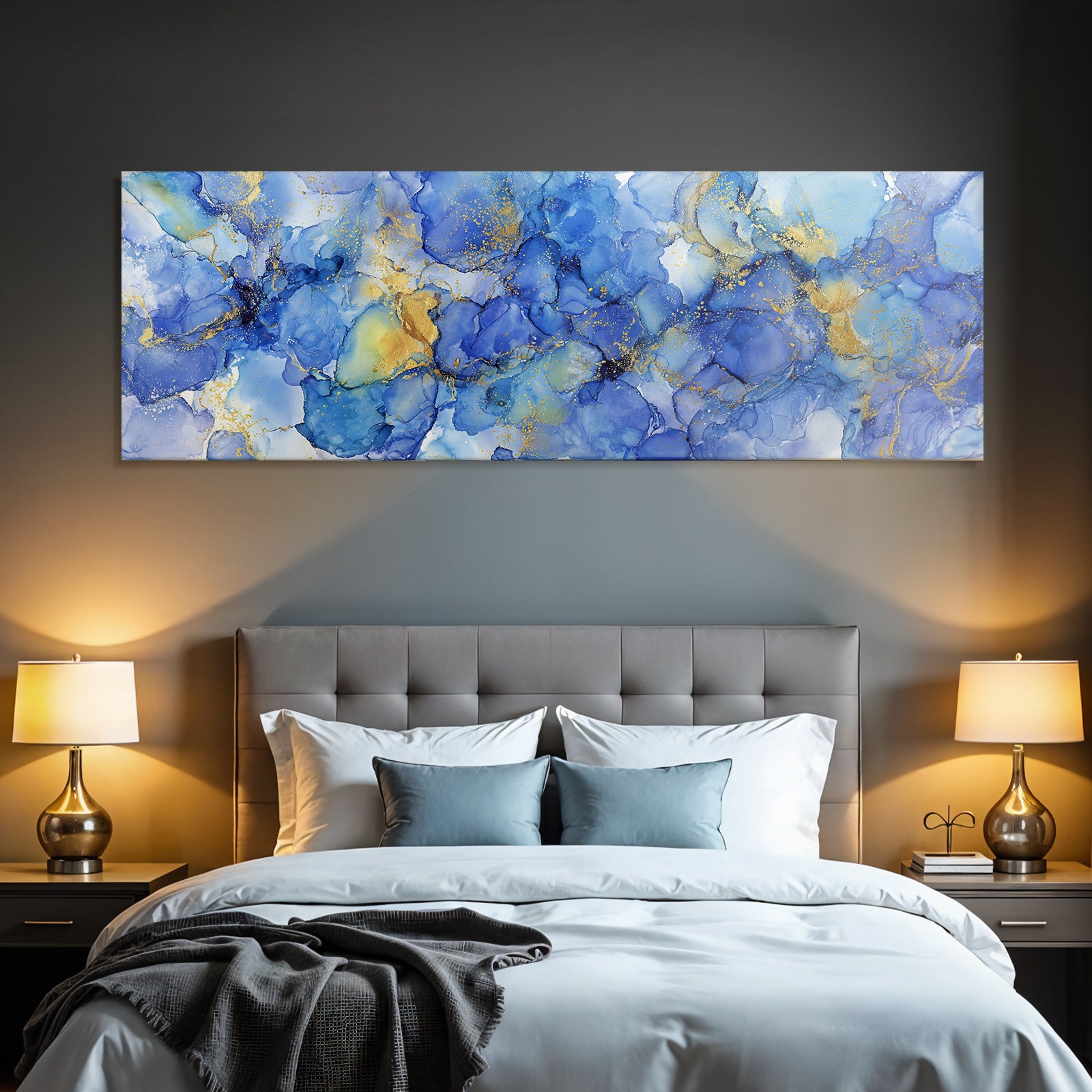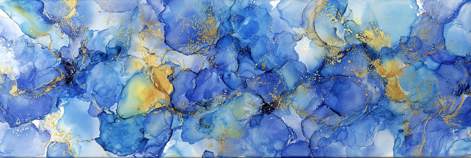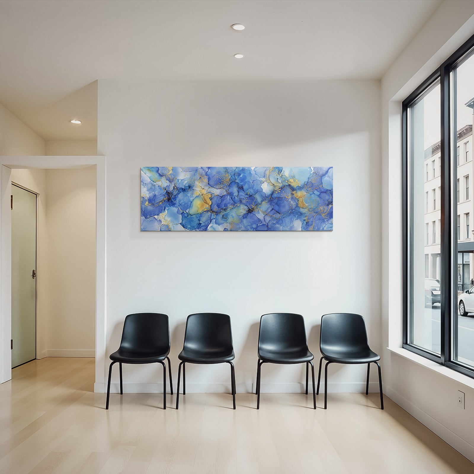 Ein einzigartiges Kunstwerk der Produktlinie FameFrame mit dem Titel „Kunst Mit Blautönen Und Goldakzenten“, im Stil Abstrakt.
