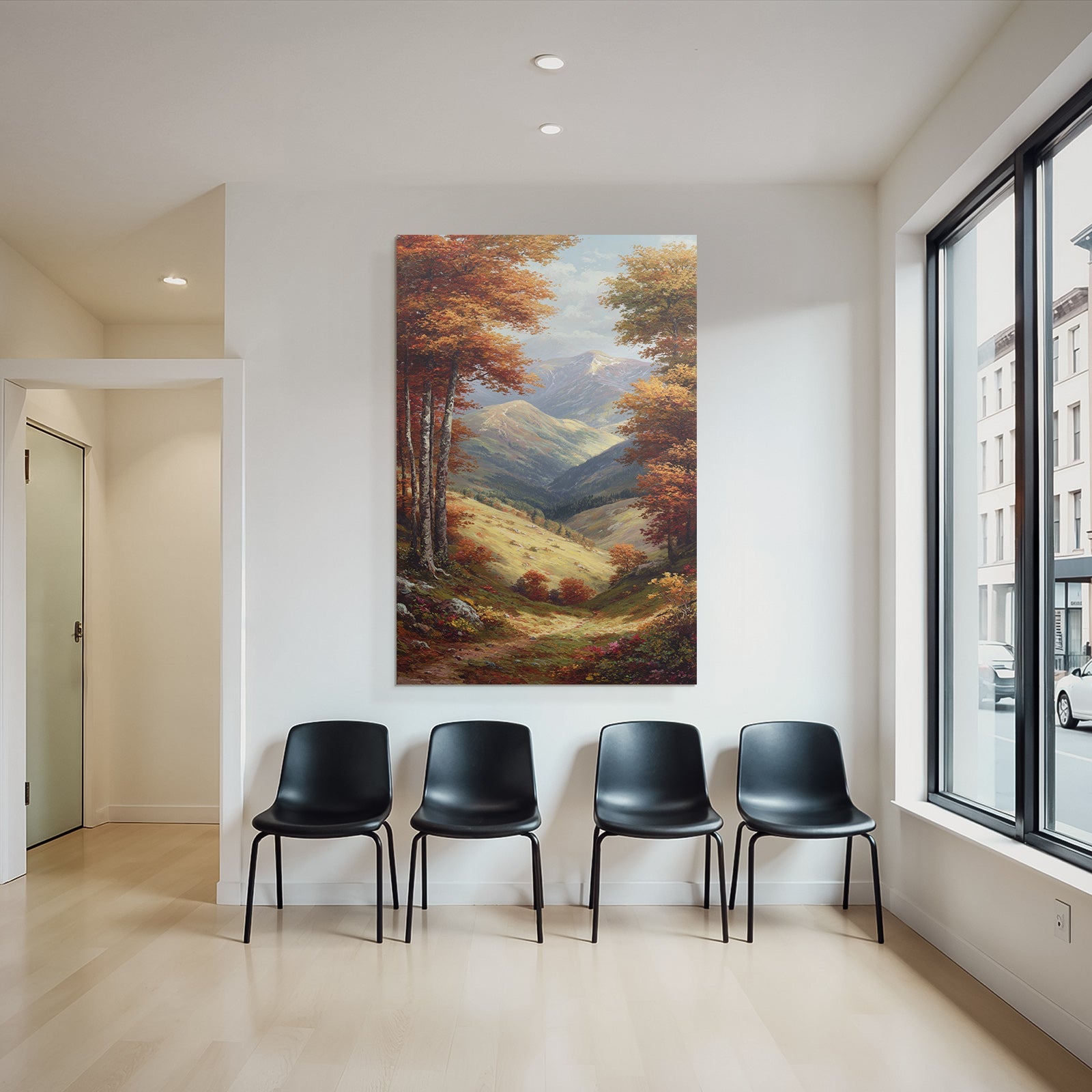 Verwandeln Sie Ihr Schlafzimmer in eine Oase der Ruhe. Das Motiv „Landschaft Mit Bäumen Und Bergen“ im Stil Herbst wirkt im FameFrame besonders harmonisch und beruhigend.