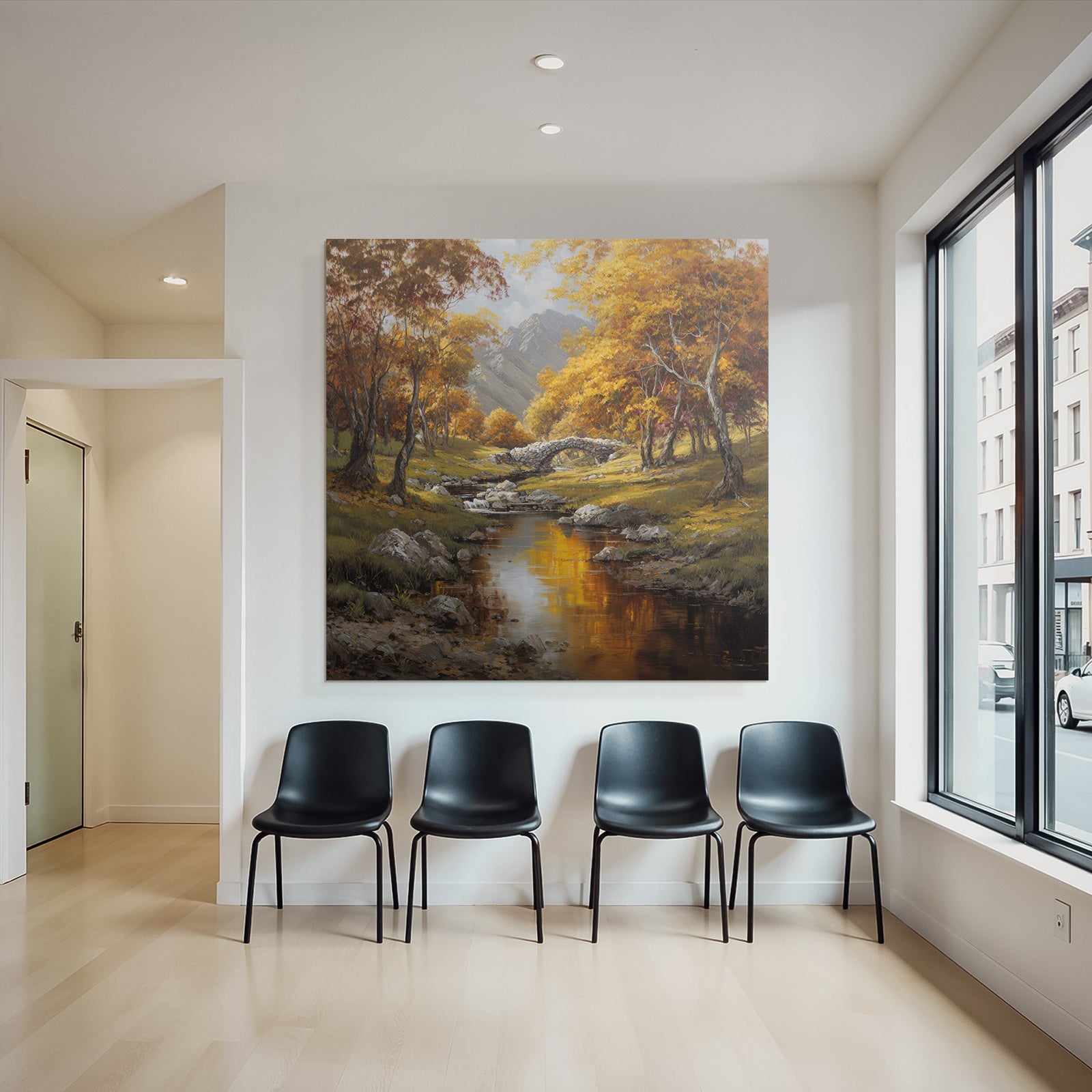 Erlebe Kunst im Stil Herbst neu: „Landschaft Mit Fluss Und Brücke“ wird durch den eleganten FameFrame zum Blickfang in jedem Raum.