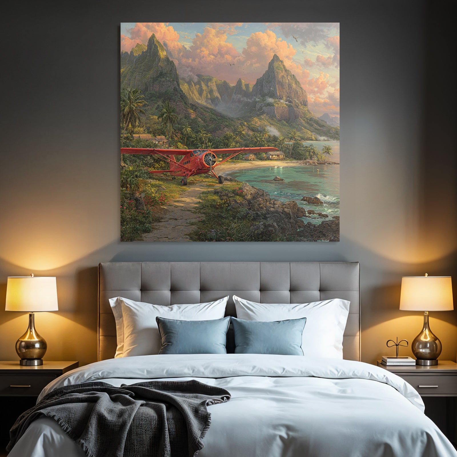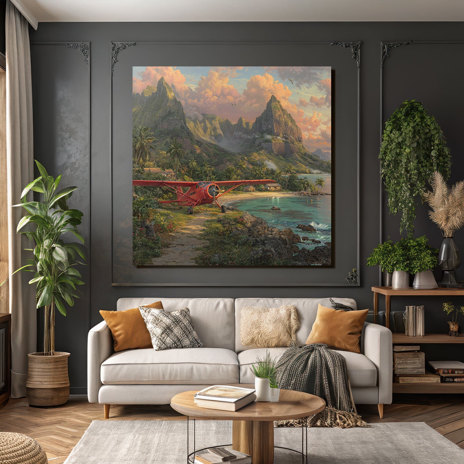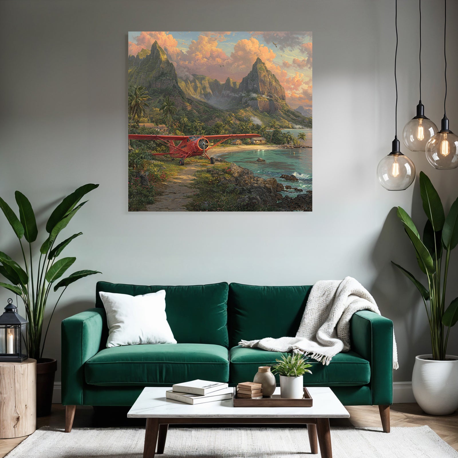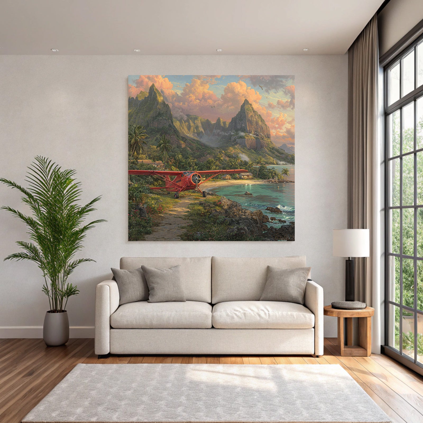Setz ein Statement: „Lebensgrosse Rotes Flugzeug Und Schöne Strand Mit Bergen Unter Bunten Himmel“ im Stil Flugzeuge wird im FameFrame™ zum echten Kunstobjekt an Deiner Wand.