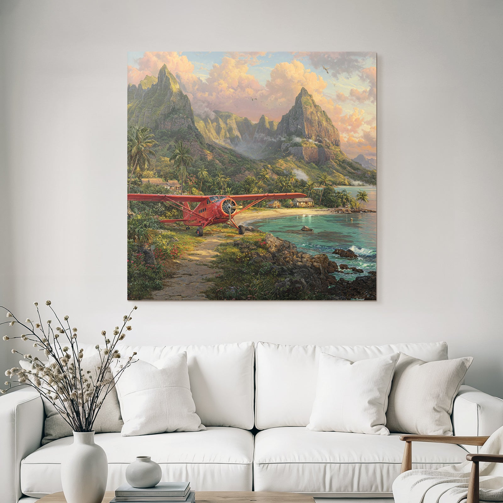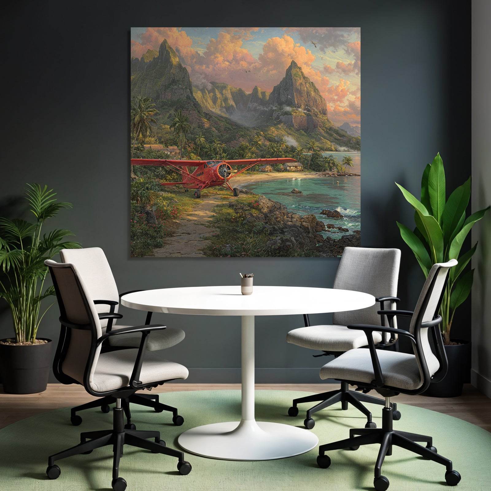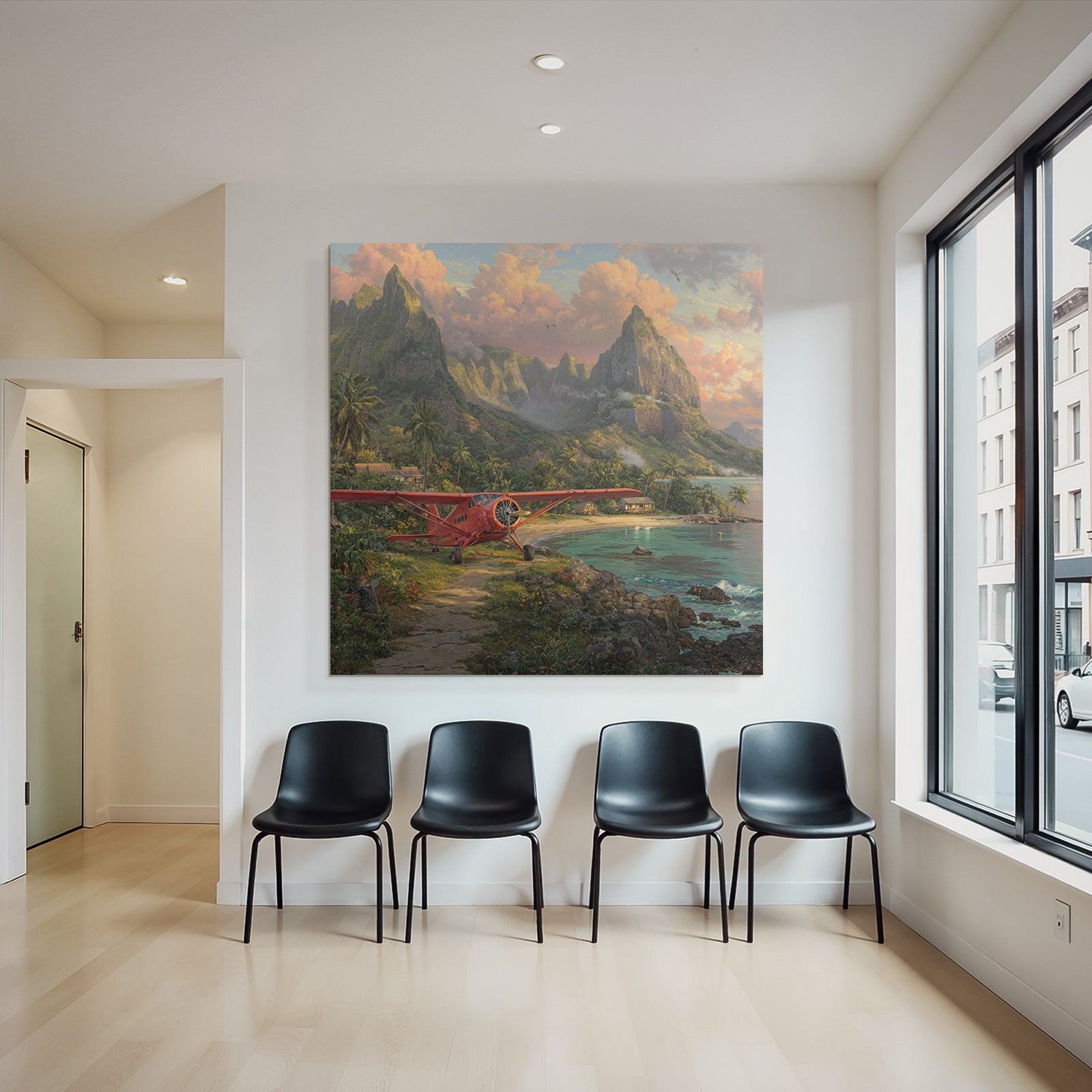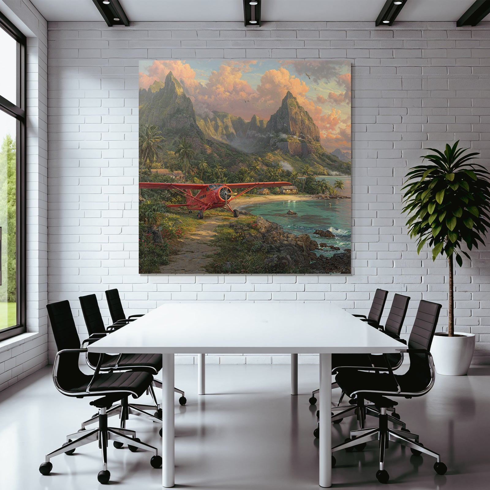 Setz ein Statement: „Lebensgrosse Rotes Flugzeug Und Schöne Strand Mit Bergen Unter Bunten Himmel“ im Stil Flugzeuge wird im FameFrame™ zum echten Kunstobjekt an Deiner Wand.