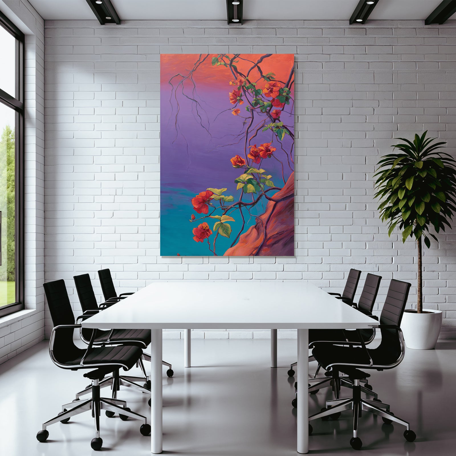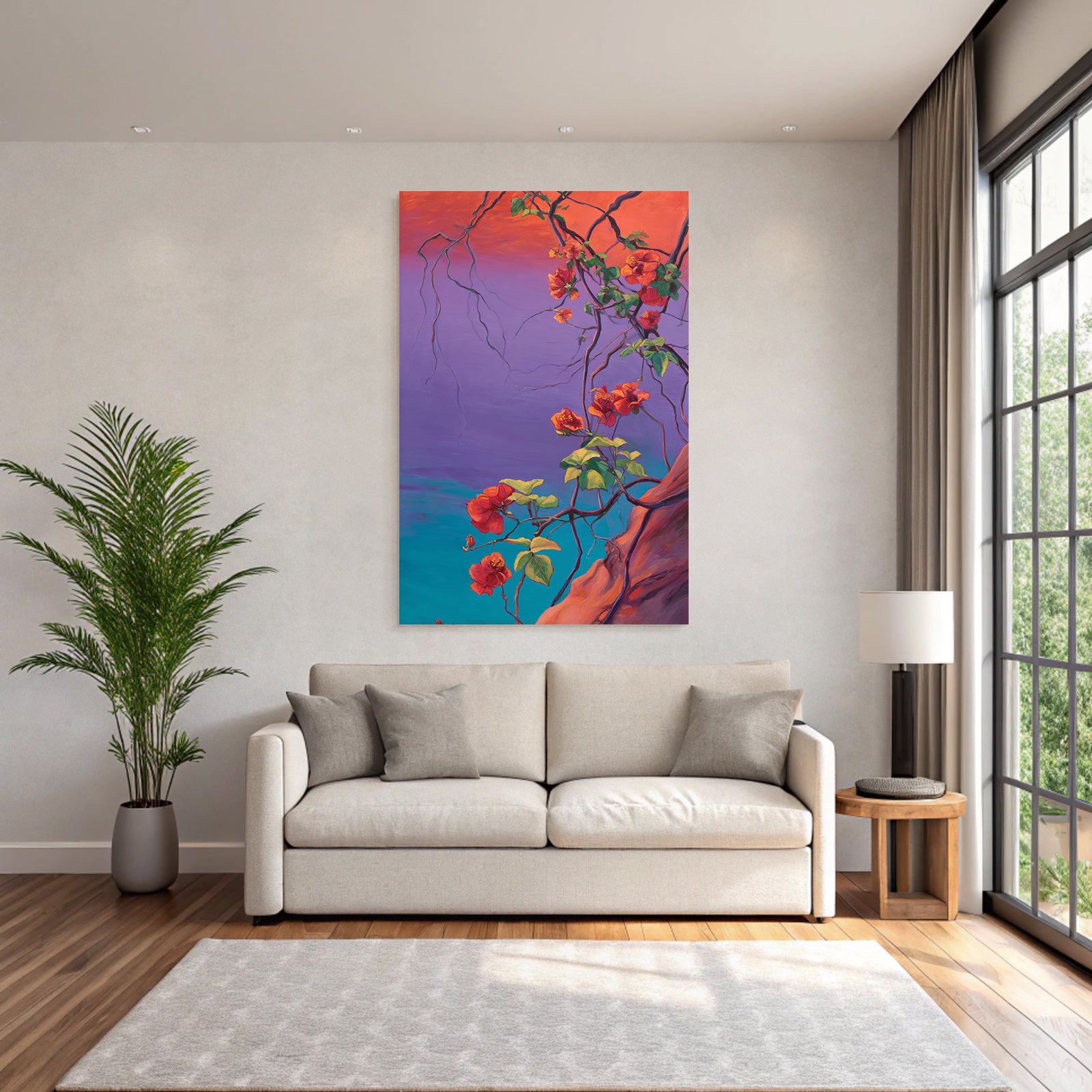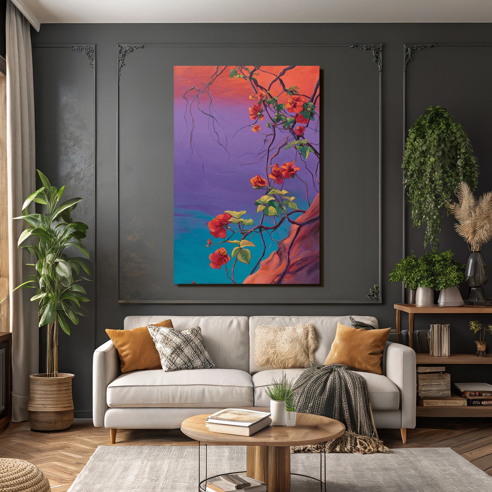 Wenn Sie den Expressionismus-Look schätzen, werden Sie „Leuchtende Bougainvillea Im Stilisierten Tropischen Garten“ lieben. Im exklusiven FameFrame™ wird dieses Motiv zum zentralen Element Ihrer Raumgestaltung.