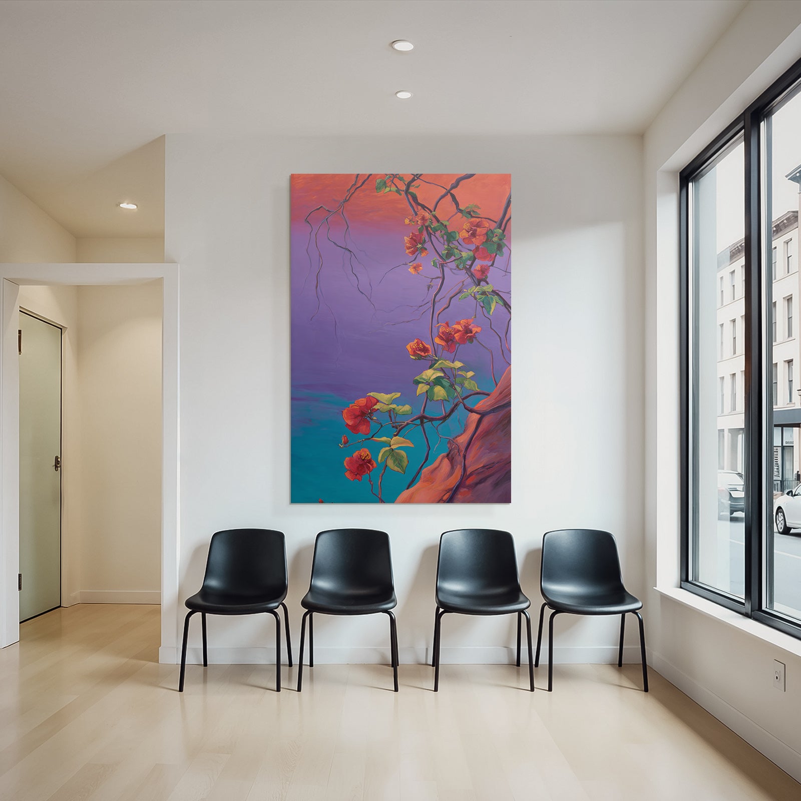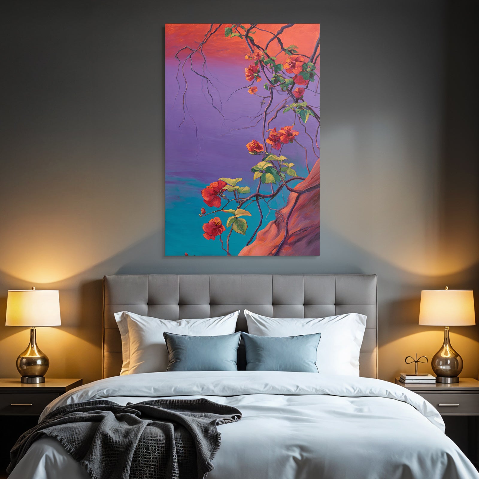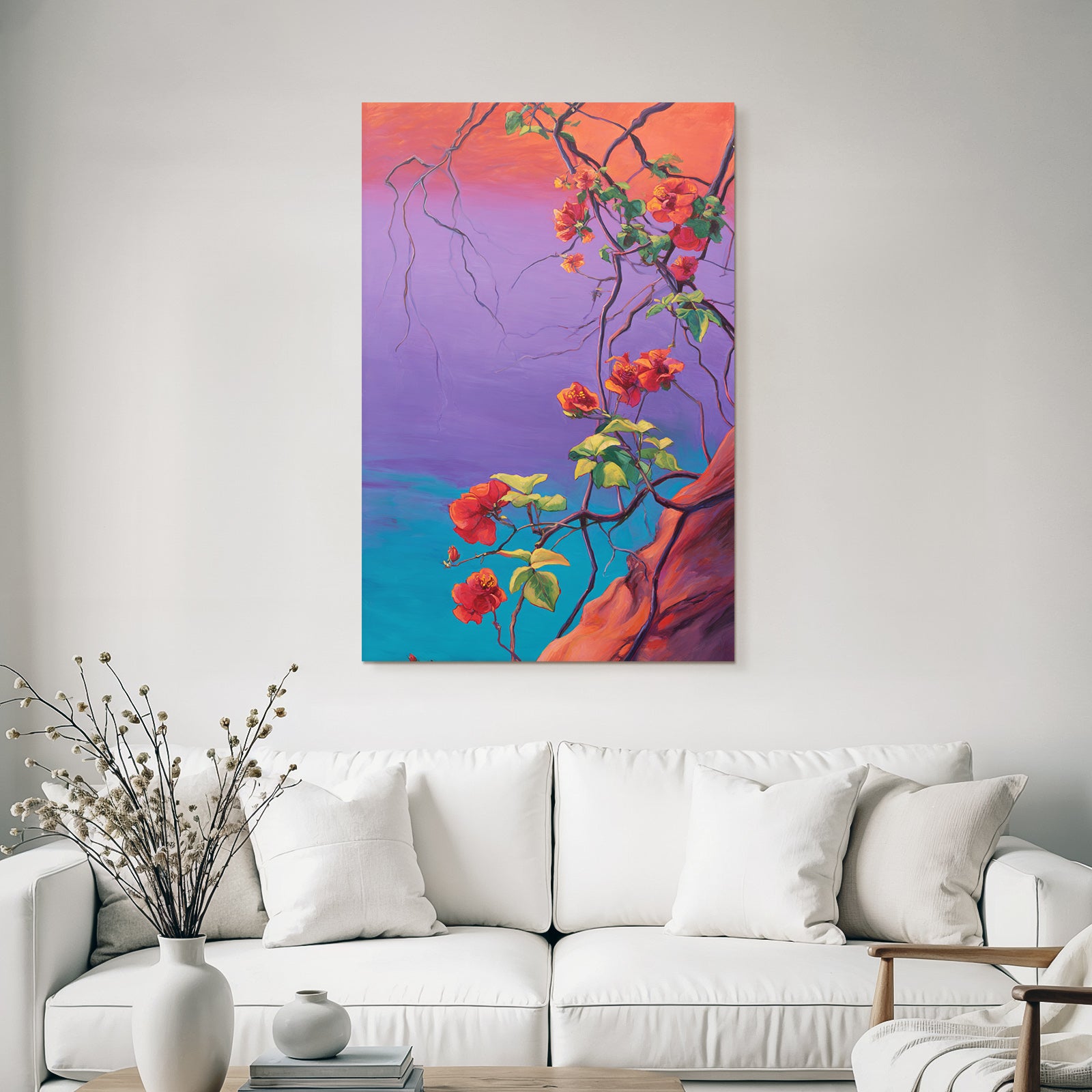 Wenn Sie den Expressionismus-Look schätzen, werden Sie „Leuchtende Bougainvillea Im Stilisierten Tropischen Garten“ lieben. Im exklusiven FameFrame™ wird dieses Motiv zum zentralen Element Ihrer Raumgestaltung.
