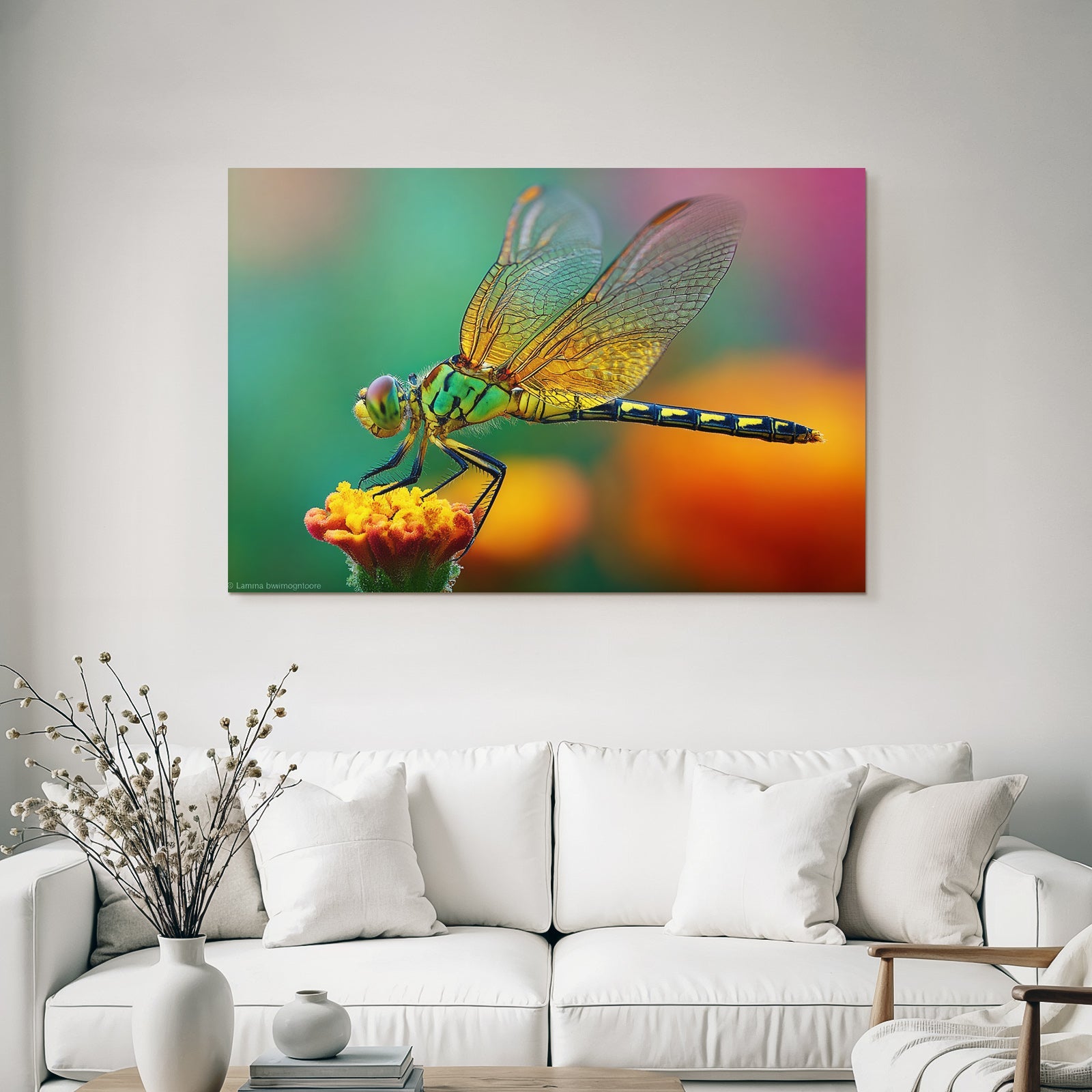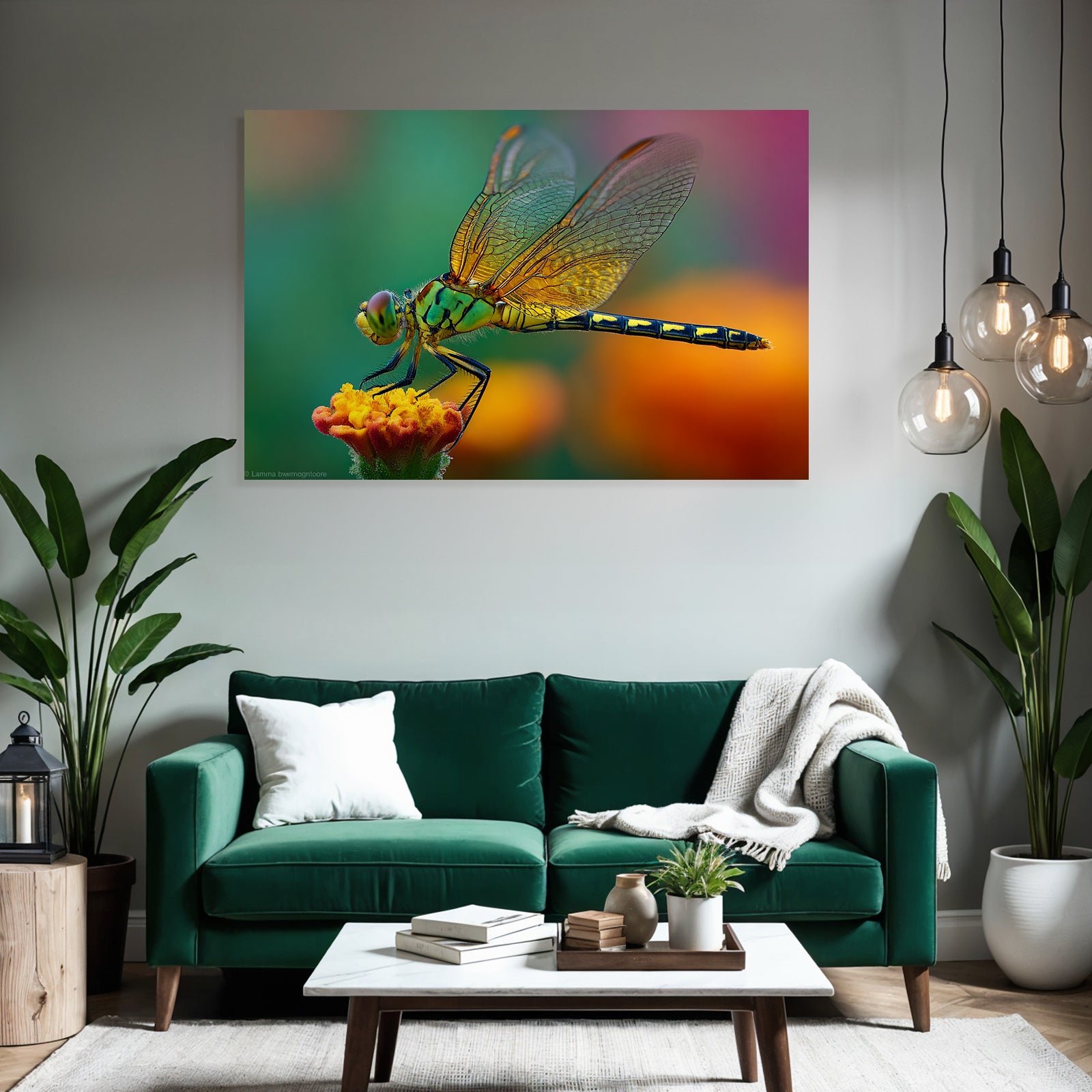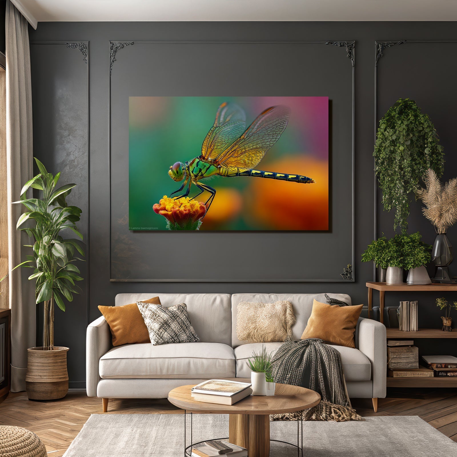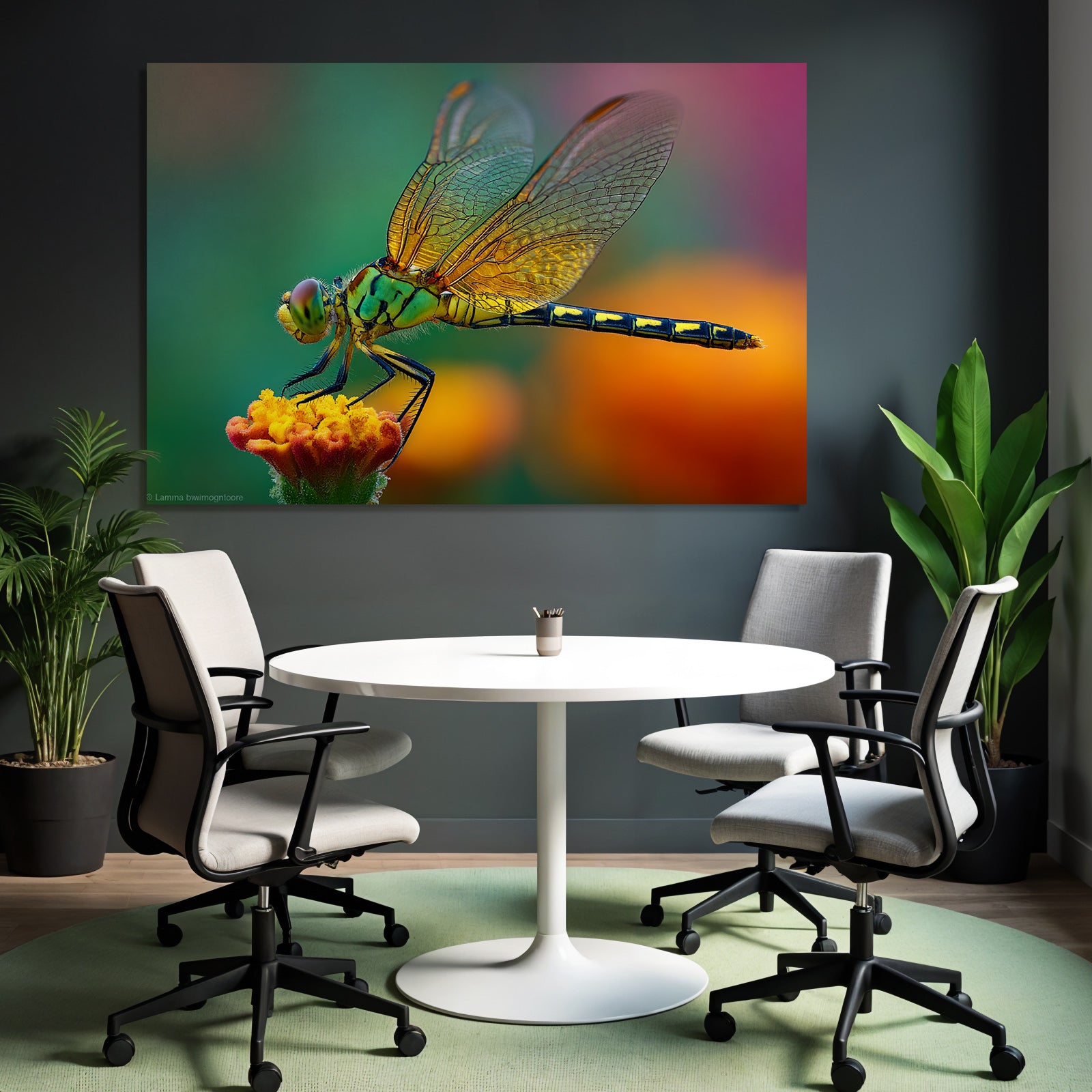 Mach mehr aus Deinem Wohnbereich oder Besprechungszimmer – „Libelle Blume Nahaufnahme“ im Stil Insekten und Amphibien überzeugt als eleganter Textildruck im FameFrame.