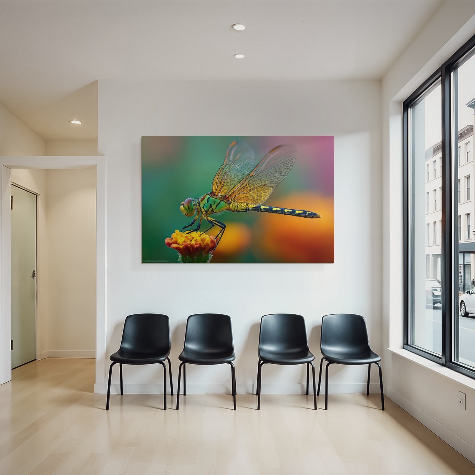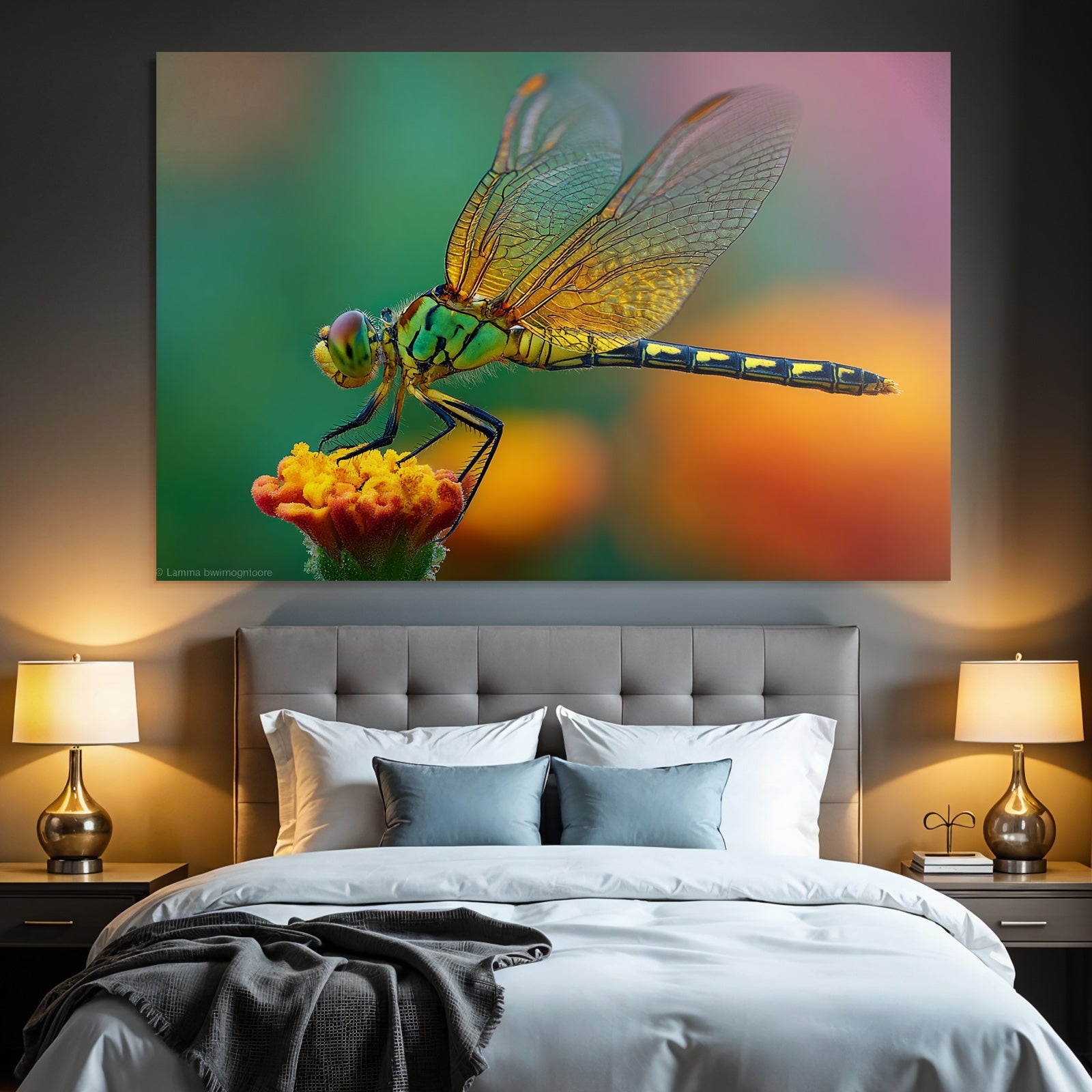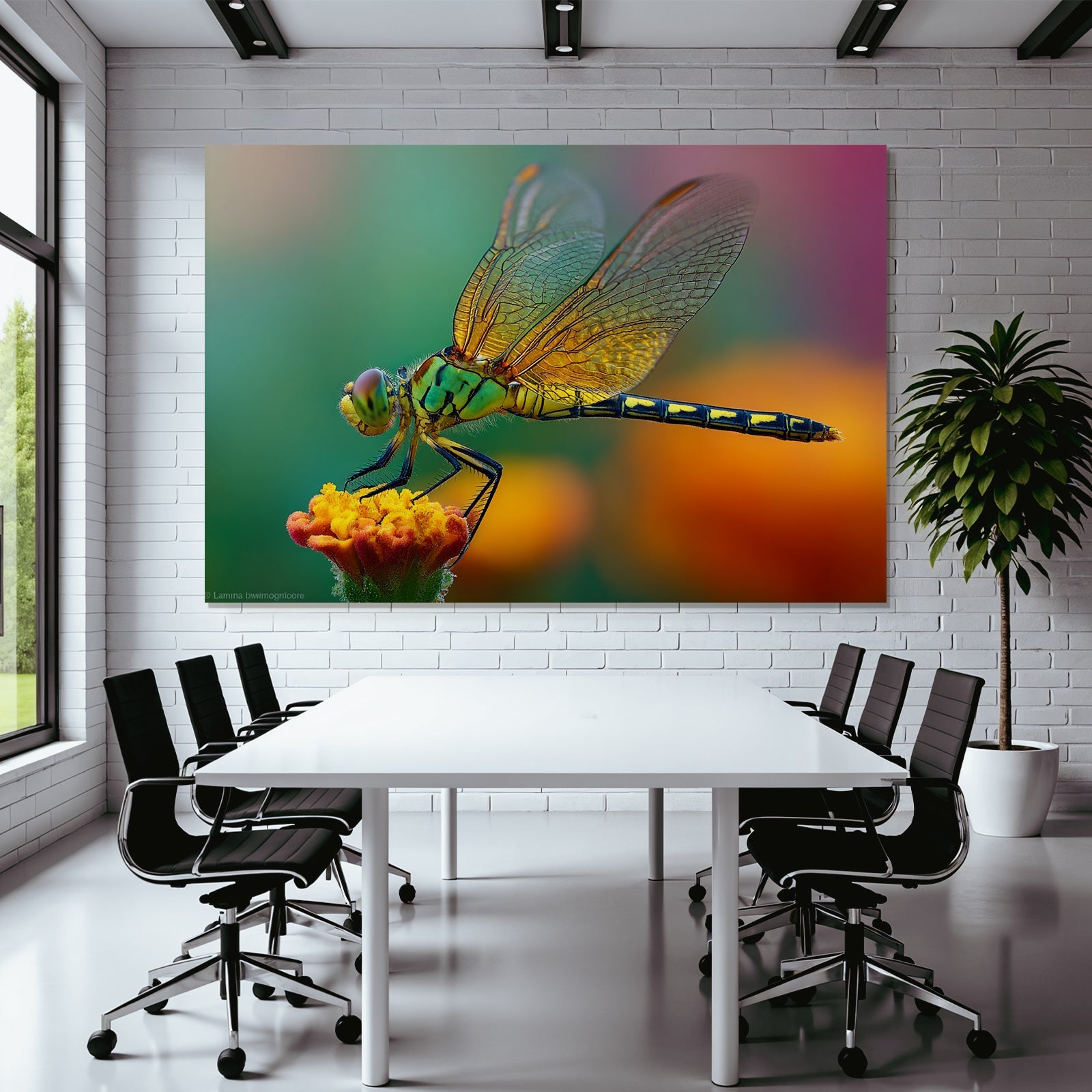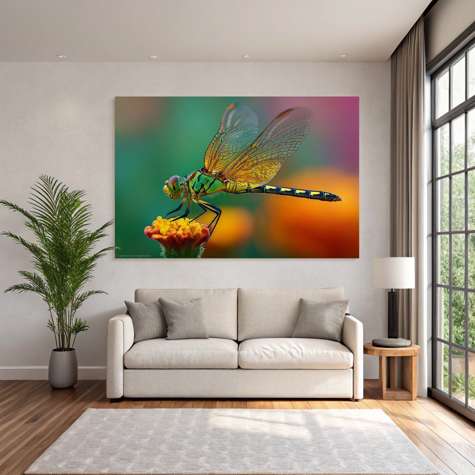 Mach mehr aus Deinem Wohnbereich oder Besprechungszimmer – „Libelle Blume Nahaufnahme“ im Stil Insekten und Amphibien überzeugt als eleganter Textildruck im FameFrame.