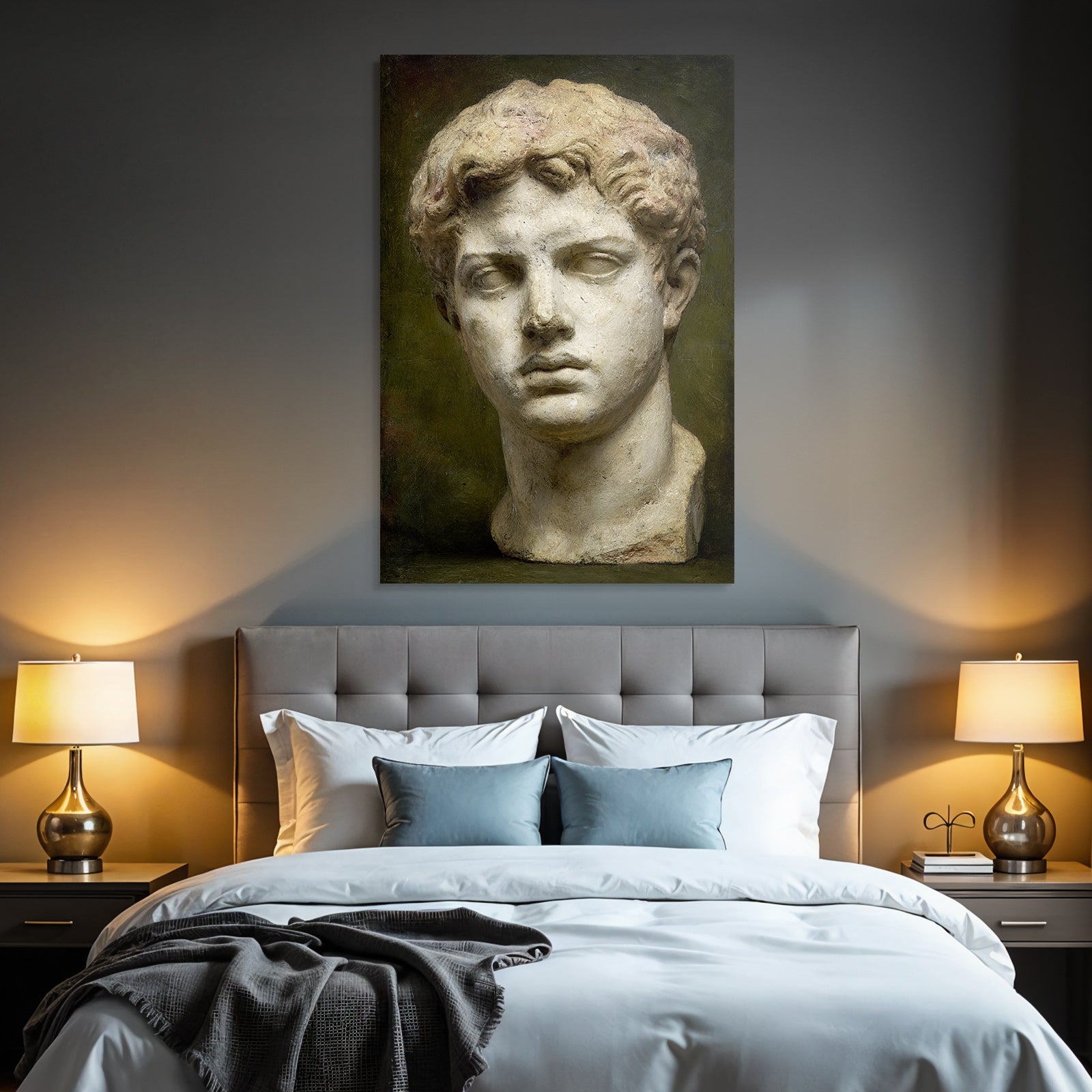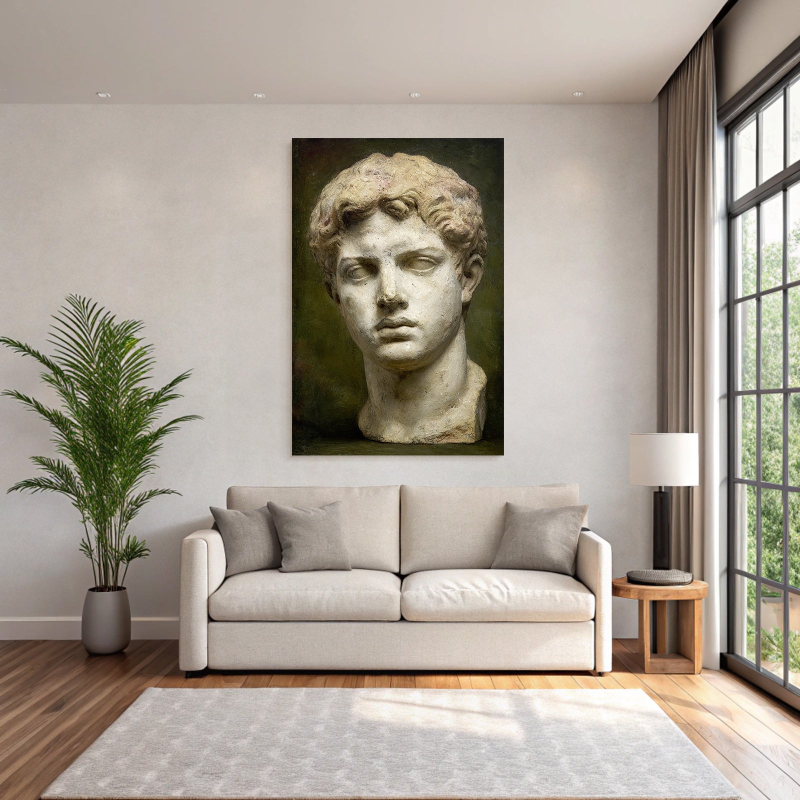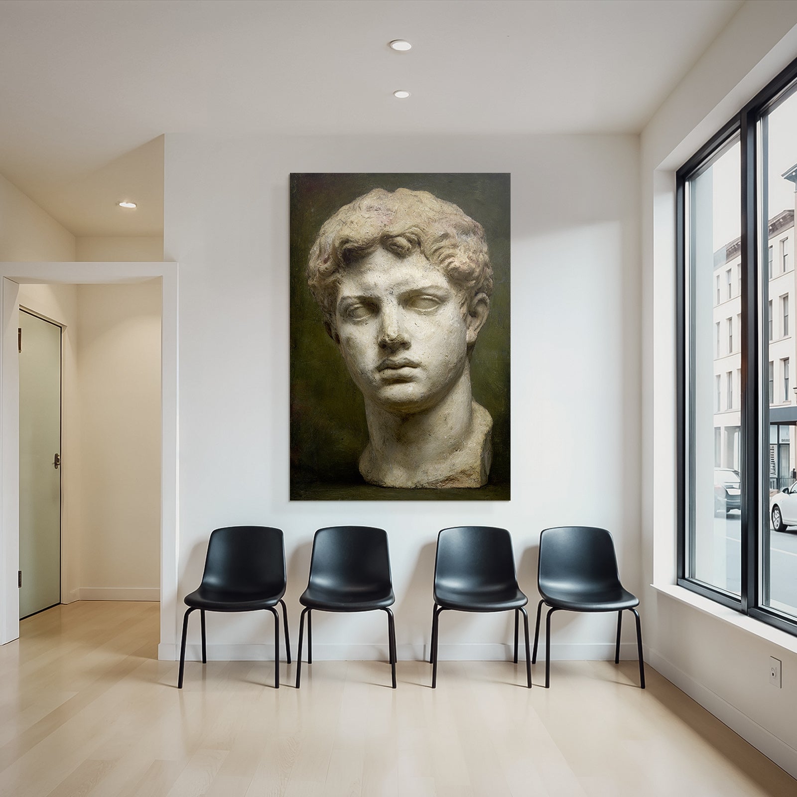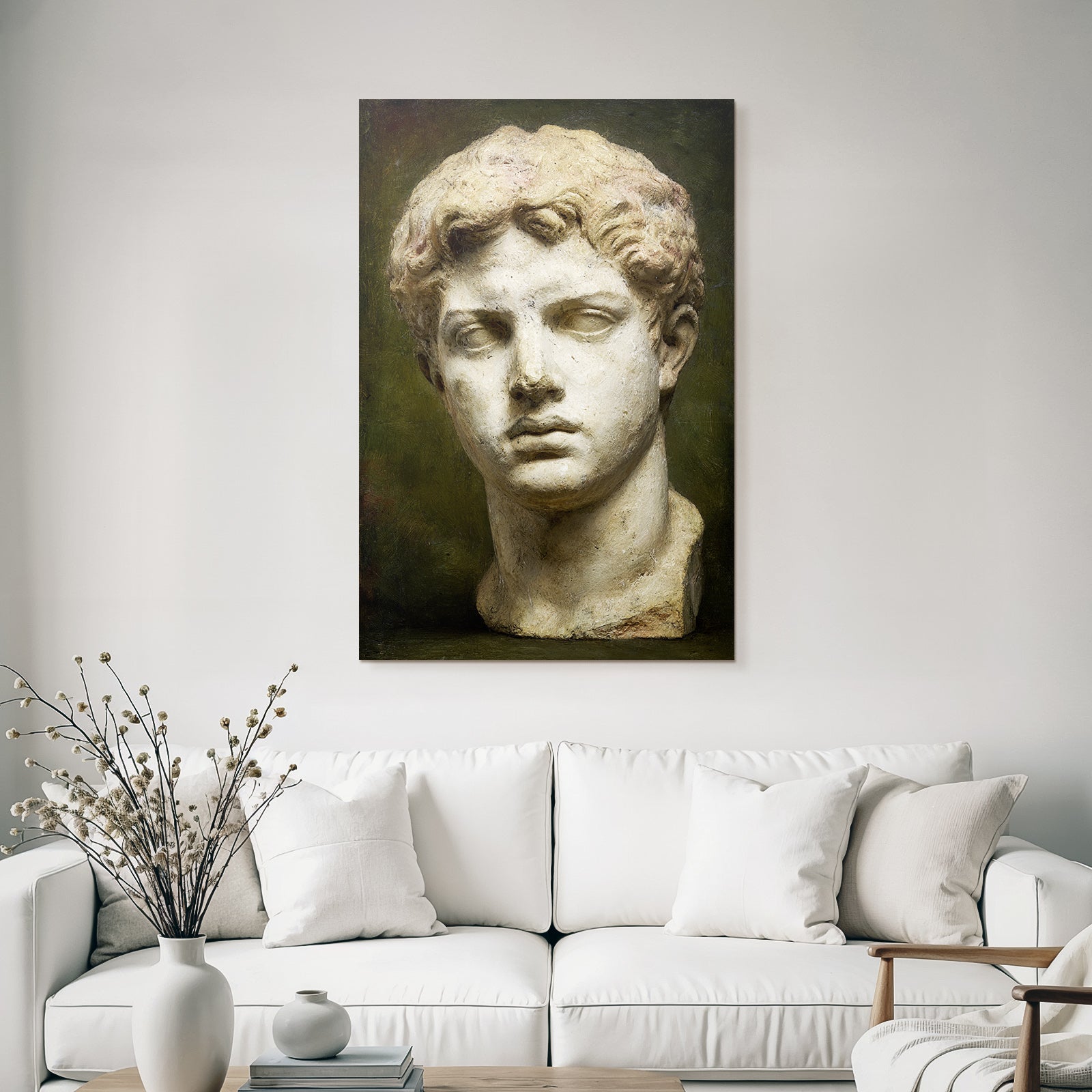 Ob Flur, Wohnraum oder Wartebereich – das Motiv „„Maennlicher Kopf E Skulptur Antische Kunst““ im Stil Klassisch wirkt durch den hochwertigen FameFrame besonders modern.