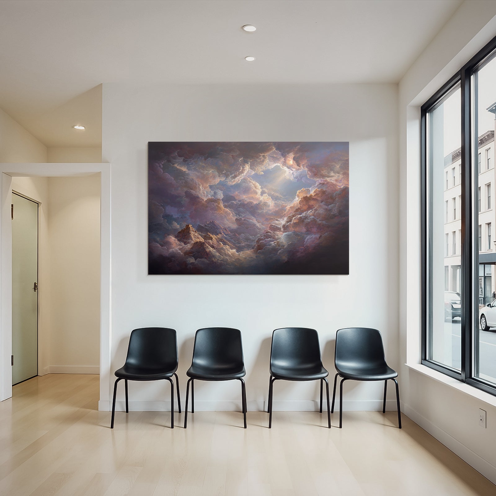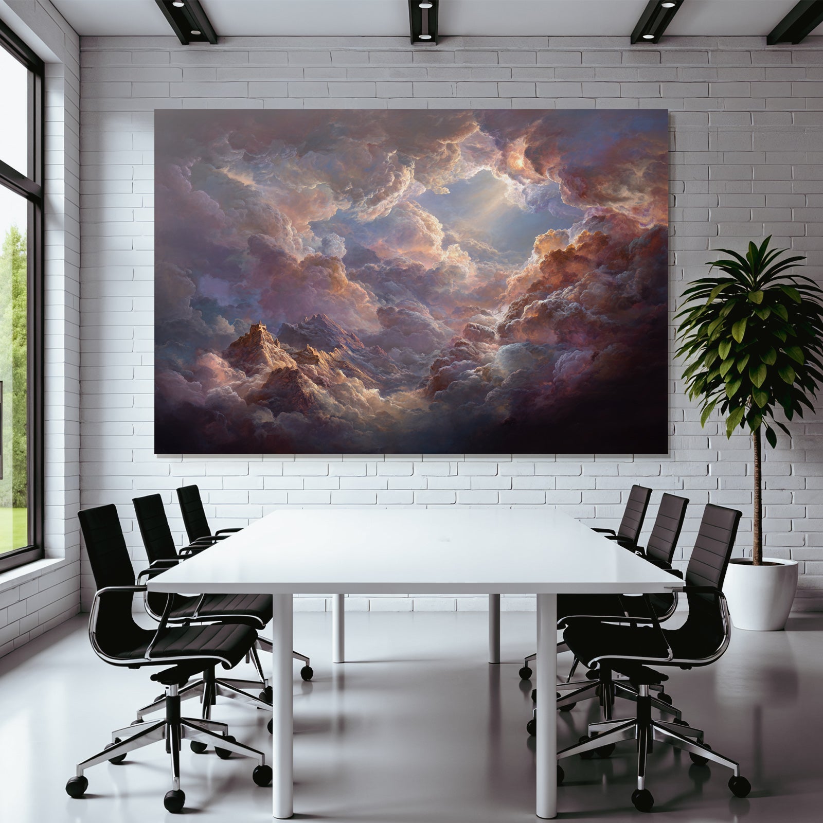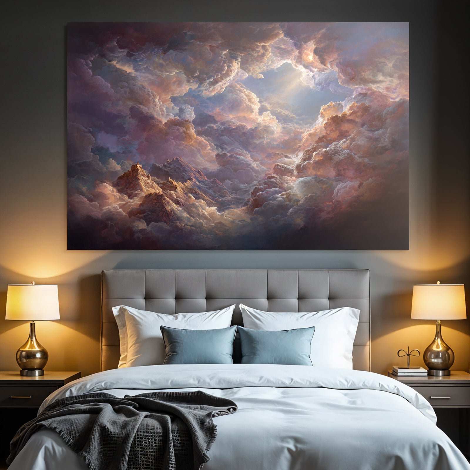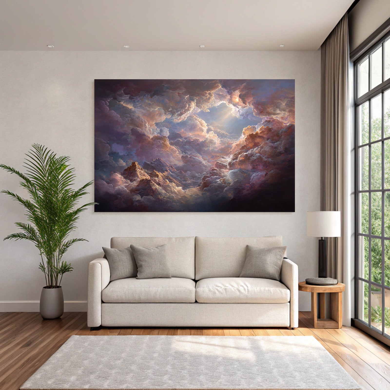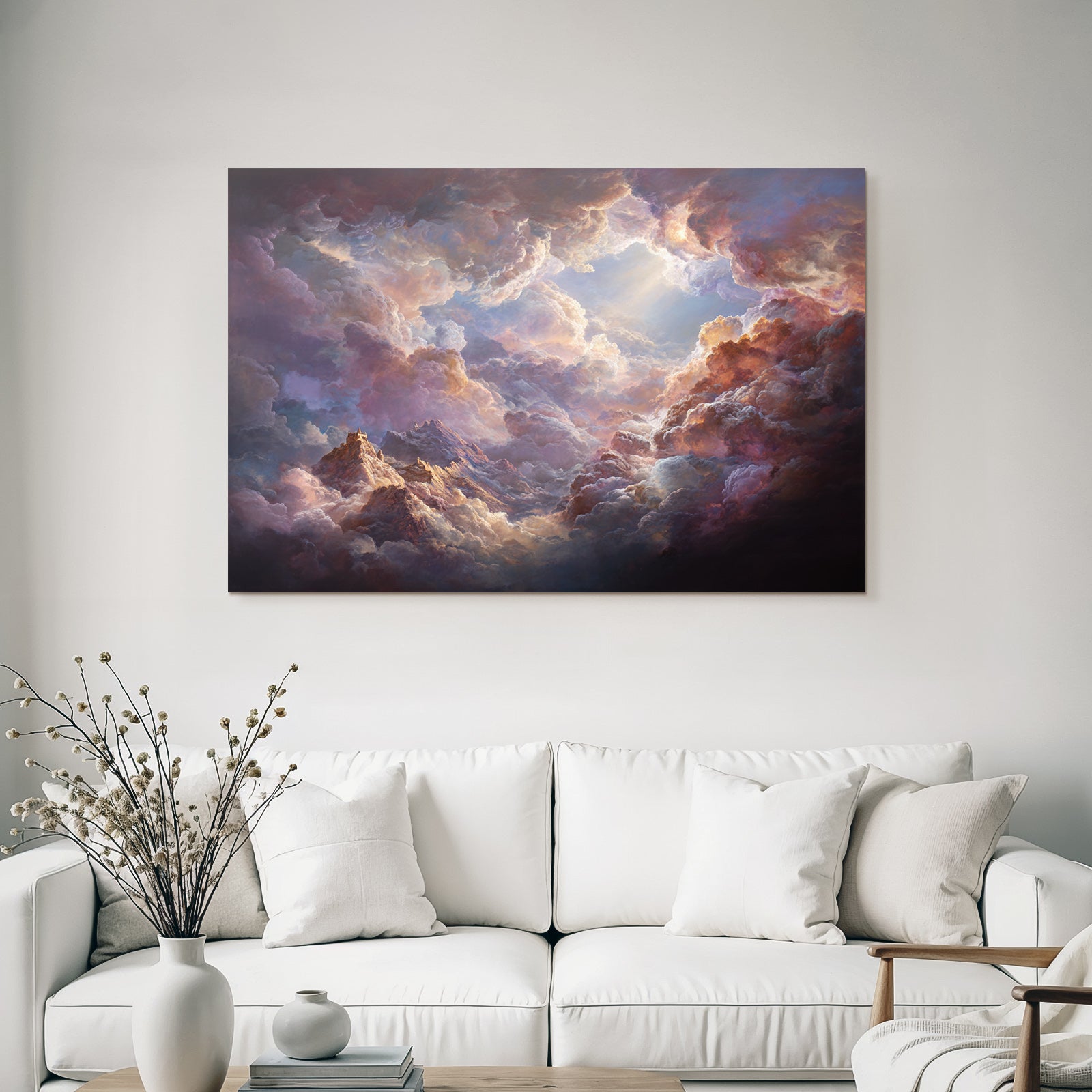 „Magische Himmelsszene Mit Wolkengipfeln“ verleiht Ihrem Raum Charakter. Die Anlehnung an den Stil Himmel und Wolken, kombiniert mit der schlichten Eleganz des FameFrame, schafft eine einzigartige Atmosphäre.