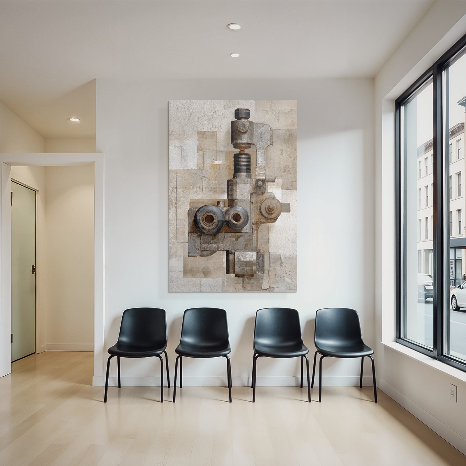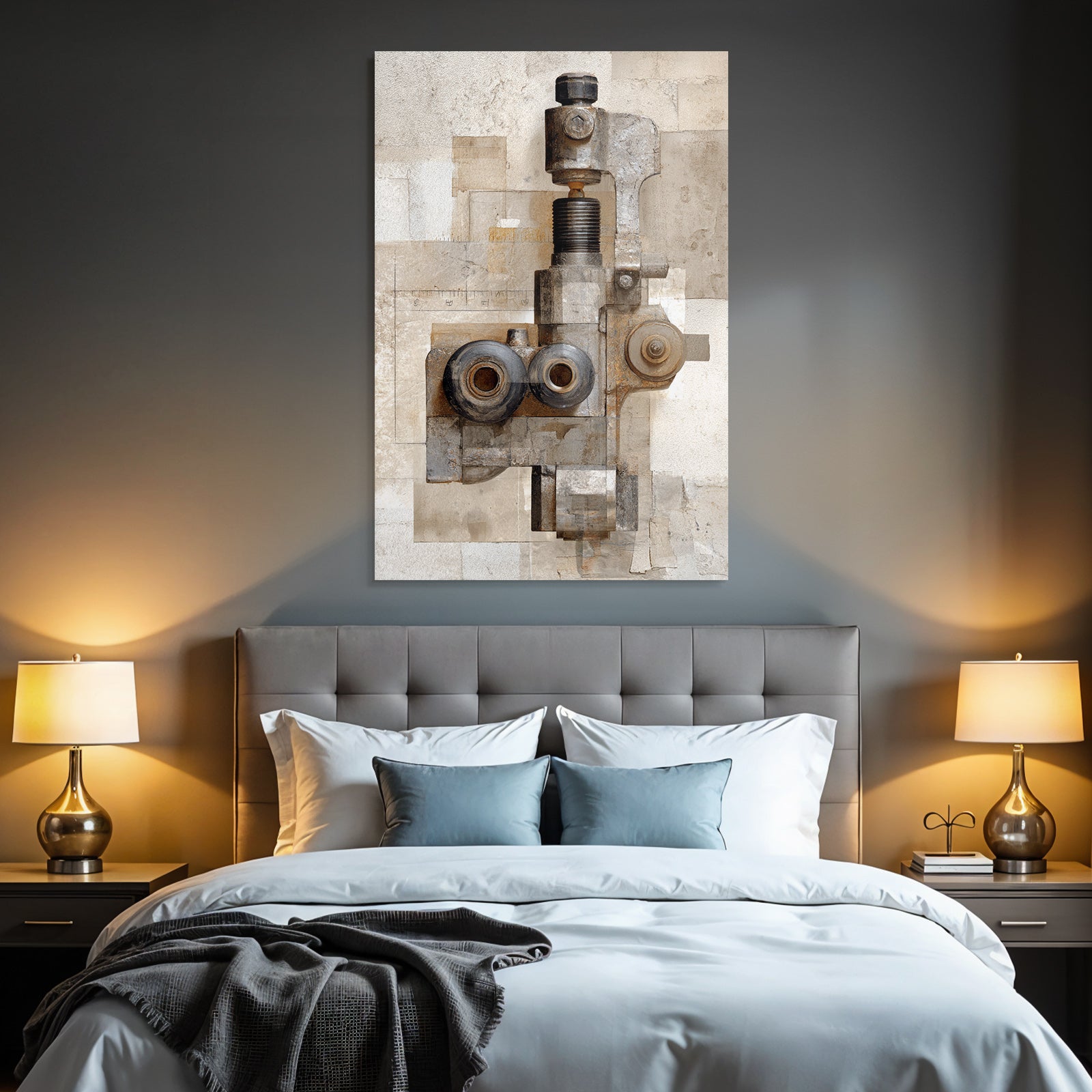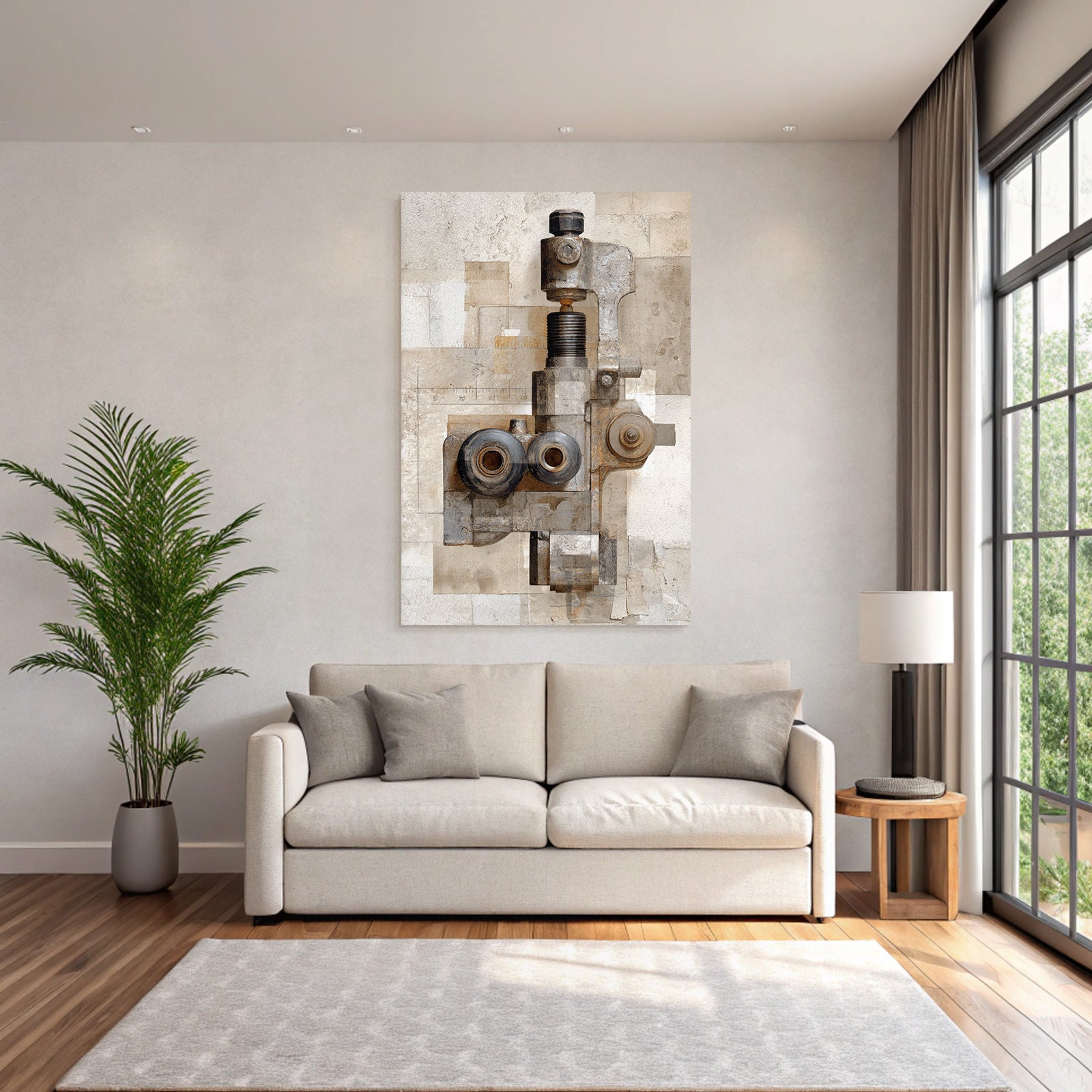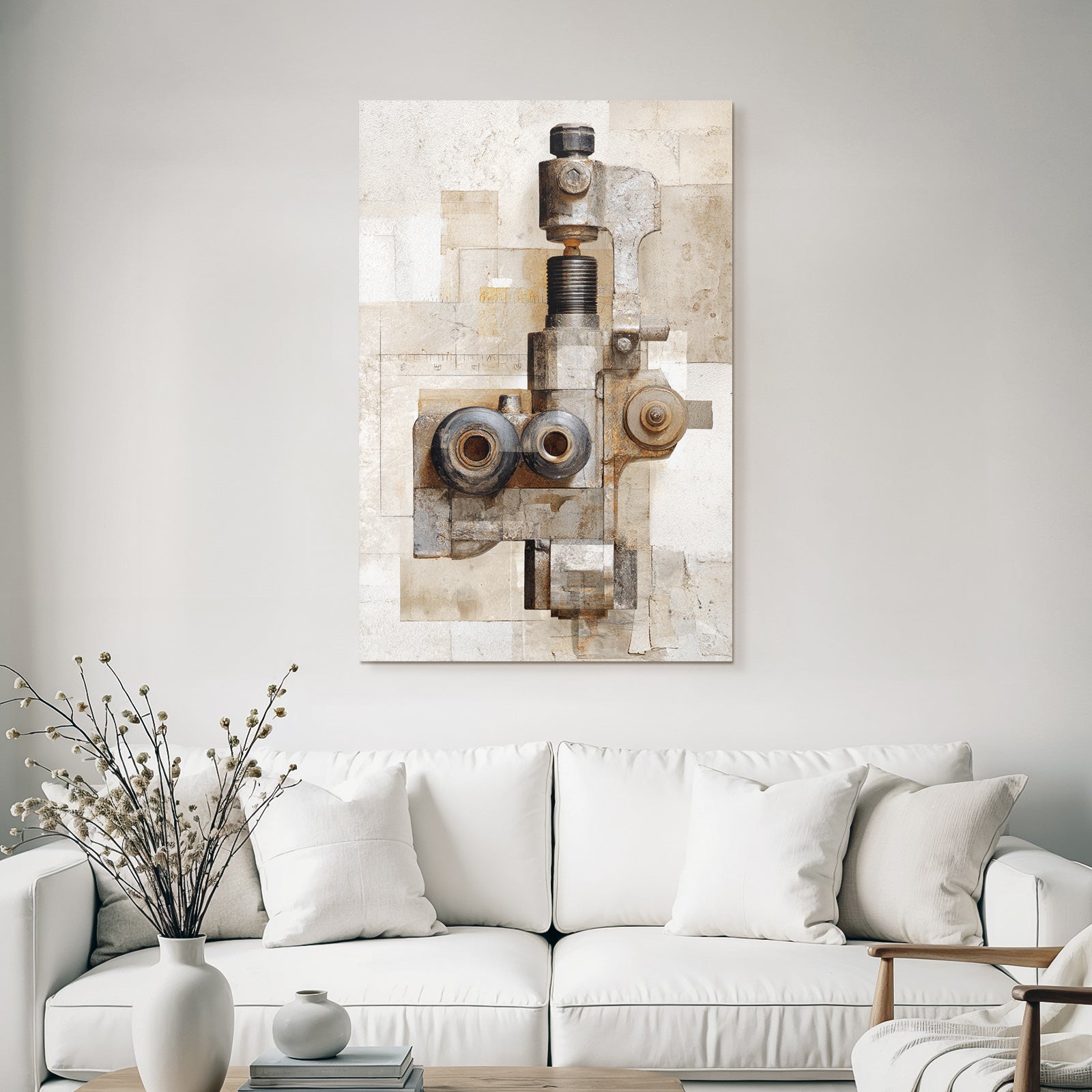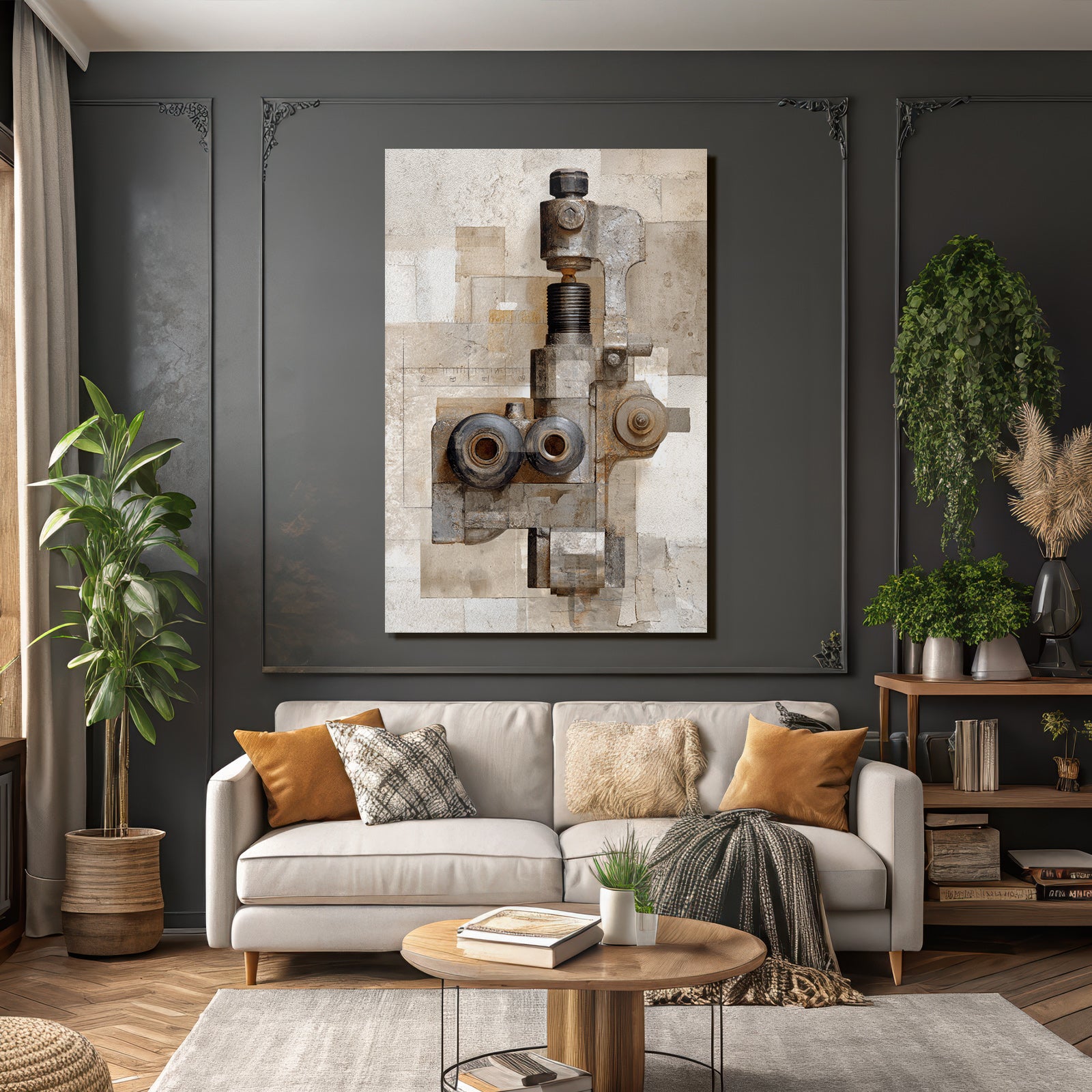 Ein Highlight für Wohnzimmer, Studio oder Empfangsbereich: „„Mechanisches Industrielles Component Detailansicht““ bringt den Stil Collagen auf Stoff – gespannt im edlen FameFrame.