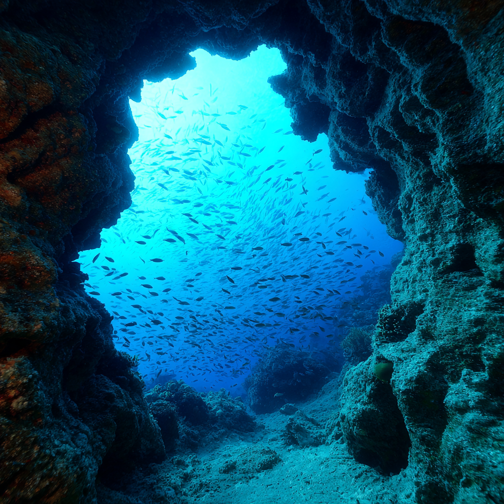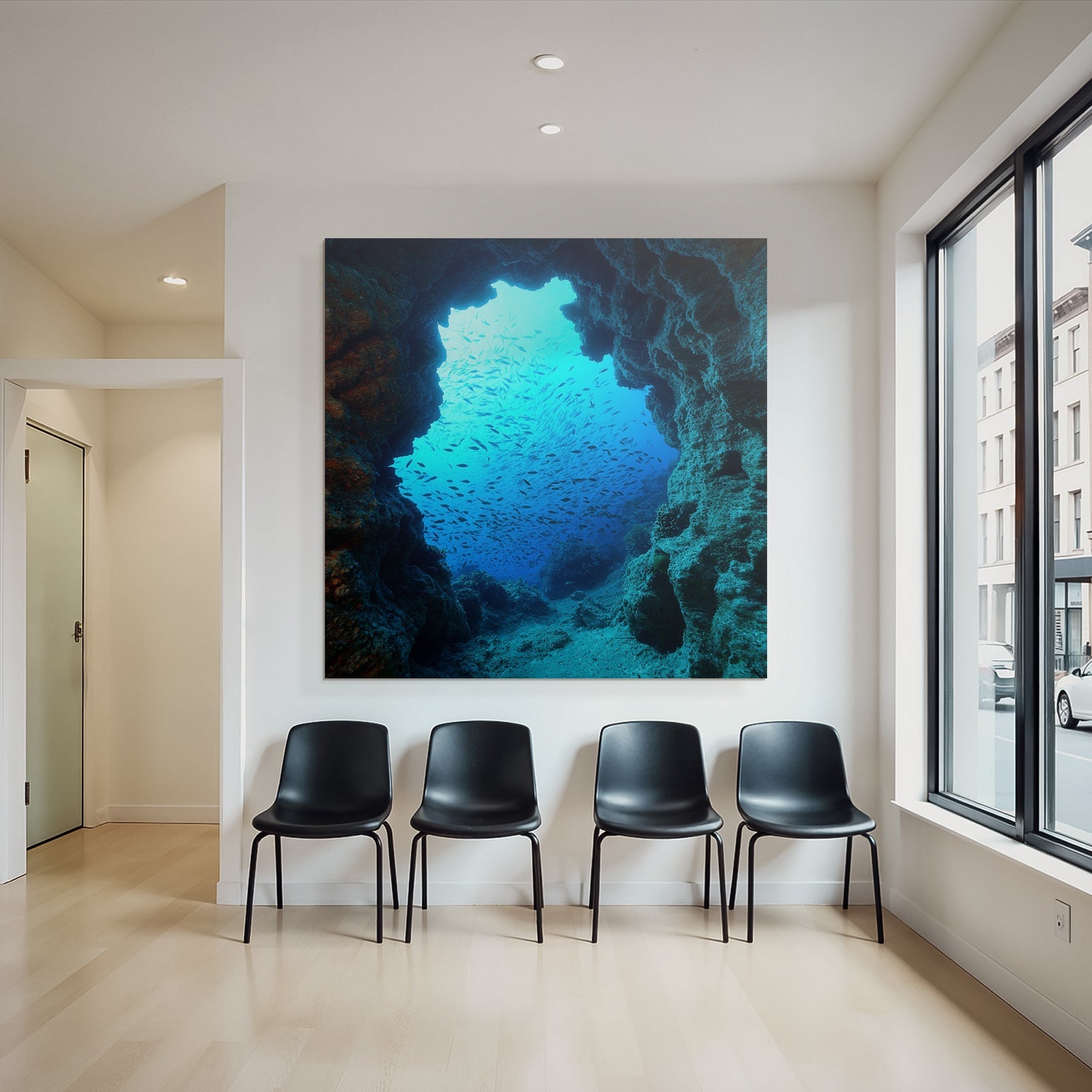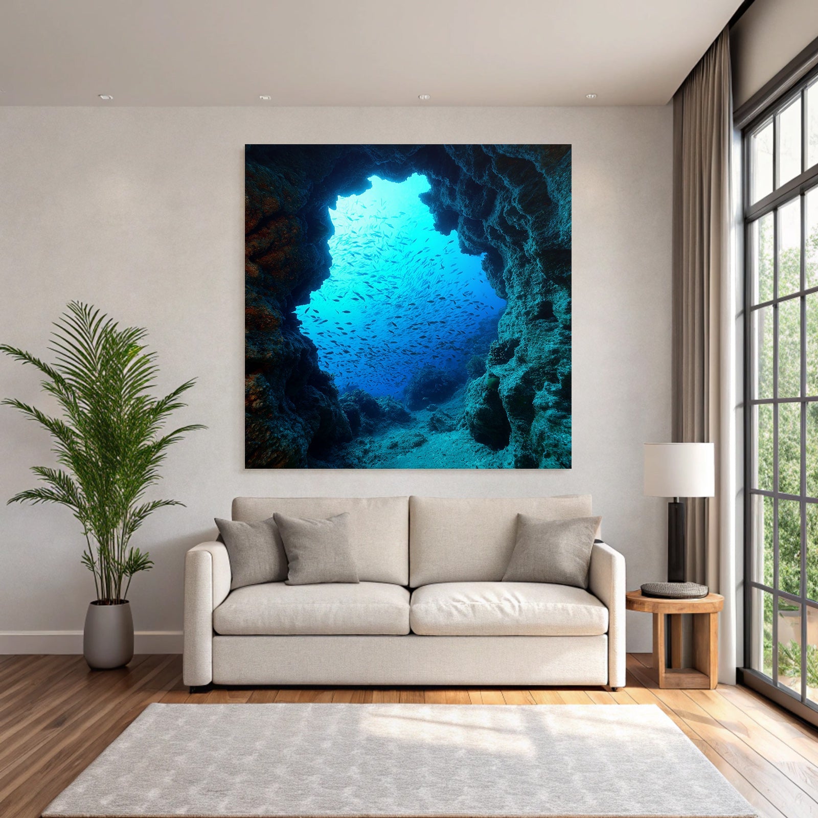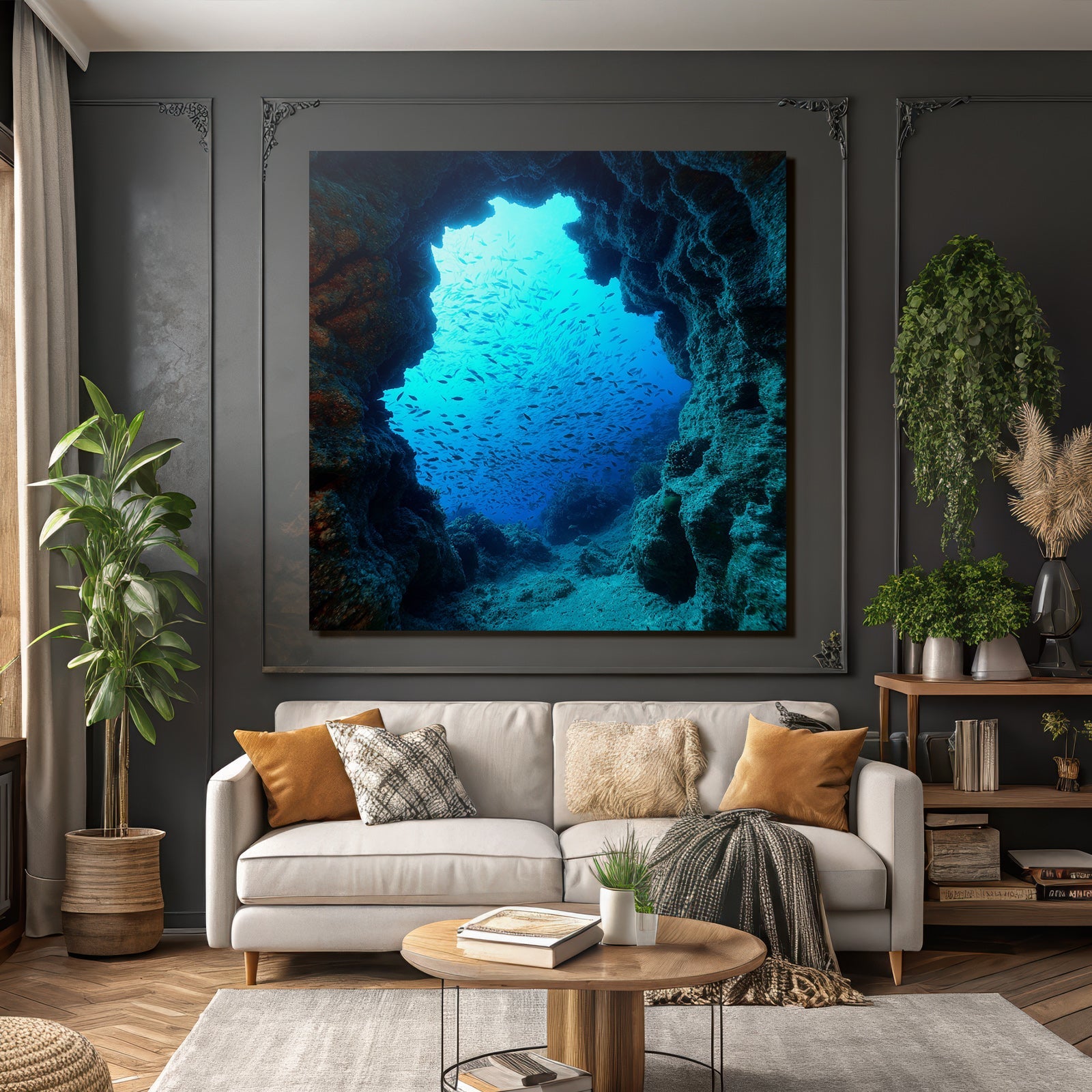 Das Kunstwerk „Meeres Unterwasser Felsbogen Sonnenlicht Fischschwarm“ ist eine Hommage an den Stil Meerestiere. Im FameFrame kommt die Farbbrillanz und Detailtiefe des Motivs perfekt zur Geltung.