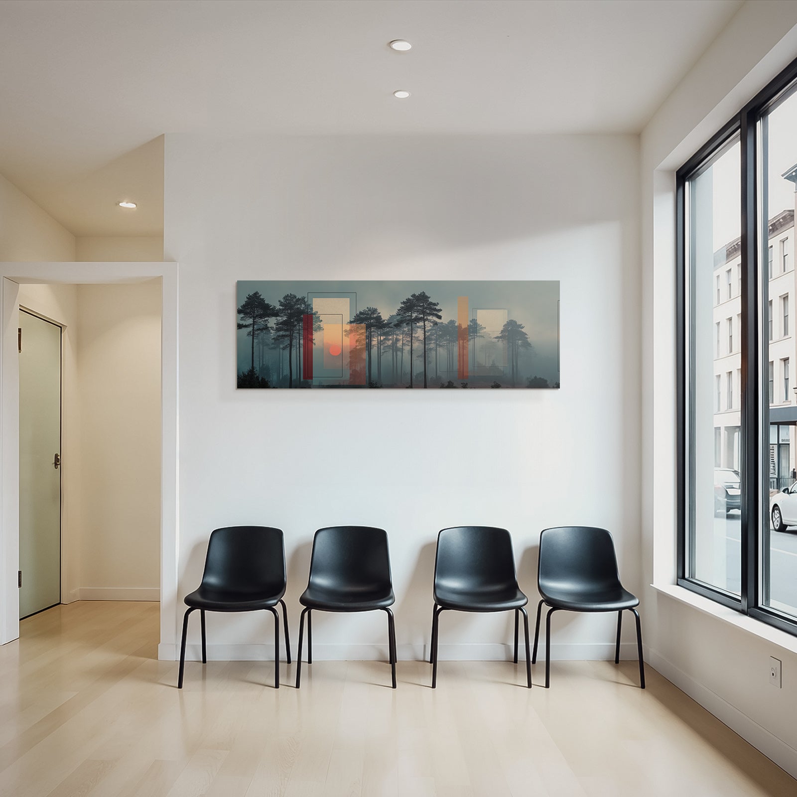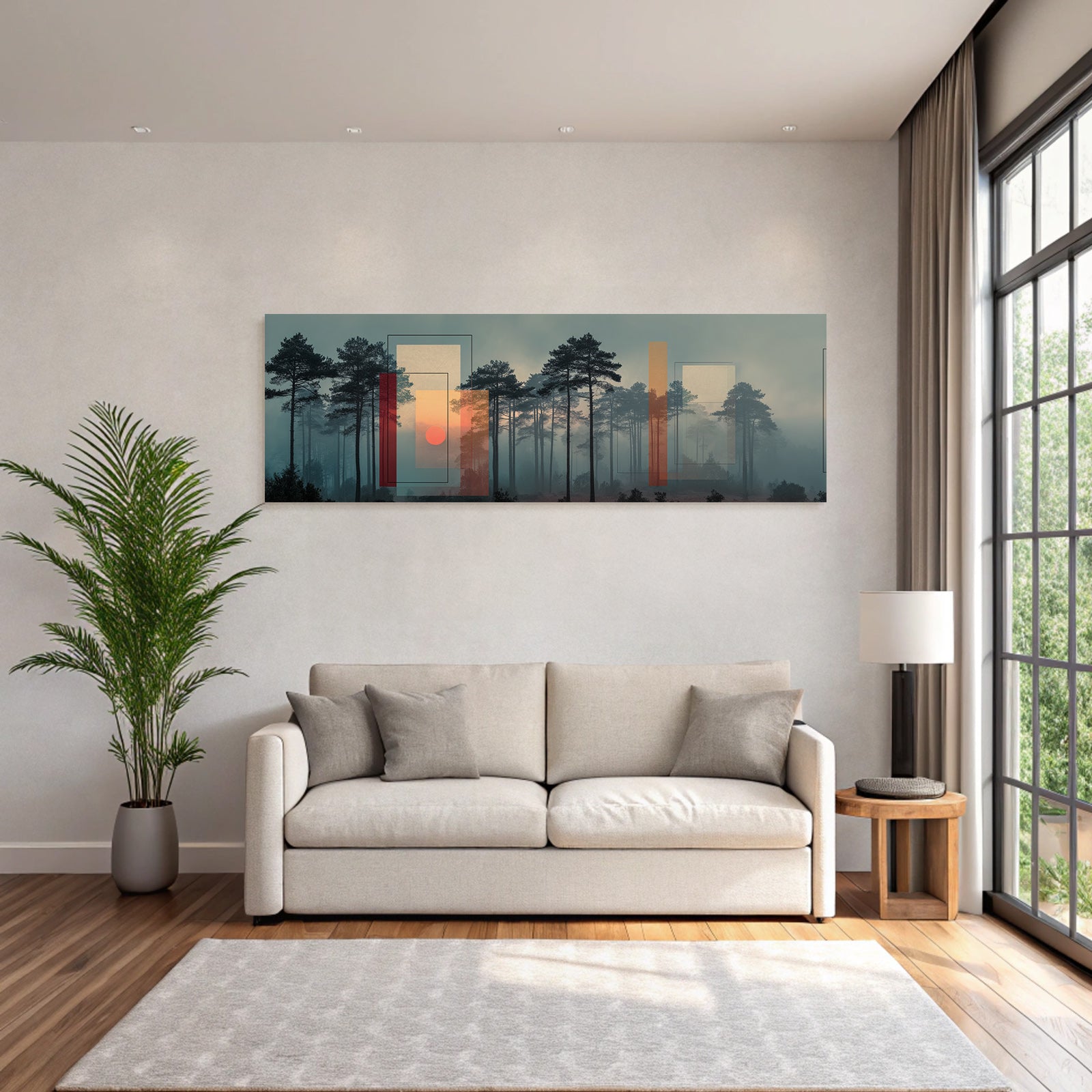 „„Mistiger Wald Geometrische Formen Kunstwerk““ bringt den Stil Collagen an Deine Wand – perfekt für Schlafzimmer, Homeoffice oder Besprechungsräume, edel gerahmt im FameFrame.