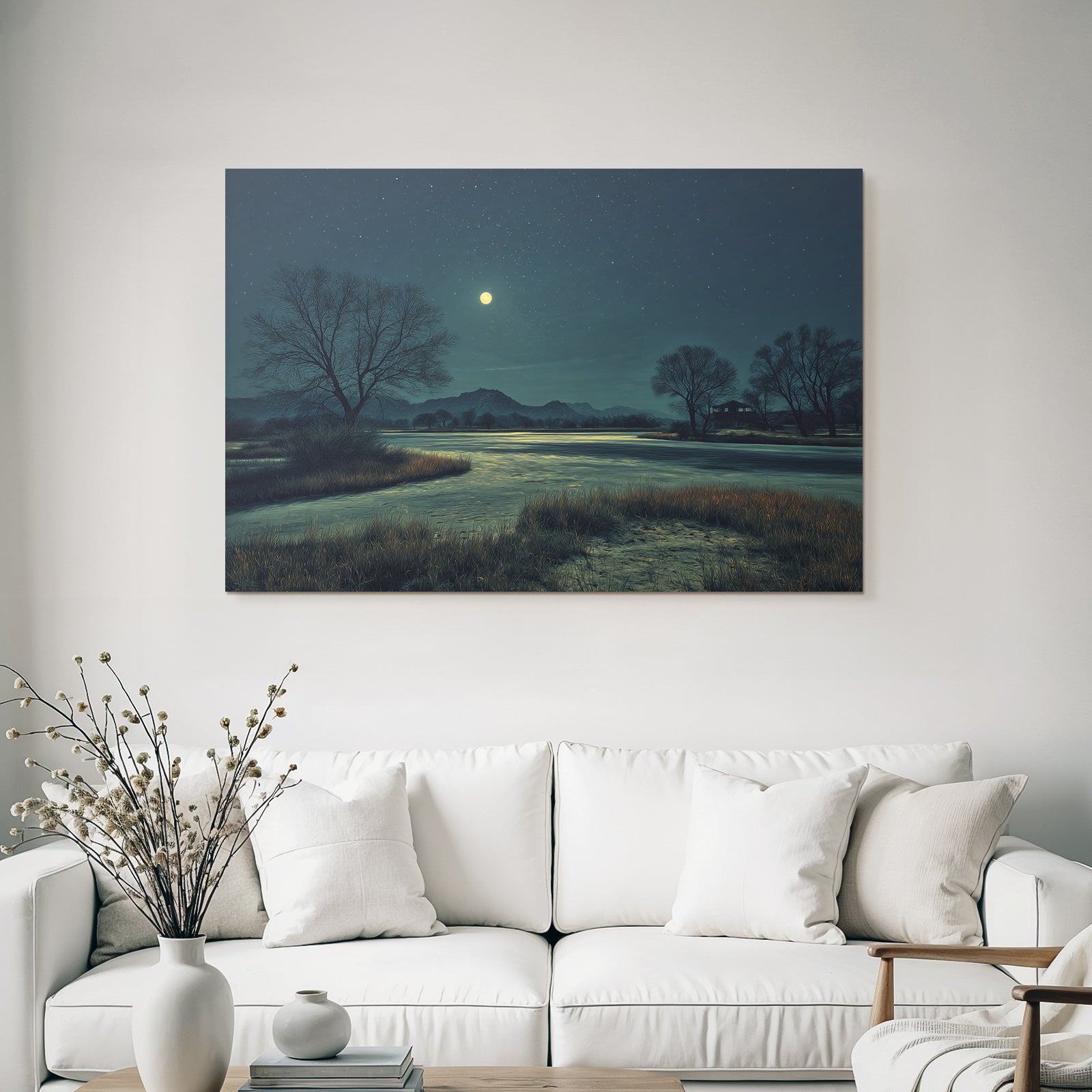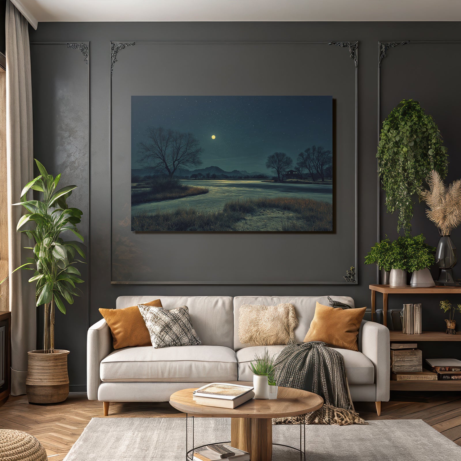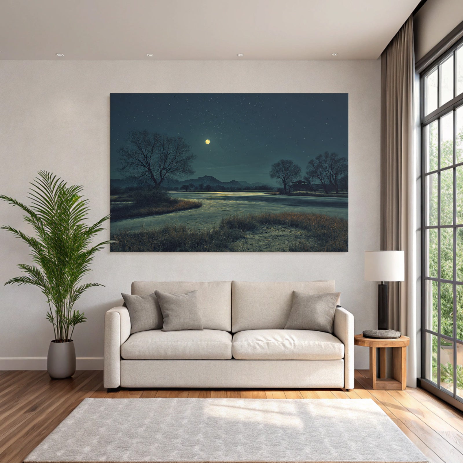 Setzen Sie im Flur oder Eingangsbereich ein erstes Willkommens-Statement. „Mondnacht Am Stillen See“ im Stil Psychedelische Kunst zieht im FameFrame™ sofort alle Blicke auf sich.