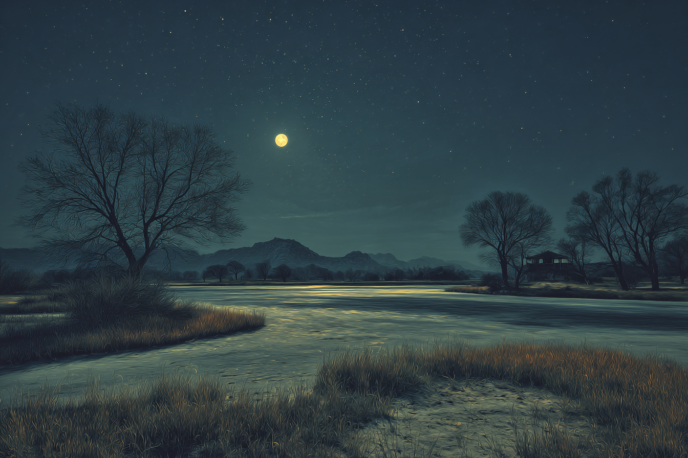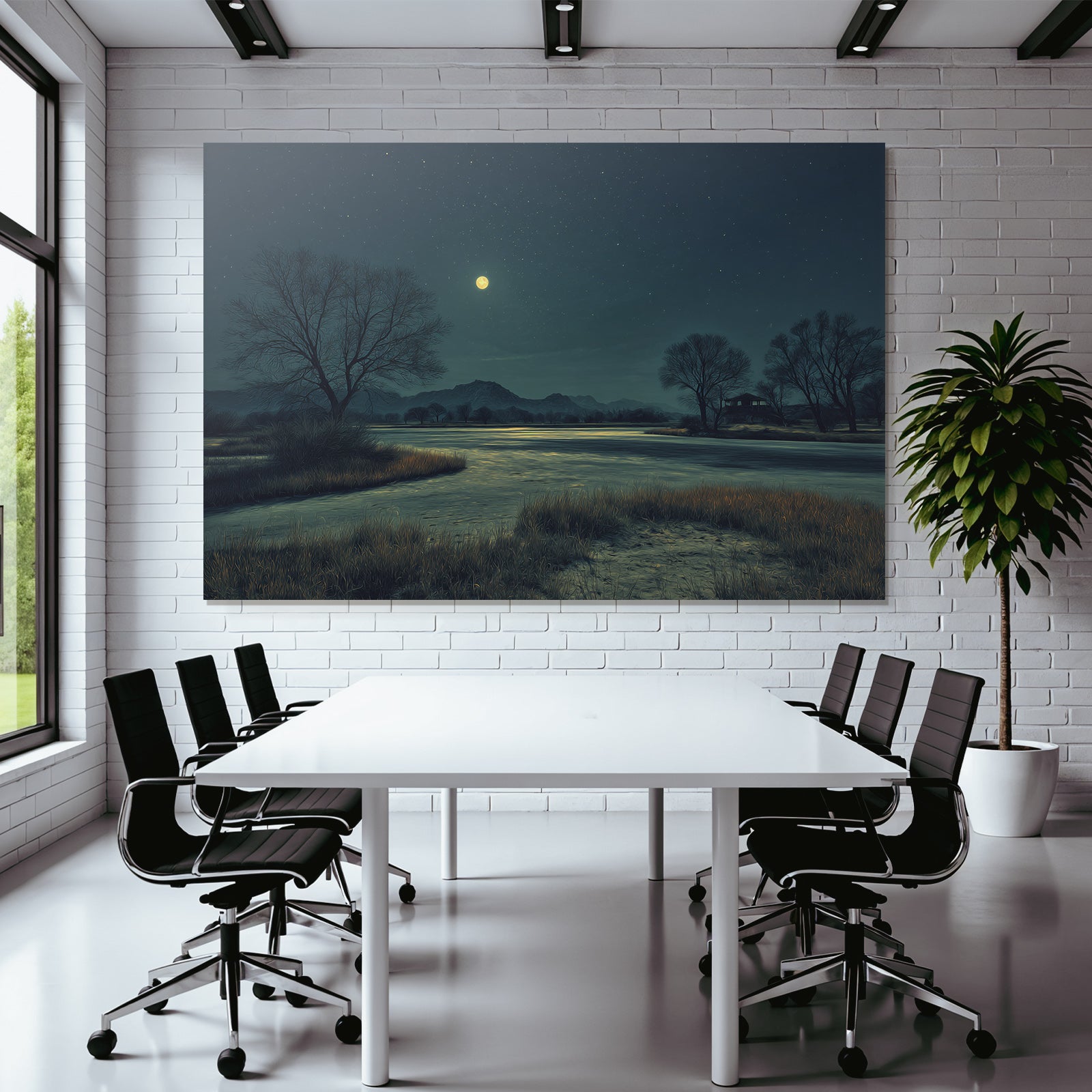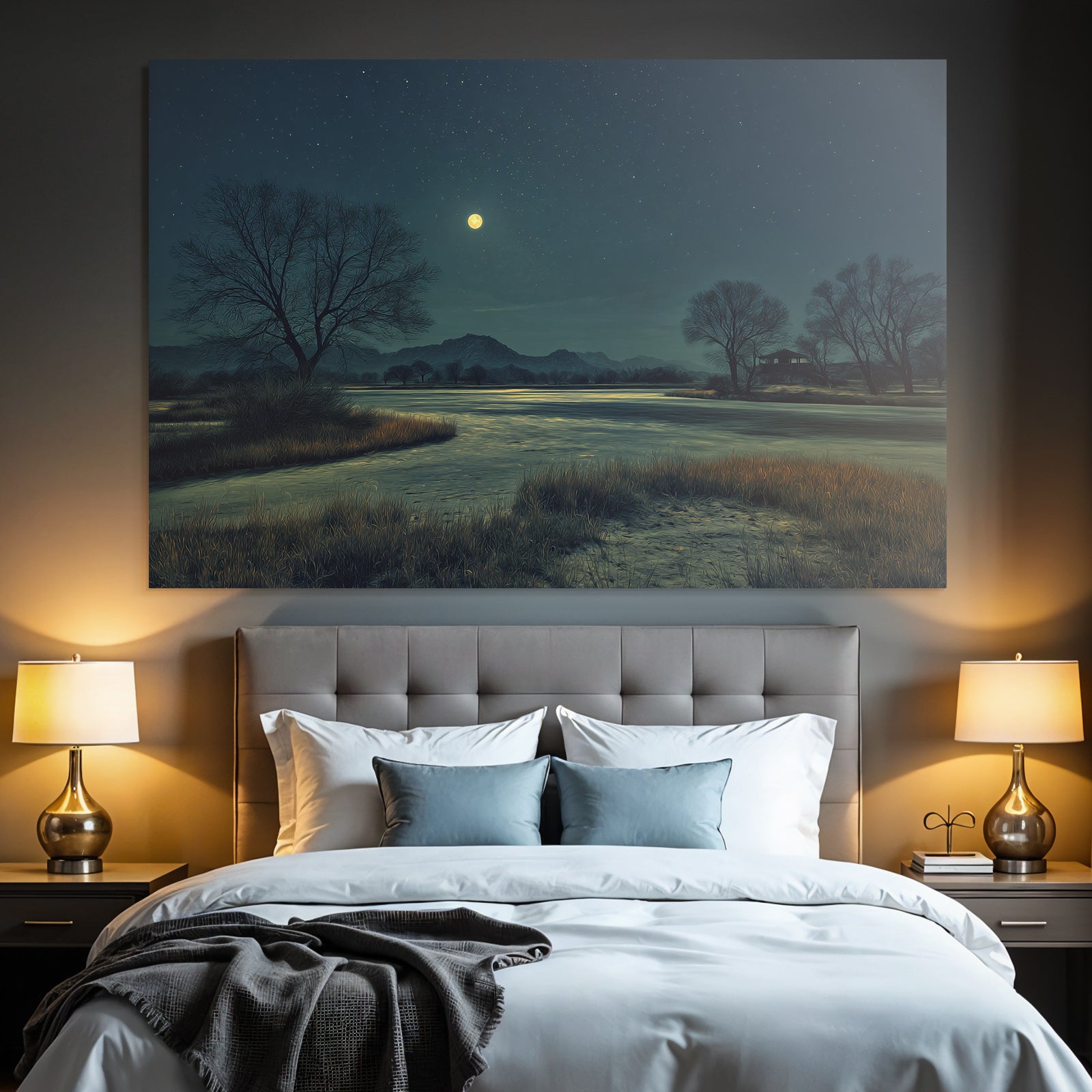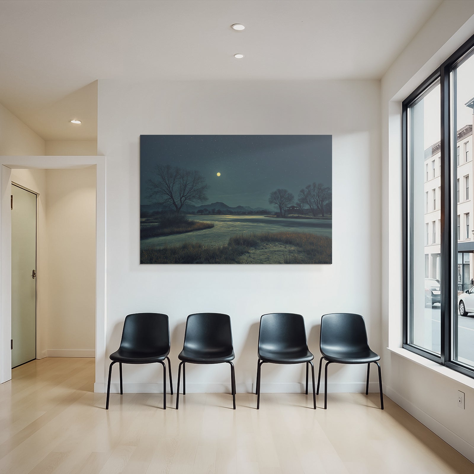 Setzen Sie im Flur oder Eingangsbereich ein erstes Willkommens-Statement. „Mondnacht Am Stillen See“ im Stil Psychedelische Kunst zieht im FameFrame™ sofort alle Blicke auf sich.
