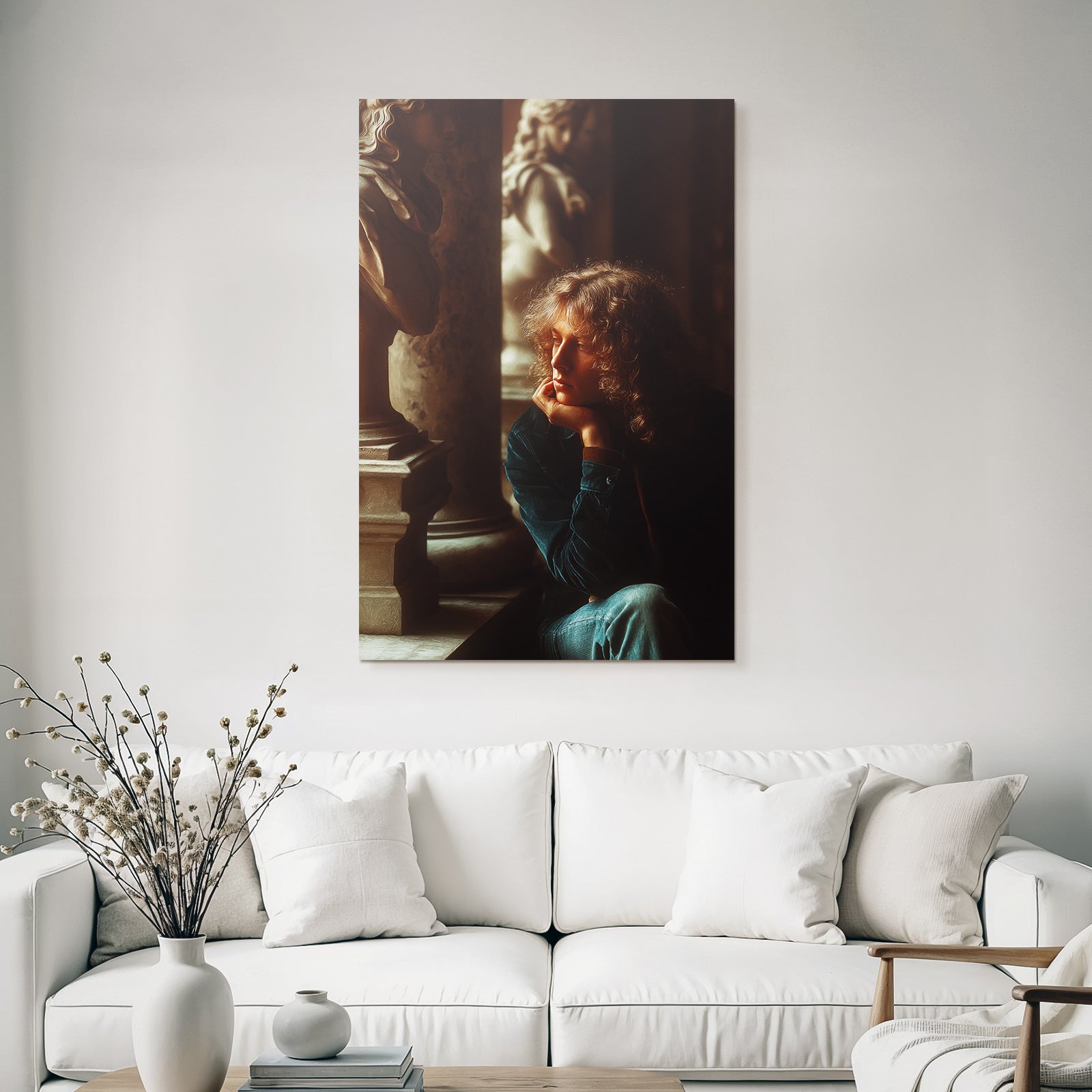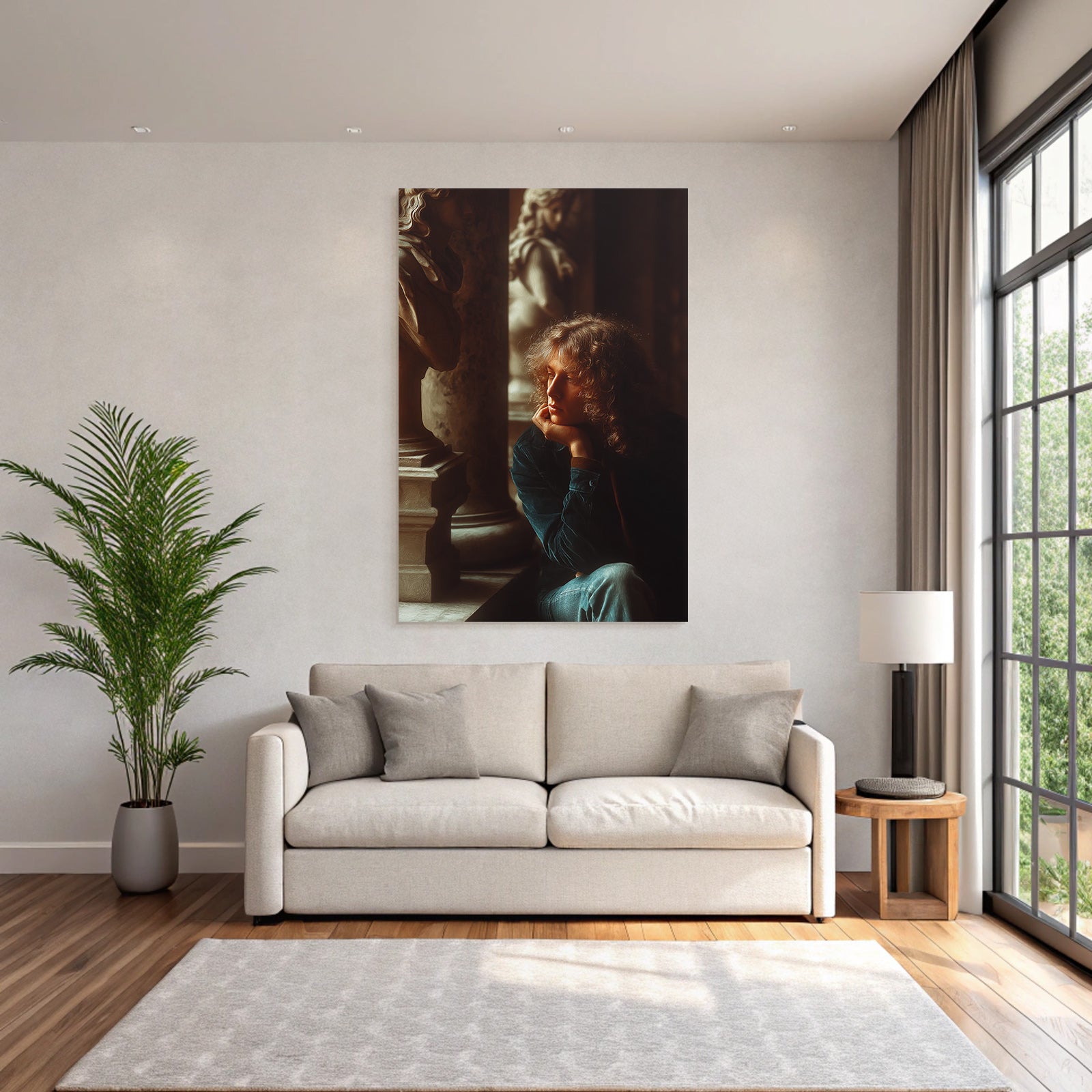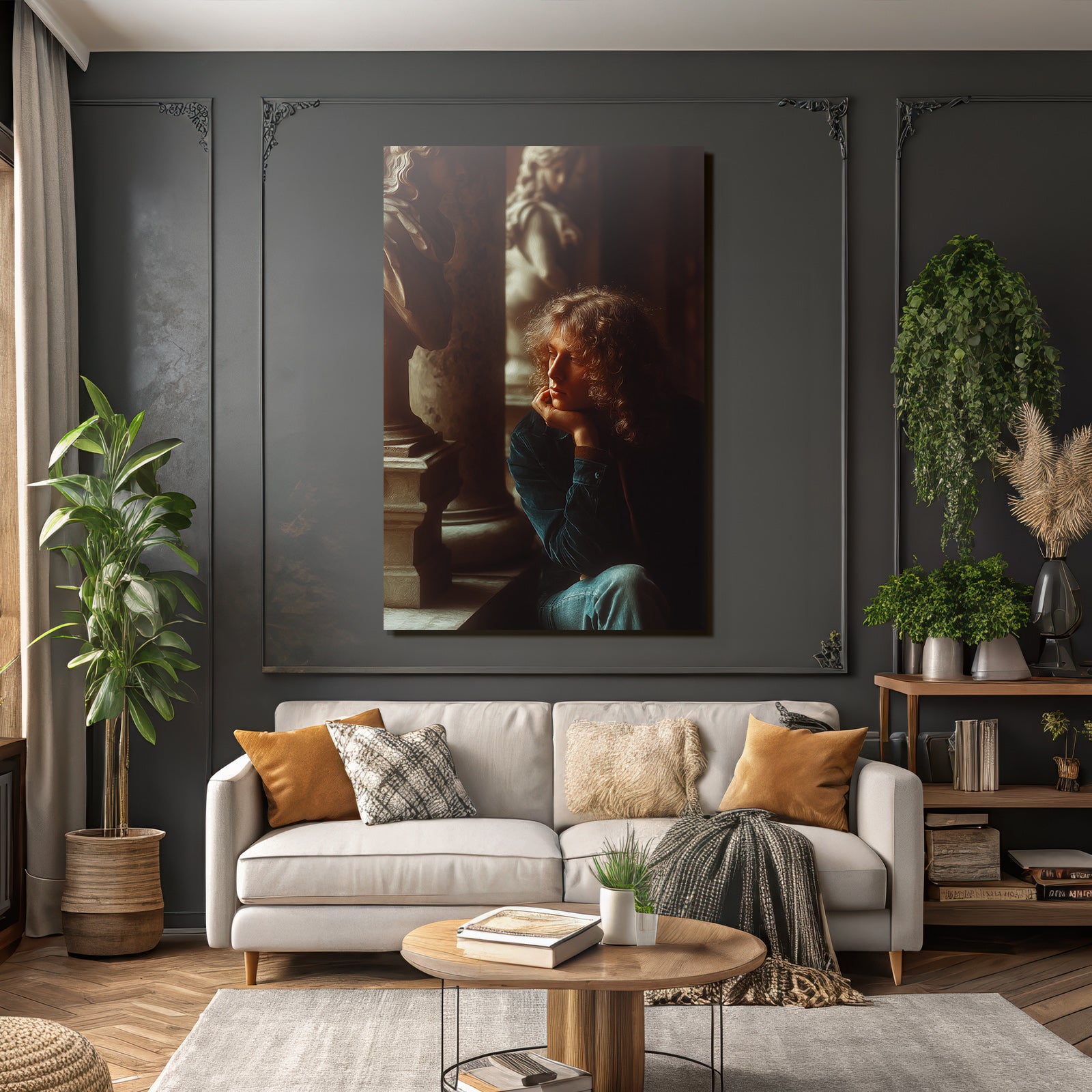 Ein Stück Klassisch für Deine vier Wände: Das Werk „„Nachdenkliche Person Neben Skulpturen Kunstvolles Lichtsetzung““ im hochwertigen FameFrame bringt kreative Energie in jeden Raum.