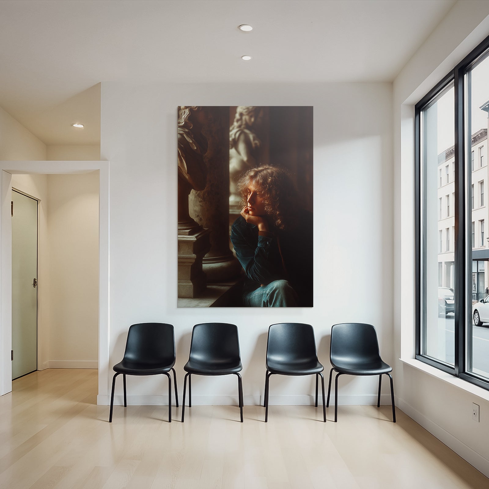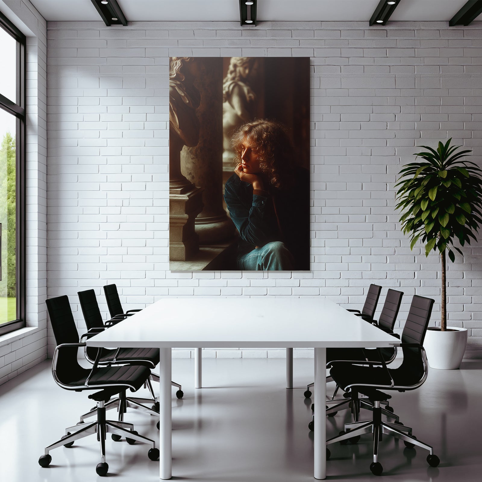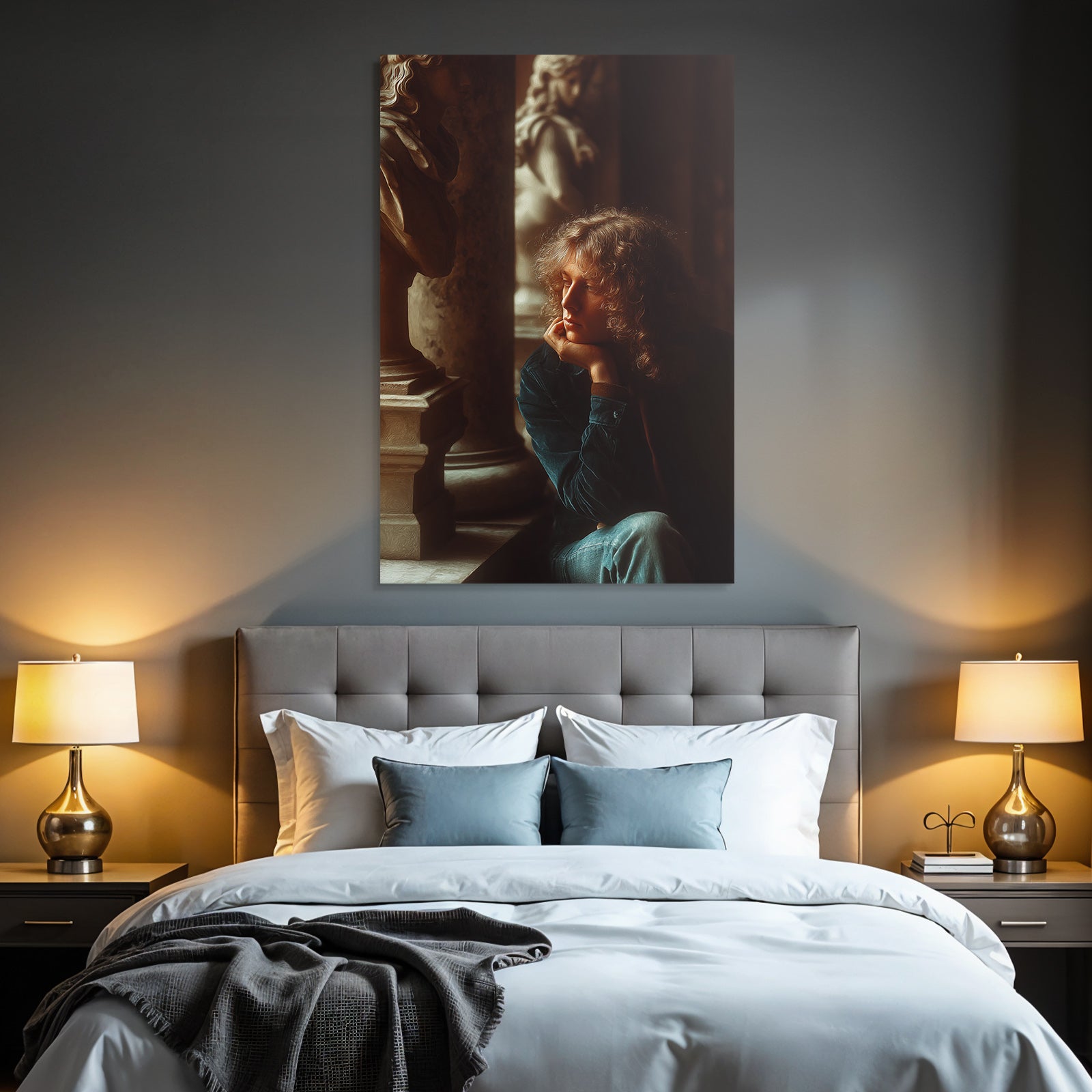 Ein Stück Klassisch für Deine vier Wände: Das Werk „„Nachdenkliche Person Neben Skulpturen Kunstvolles Lichtsetzung““ im hochwertigen FameFrame bringt kreative Energie in jeden Raum.