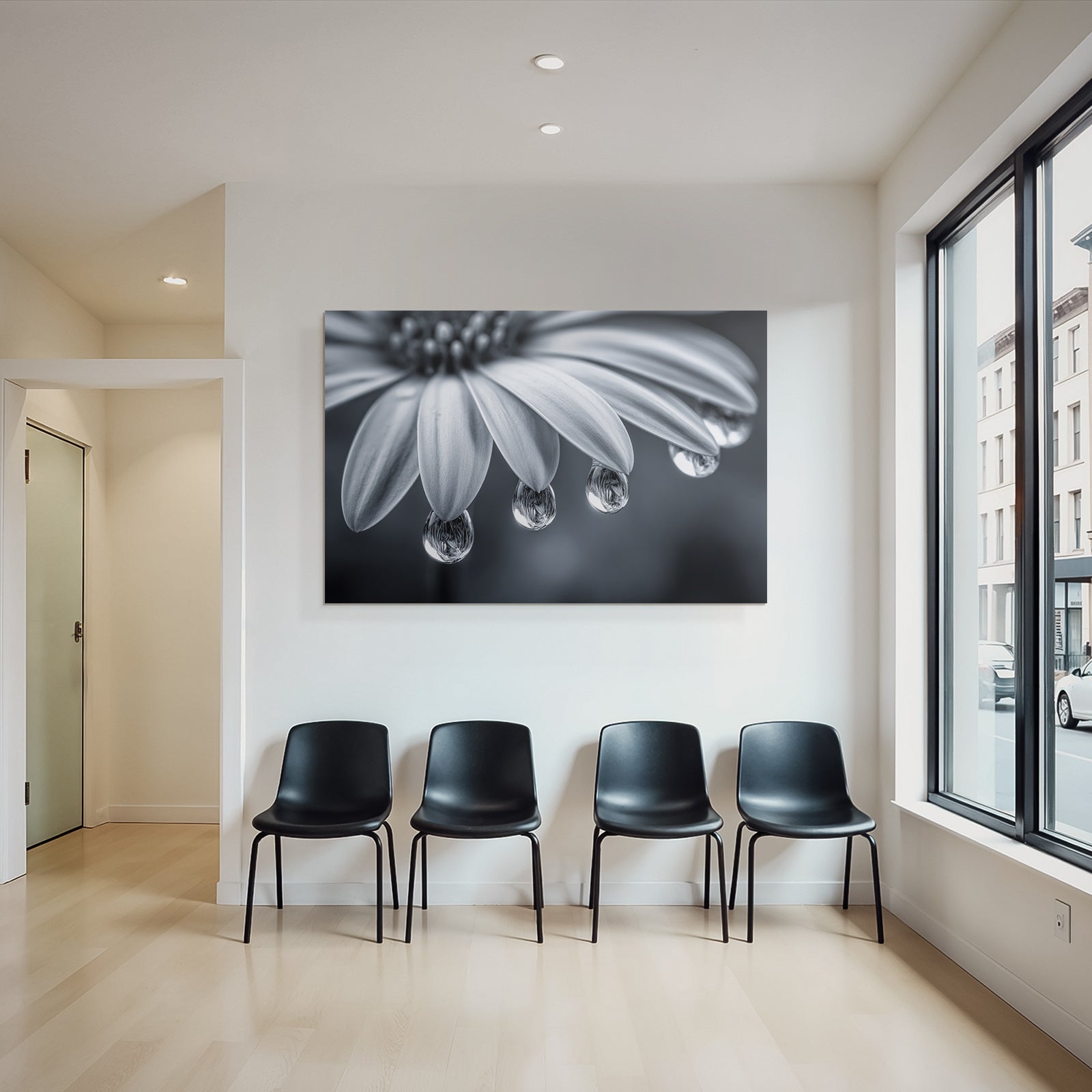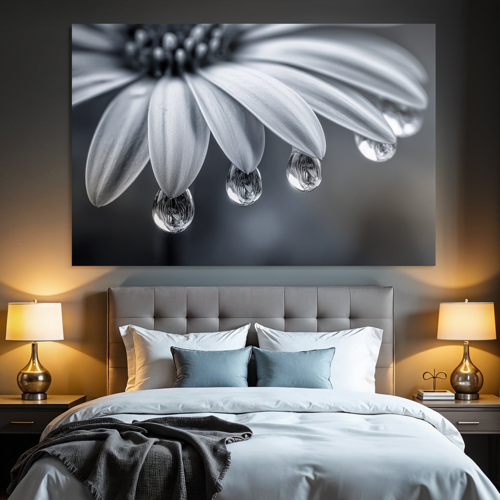 Für Liebhaber des Wasserfaelle und Tropfen-Looks: Das Kunstwerk „Nahaufnahme Blume Mit Tautropfen“ bringt die charakteristischen Merkmale dieses Stils brillant auf Stoff – perfektioniert durch den FameFrame.