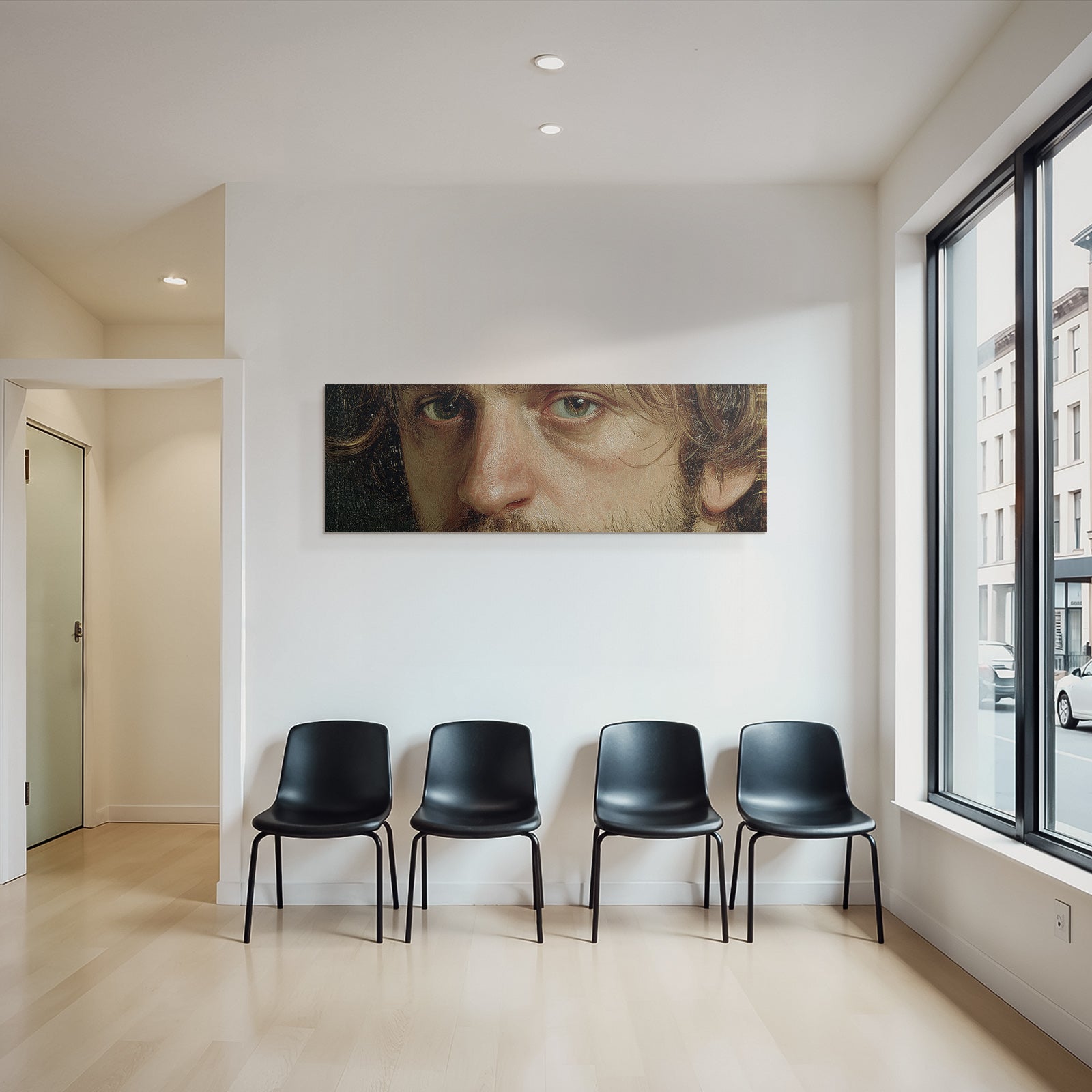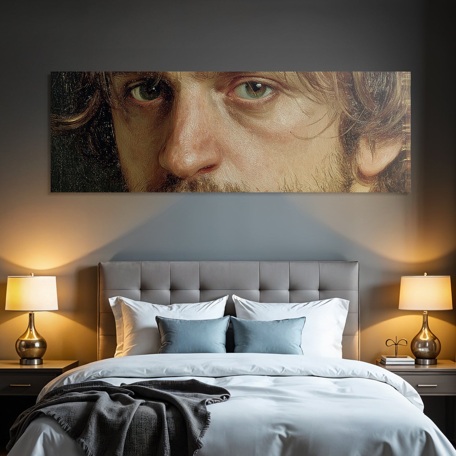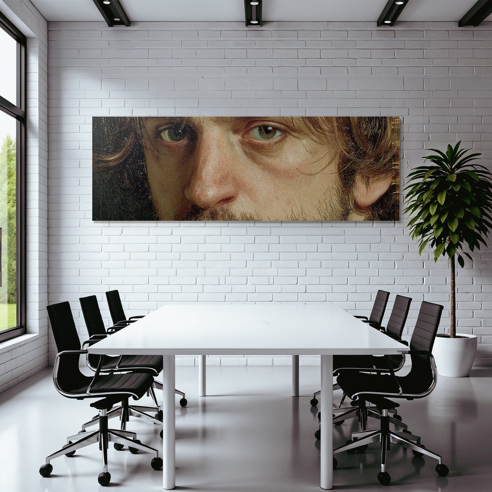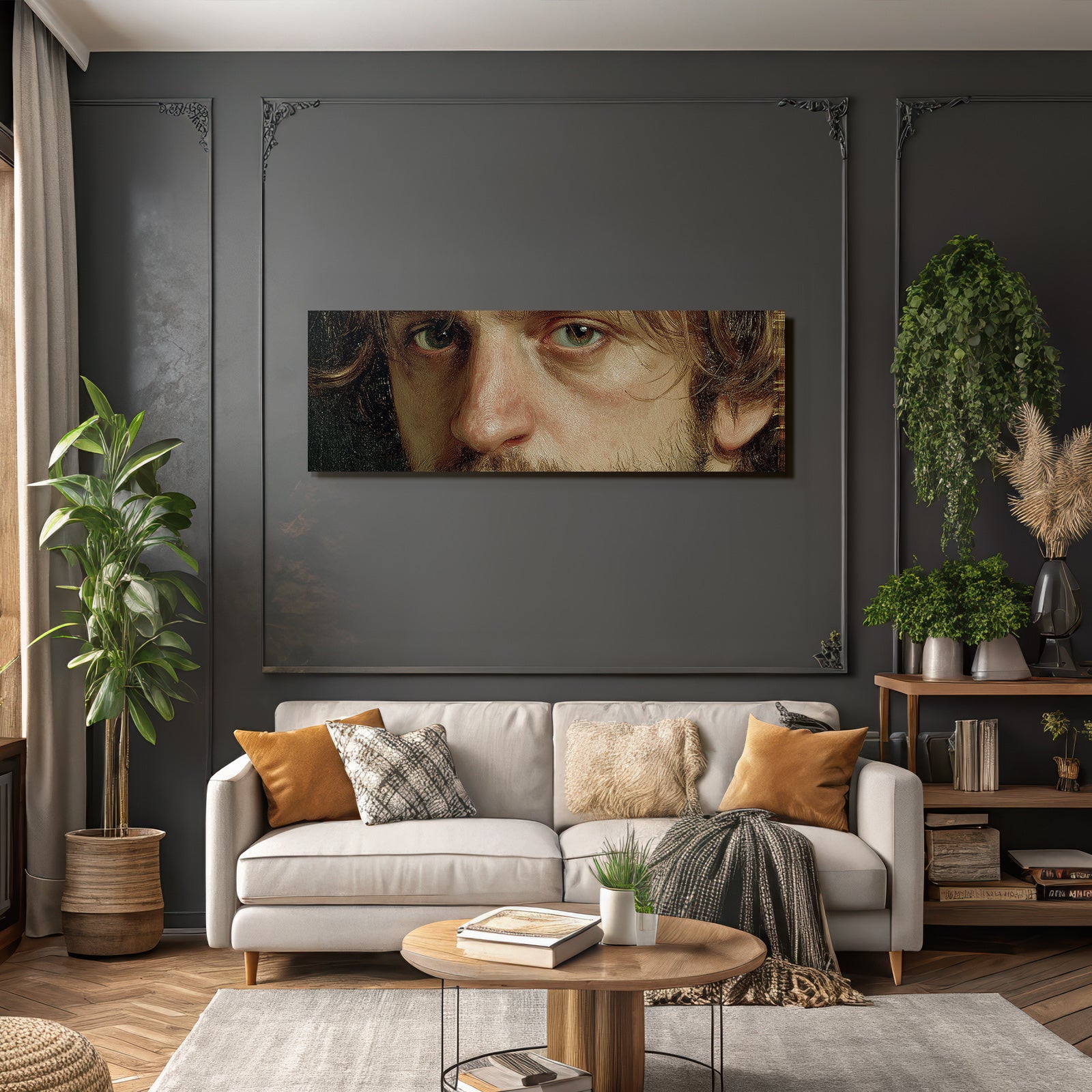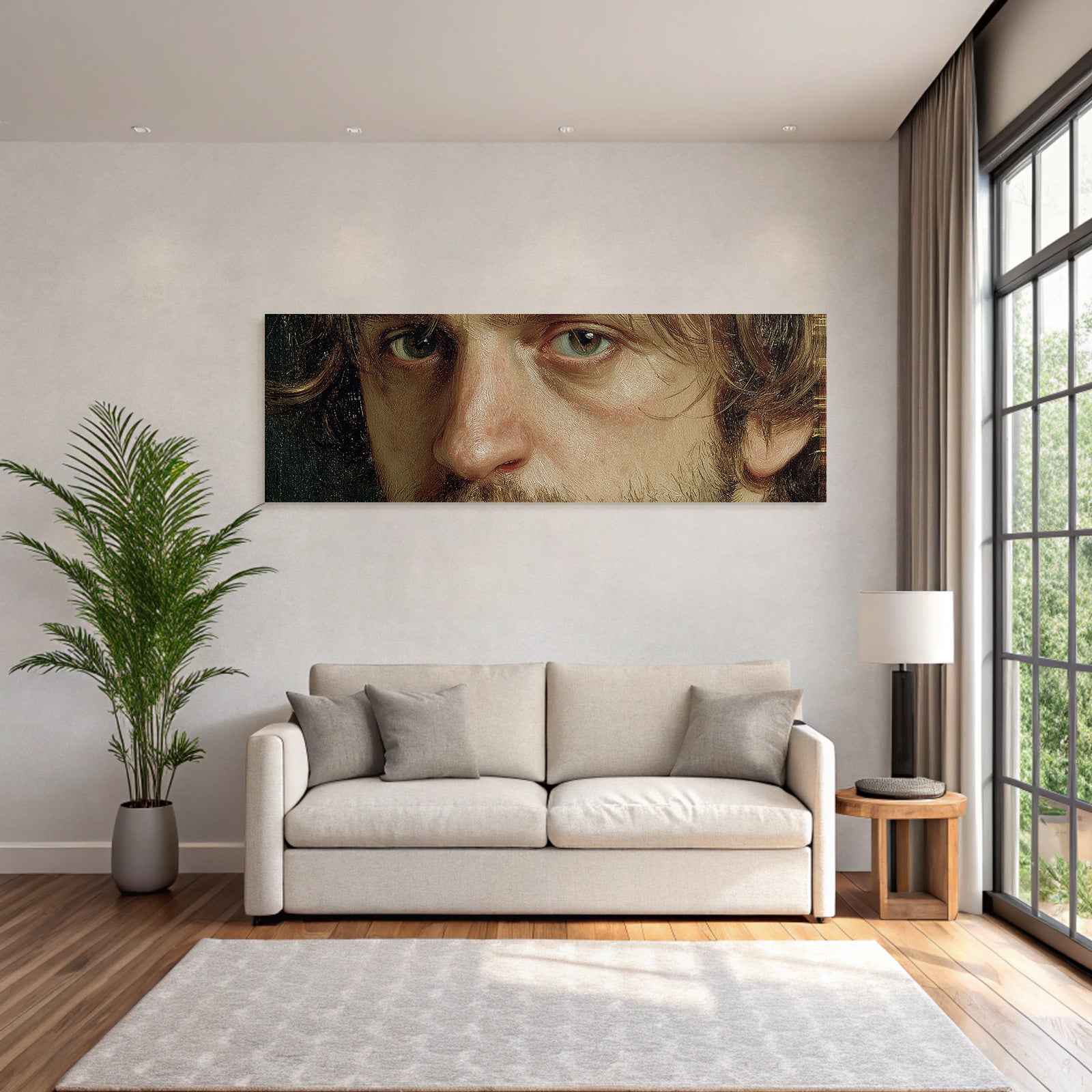 Für Liebhaber des Alte und Neue Meister-Looks: Das Kunstwerk „Nahaufnahme Eines Gesichts“ bringt die charakteristischen Merkmale dieses Stils brillant auf Stoff – perfektioniert durch den FameFrame.