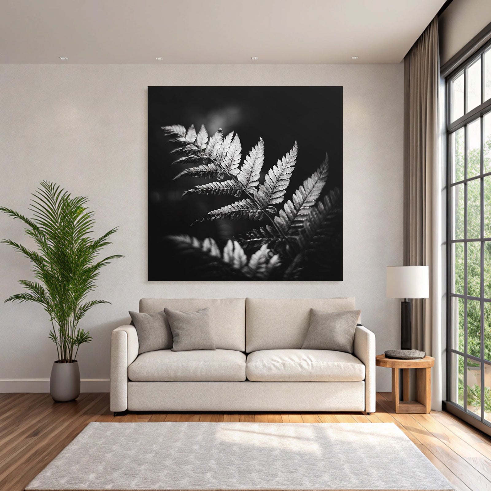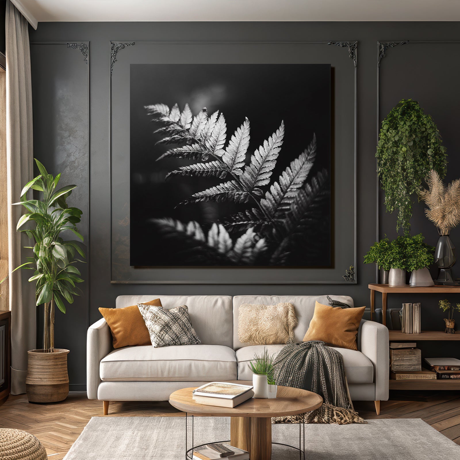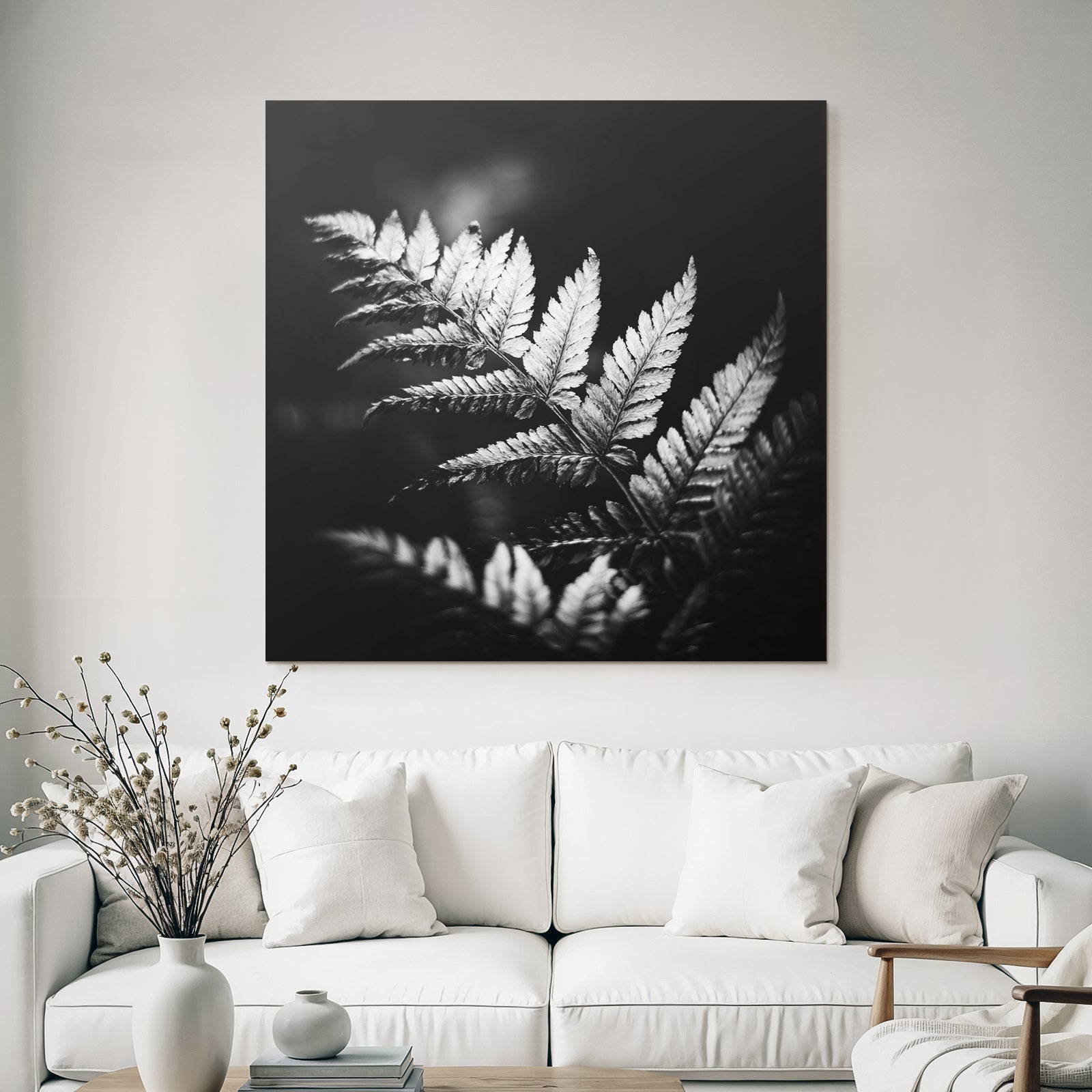 Erlebe Kunst im Stil Fotografie neu: „„Nahaufnahme Von Farnblaettern Schwarz Weiss““ wird durch den eleganten FameFrame zum Blickfang in jedem Raum.