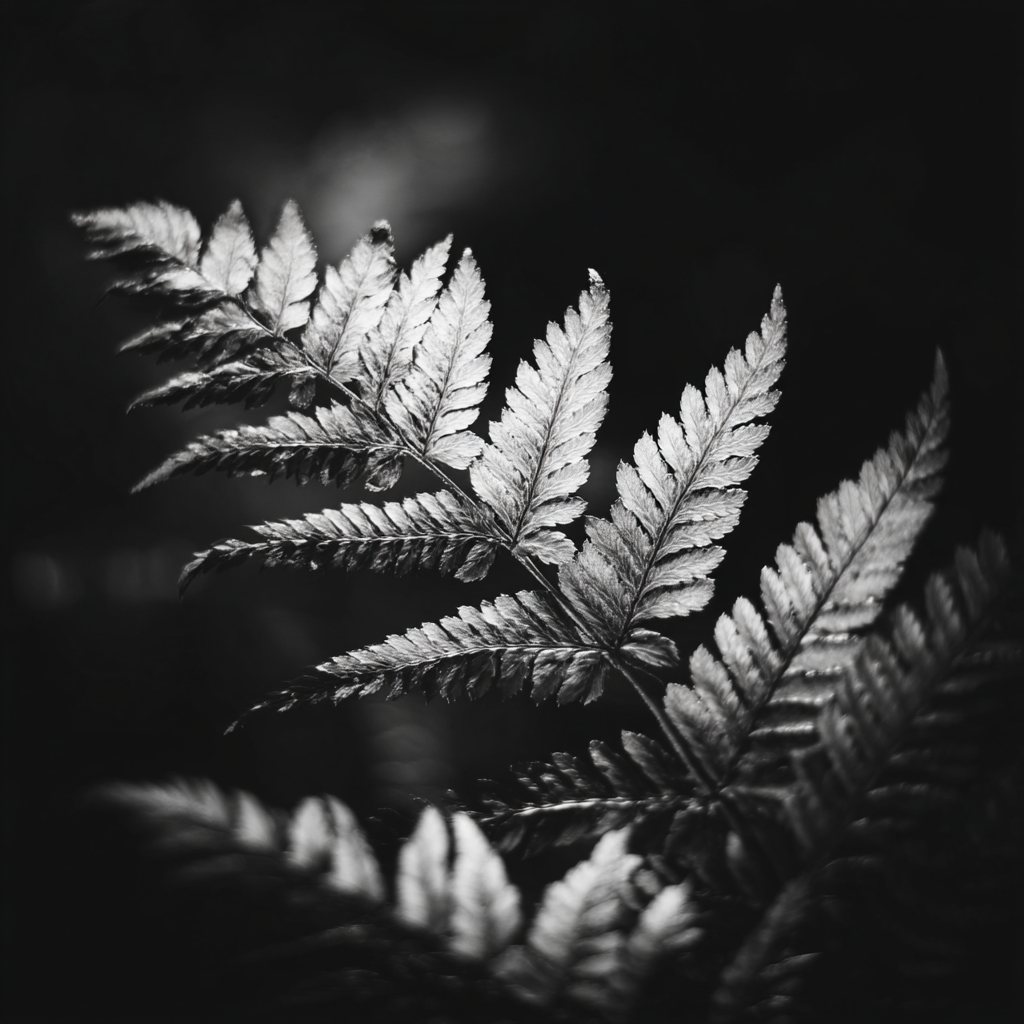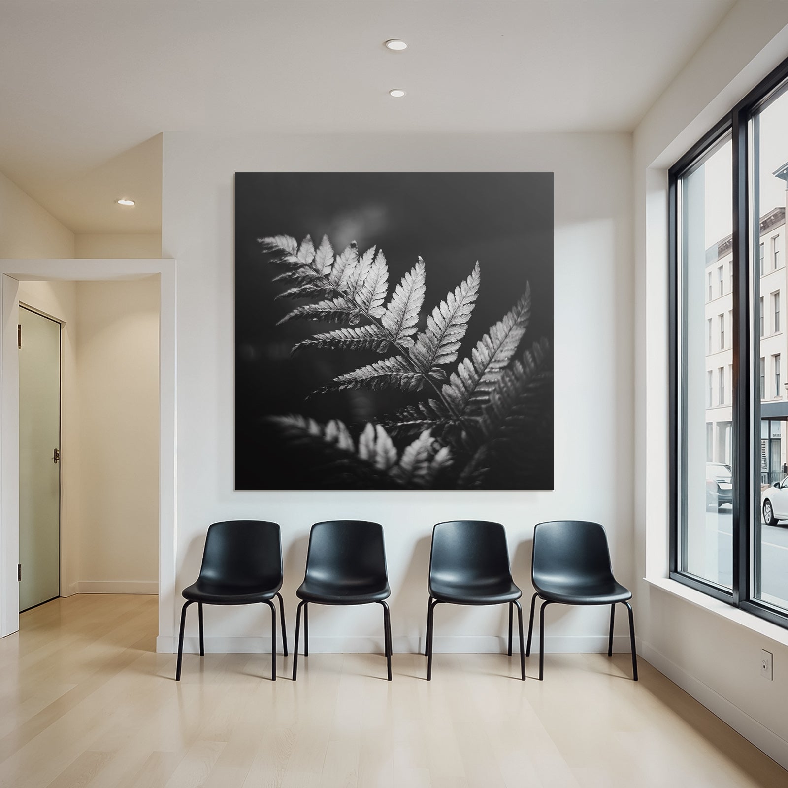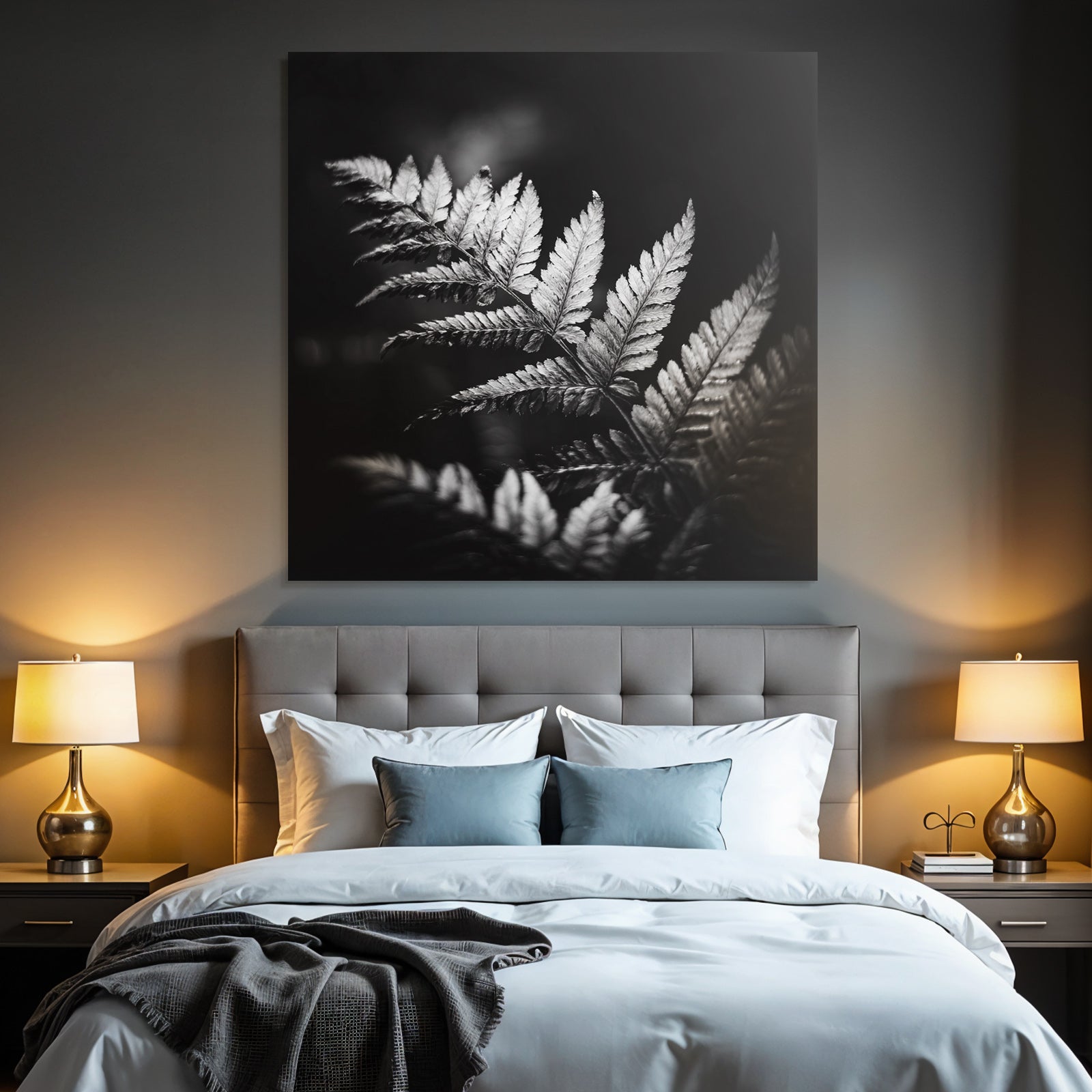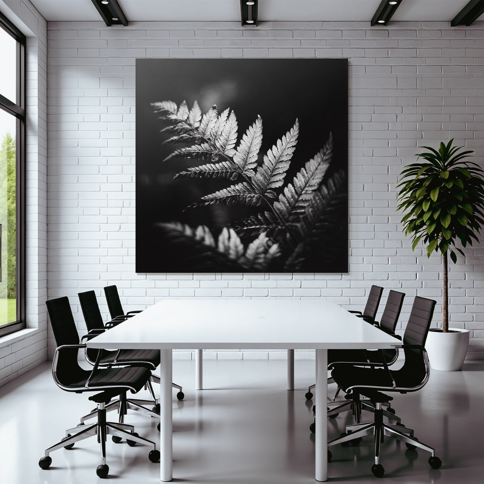 Erlebe Kunst im Stil Fotografie neu: „„Nahaufnahme Von Farnblaettern Schwarz Weiss““ wird durch den eleganten FameFrame zum Blickfang in jedem Raum.