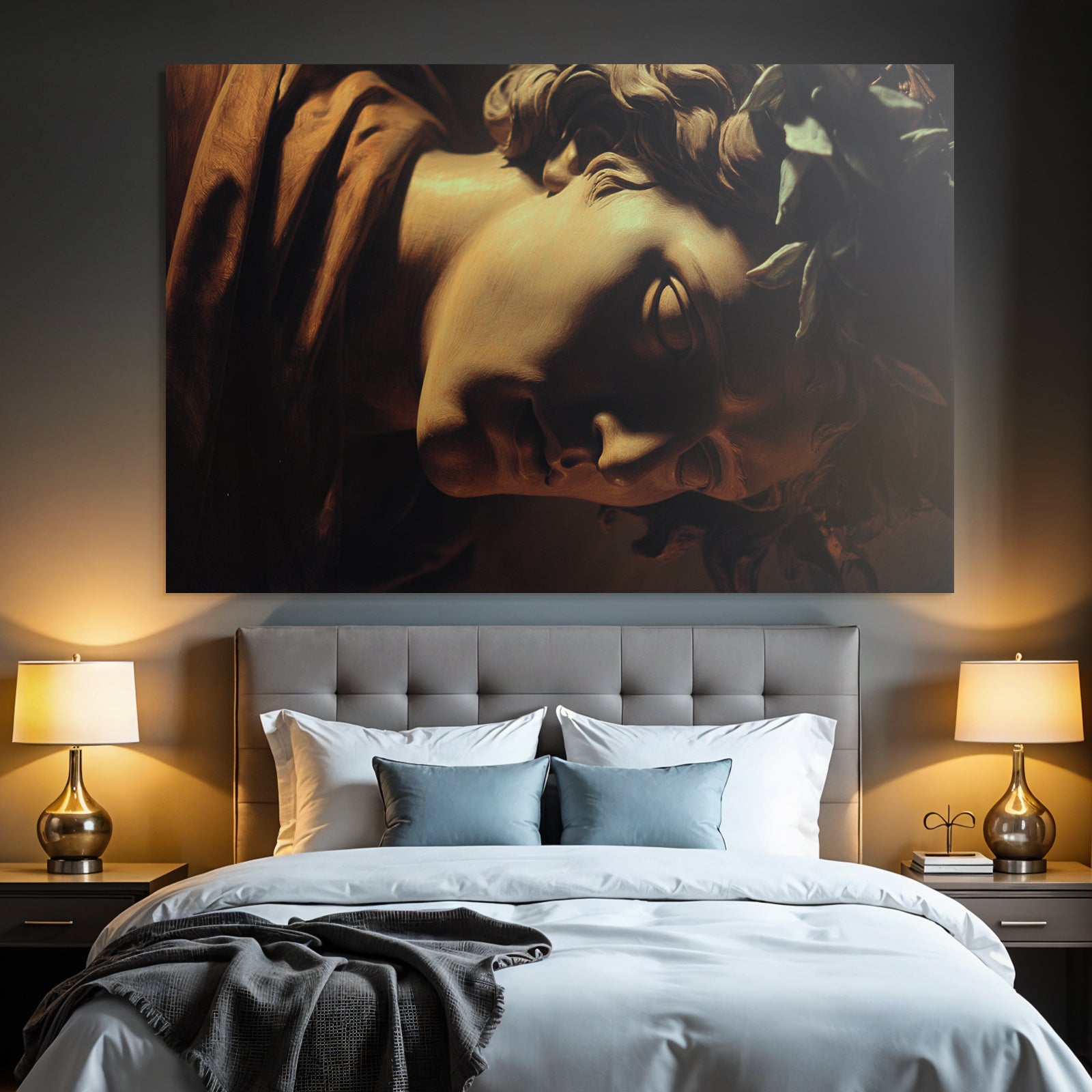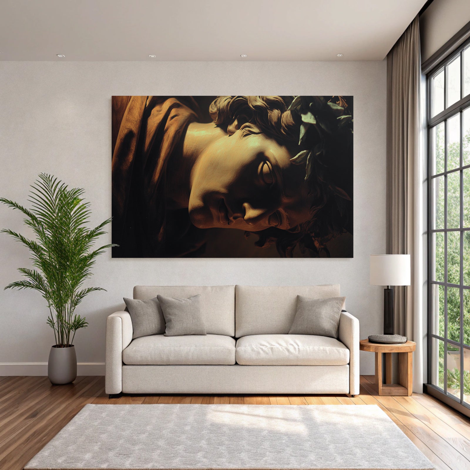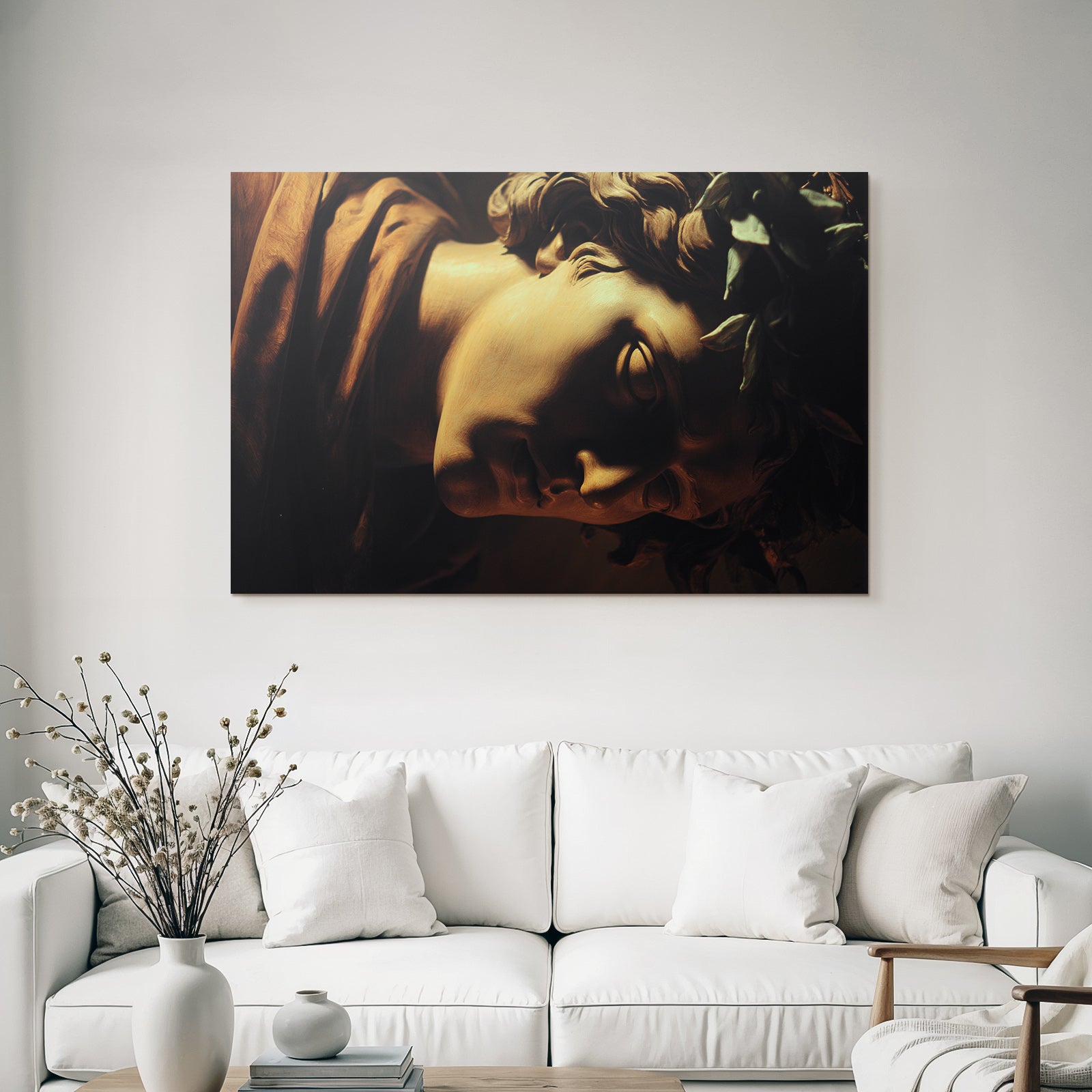 Das Motiv „„Naheaufnahme Der Statue Eines Mythologischen Fixtures““ bringt Klassisch-Inspiration in Dein Zuhause – brillant gedruckt und elegant im FameFrame aufgespannt.