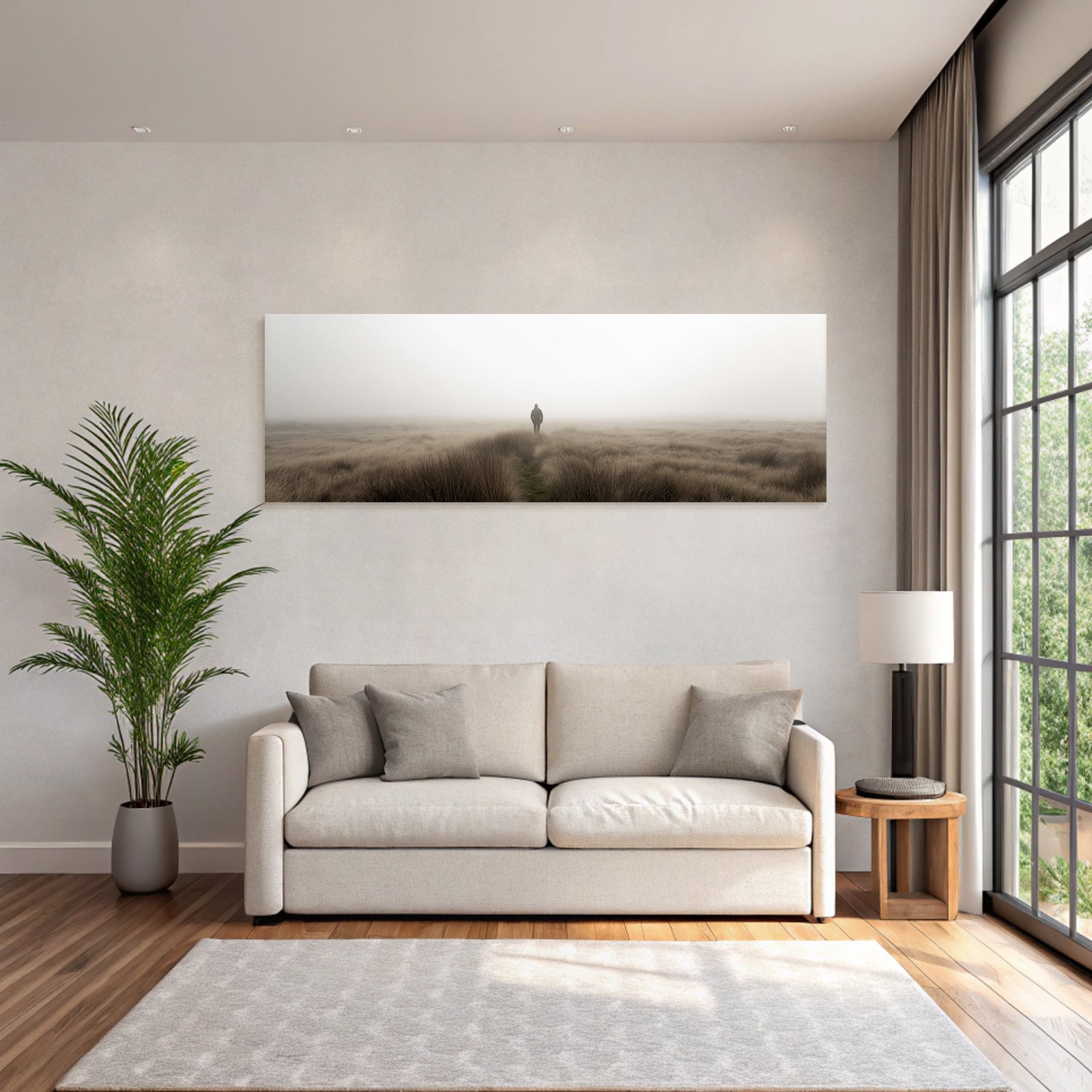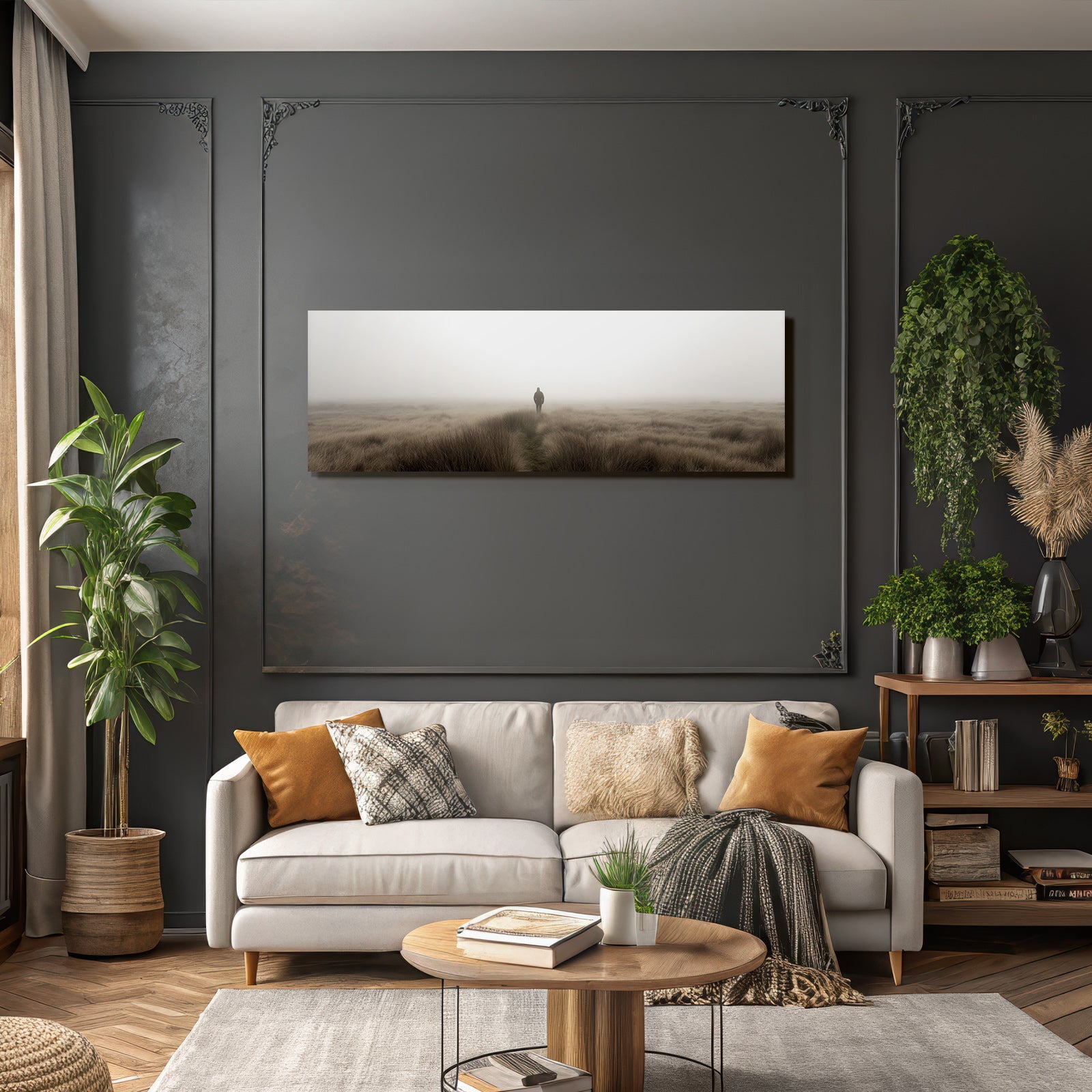 „„Nebelige Landschaft Person Im Hohen Gras““ verbindet das Beste aus Fotografie mit modernem Textildruck – edel präsentiert im hochwertigen FameFrame.