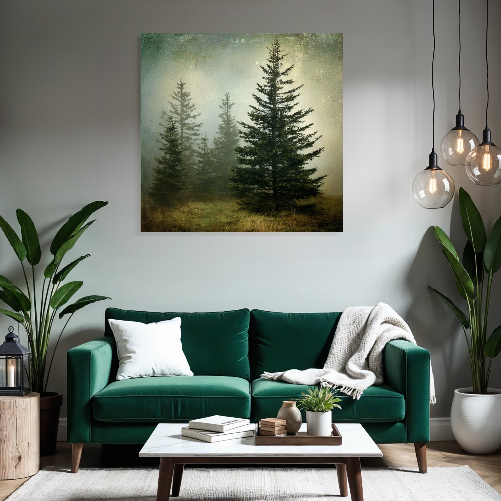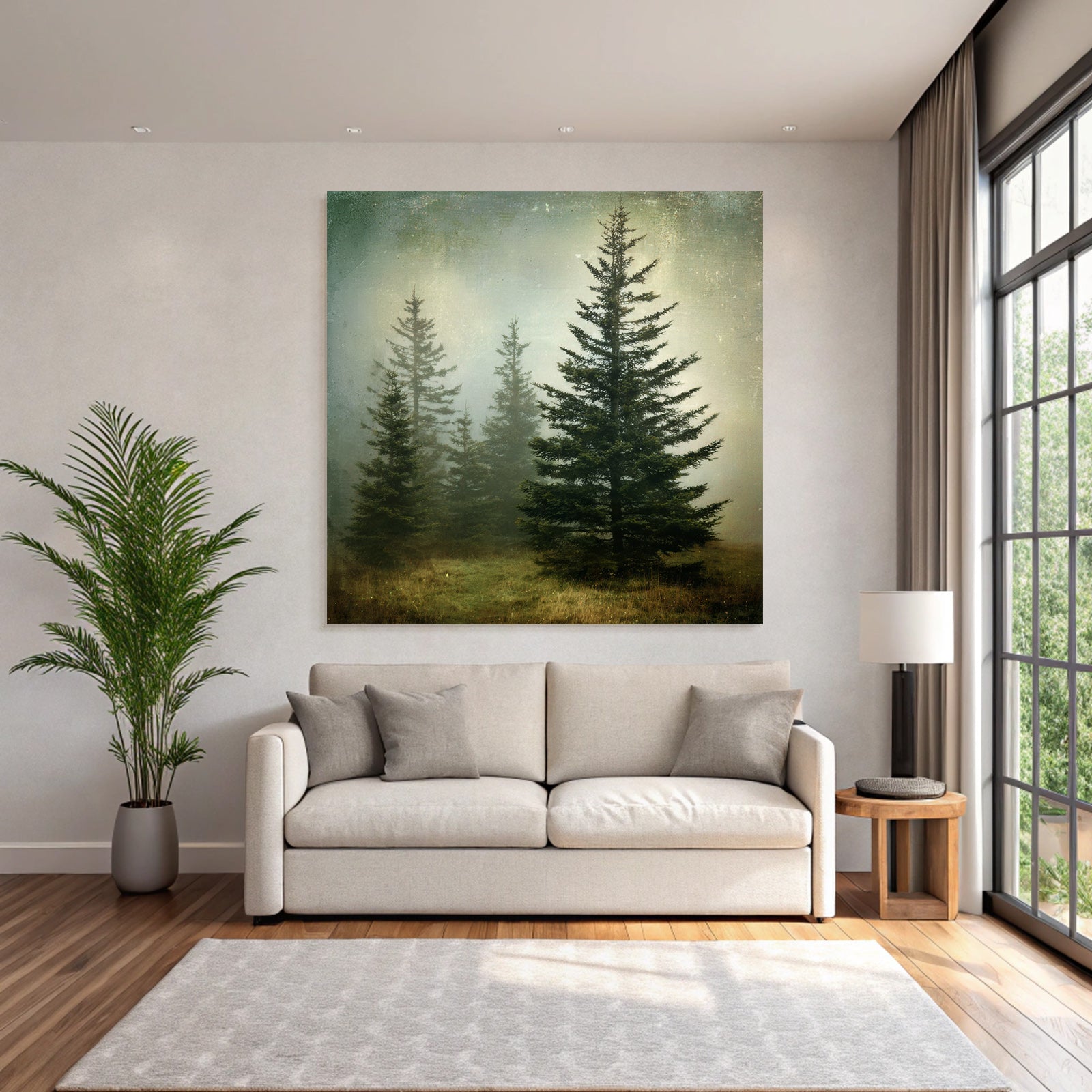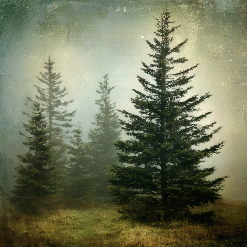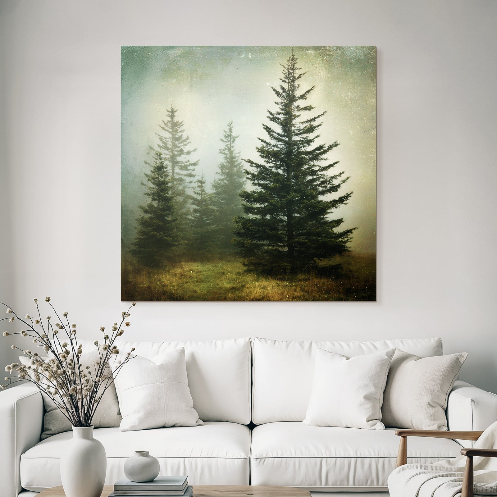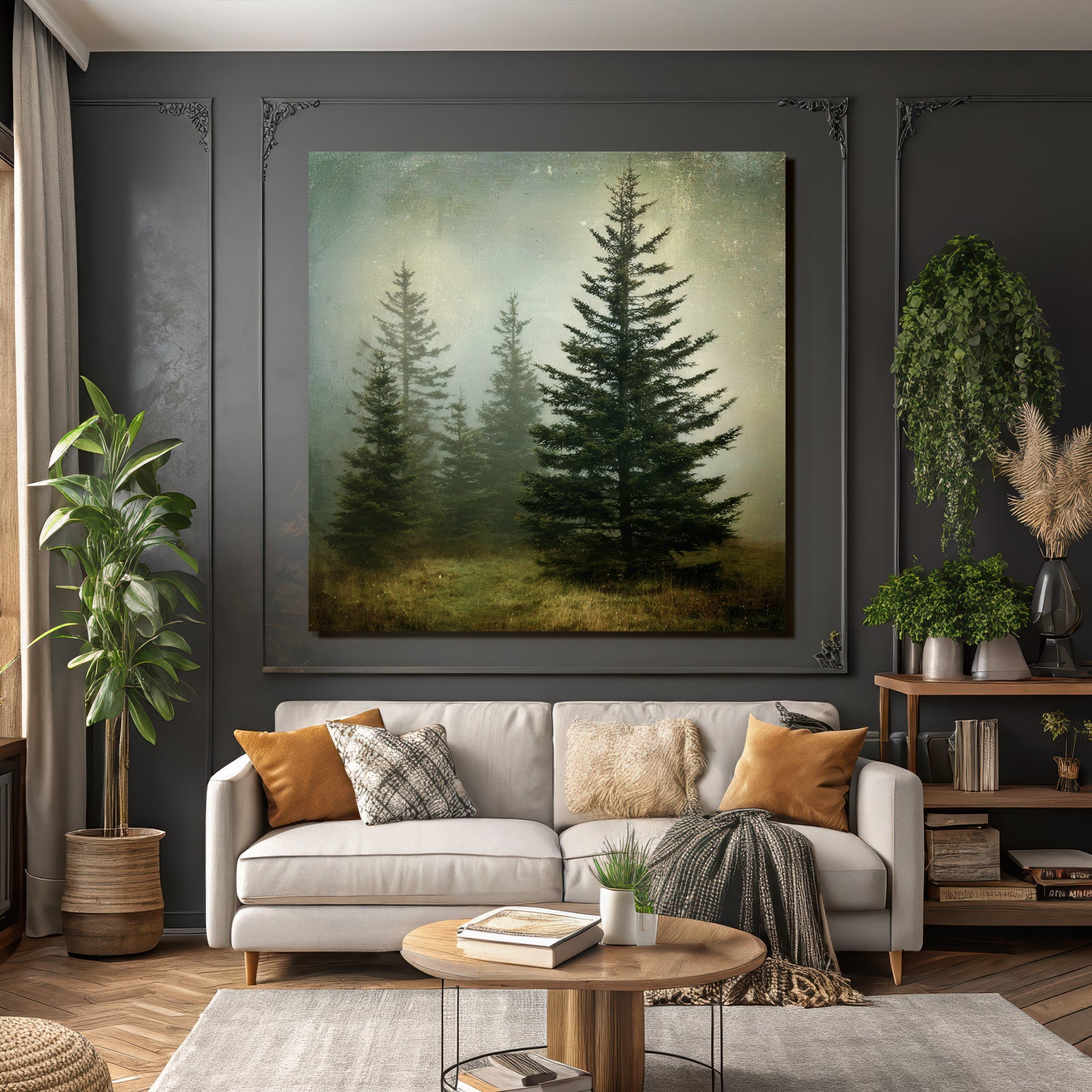 Mit Nebel und Wetter-Elementen und klarer Wirkung verleiht „Nebellandschaft Mit Immergrünen Nadelbäumen“ Deinem Raum Persönlichkeit – eingerahmt im exklusiven FameFrame.