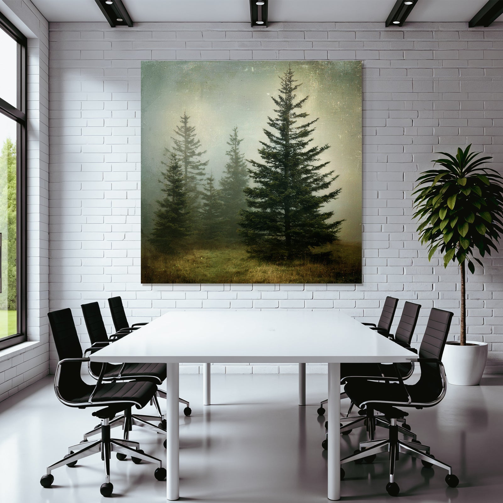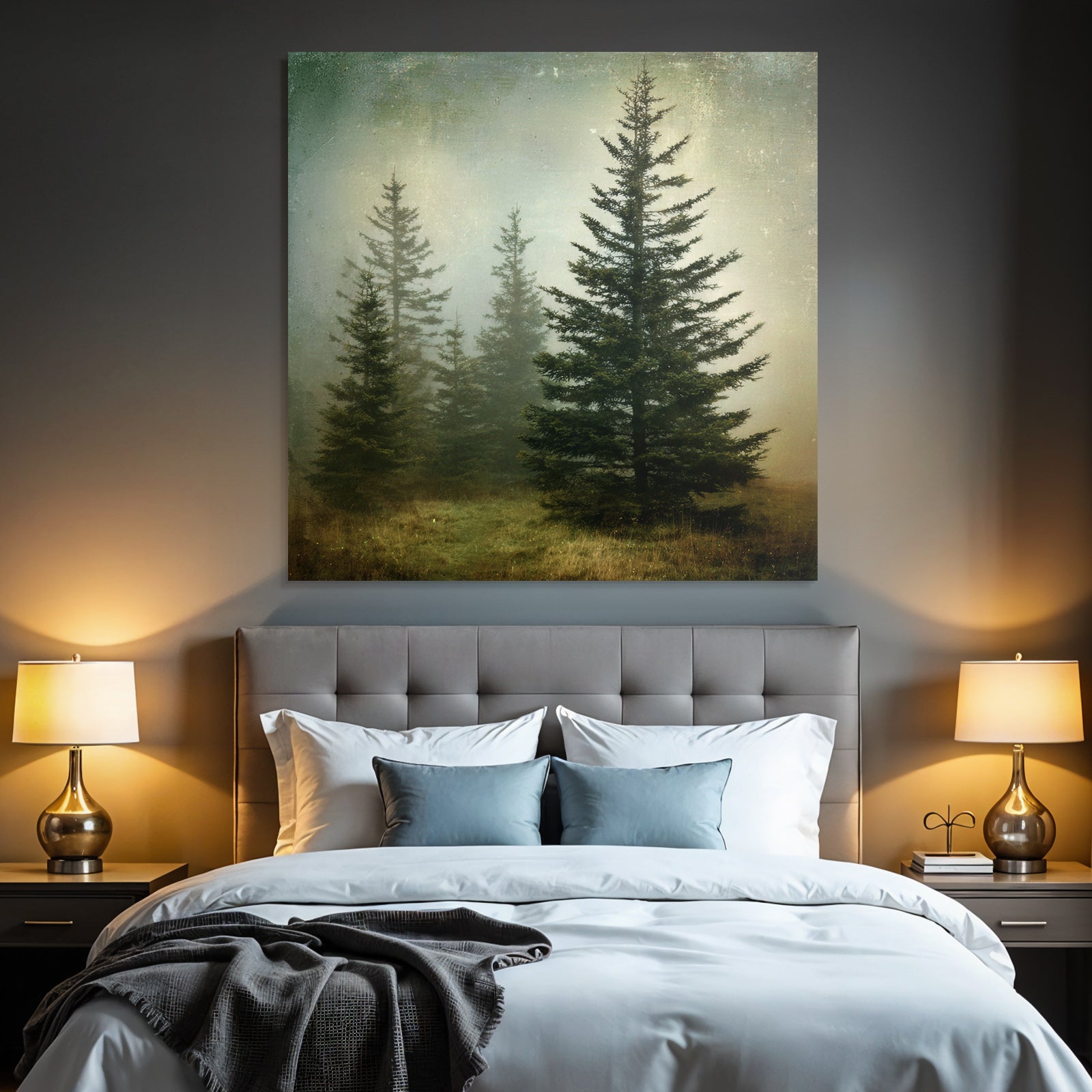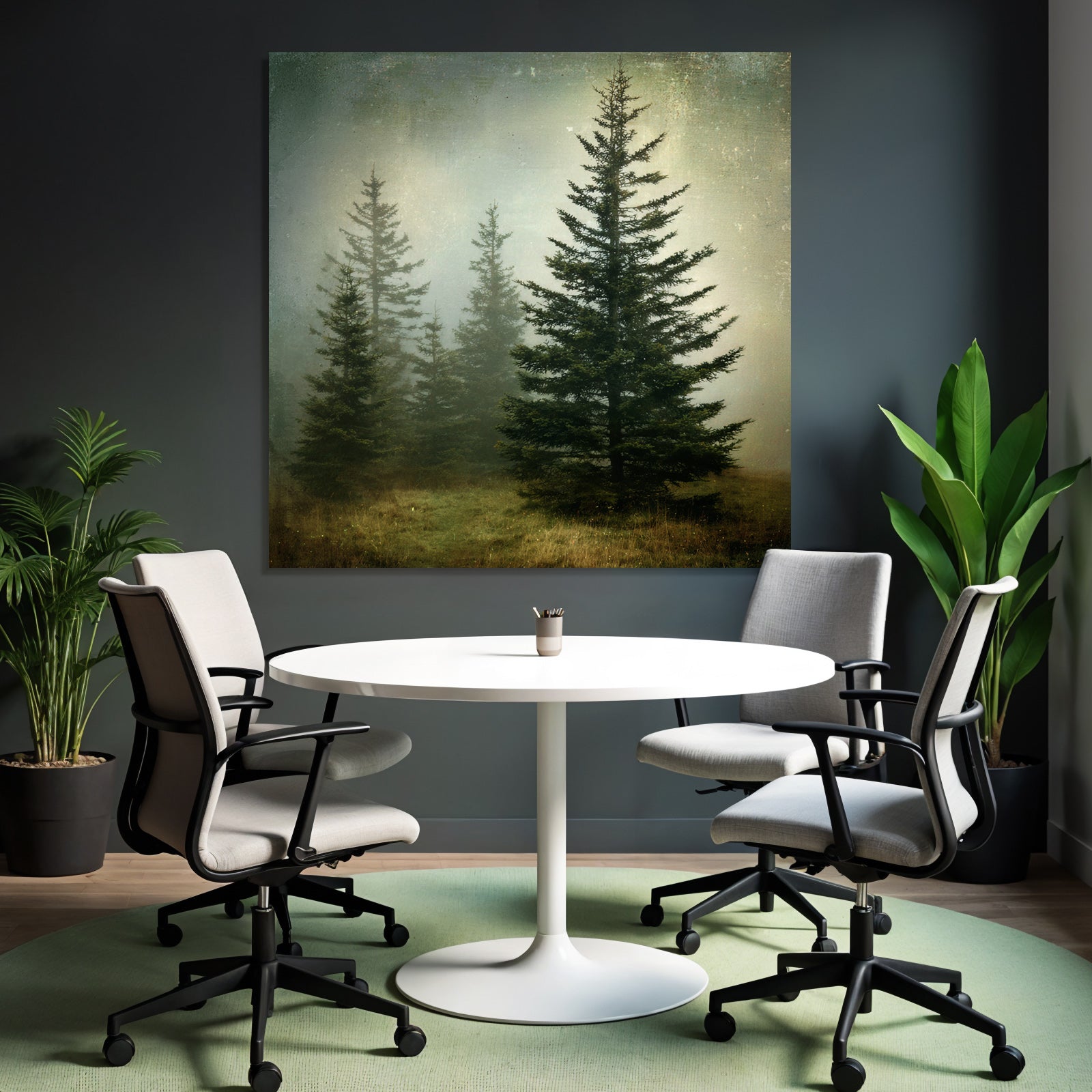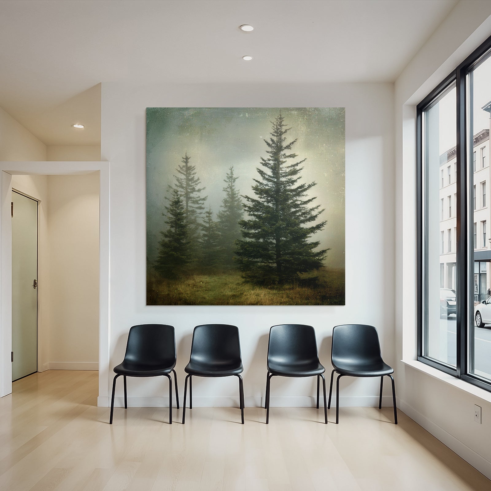 Mit Nebel und Wetter-Elementen und klarer Wirkung verleiht „Nebellandschaft Mit Immergrünen Nadelbäumen“ Deinem Raum Persönlichkeit – eingerahmt im exklusiven FameFrame.