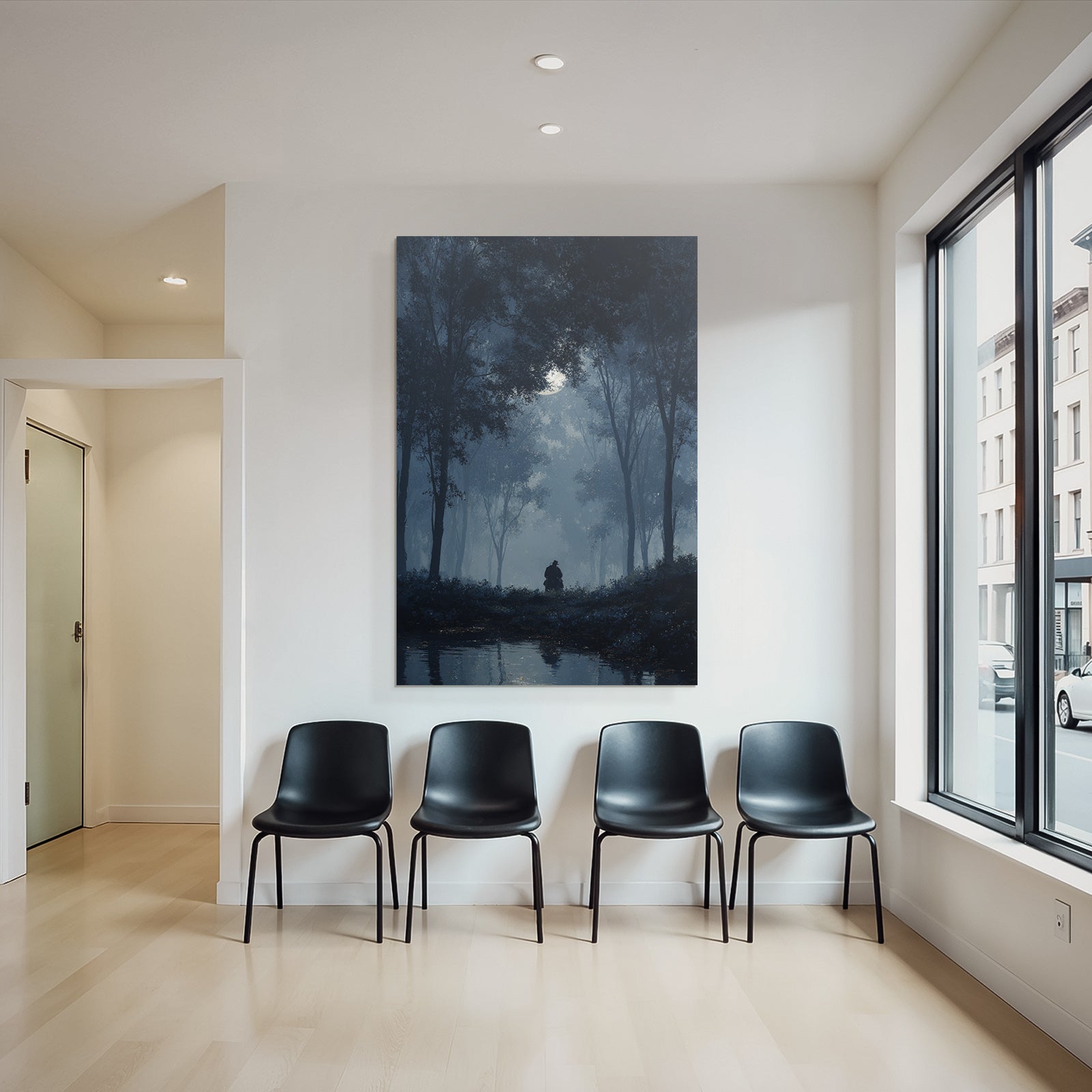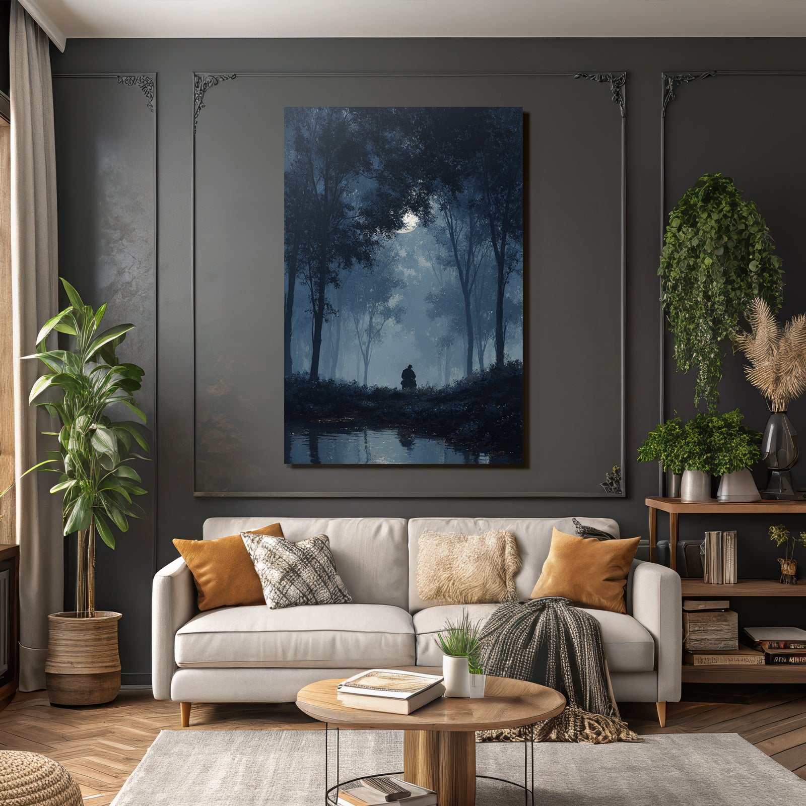 Gestalten Sie Ihr Homeoffice oder Büro inspirierend und modern. „Nebelwaldnacht Mondlicht Figur Am Wasser“ im Psychedelische Kunst-Look sorgt im FameFrame™ für eine kreative Arbeitsatmosphäre.
