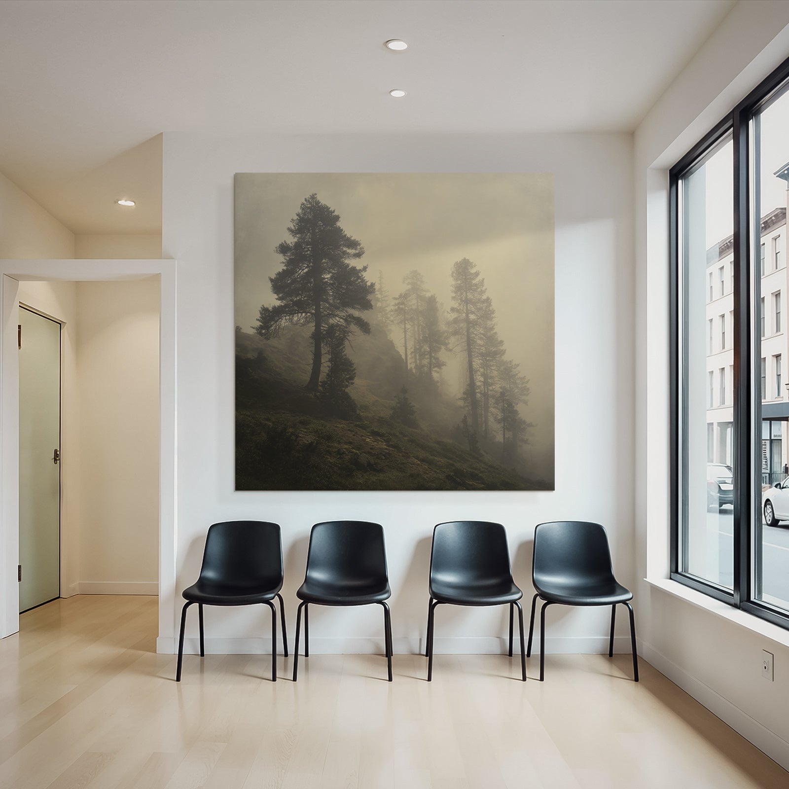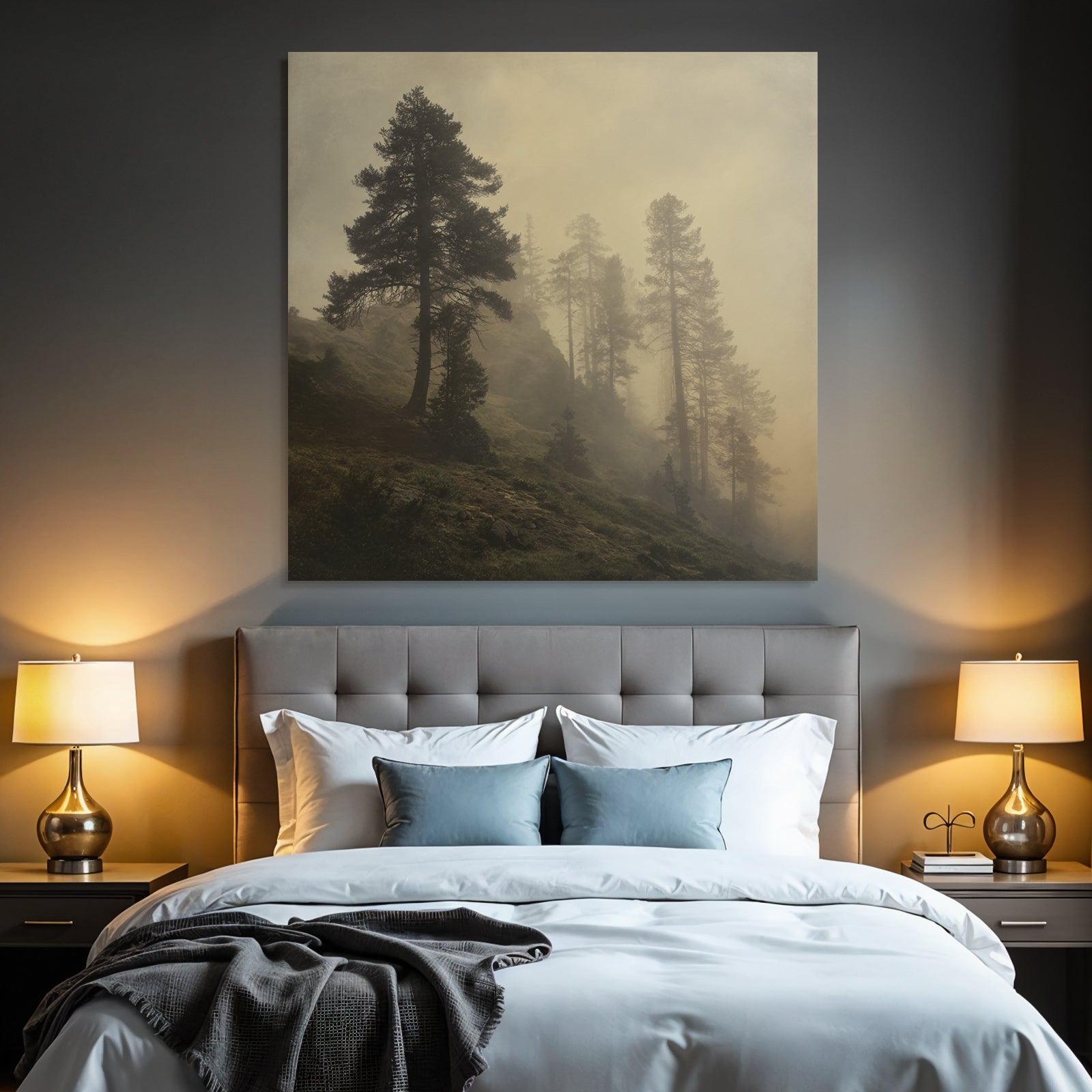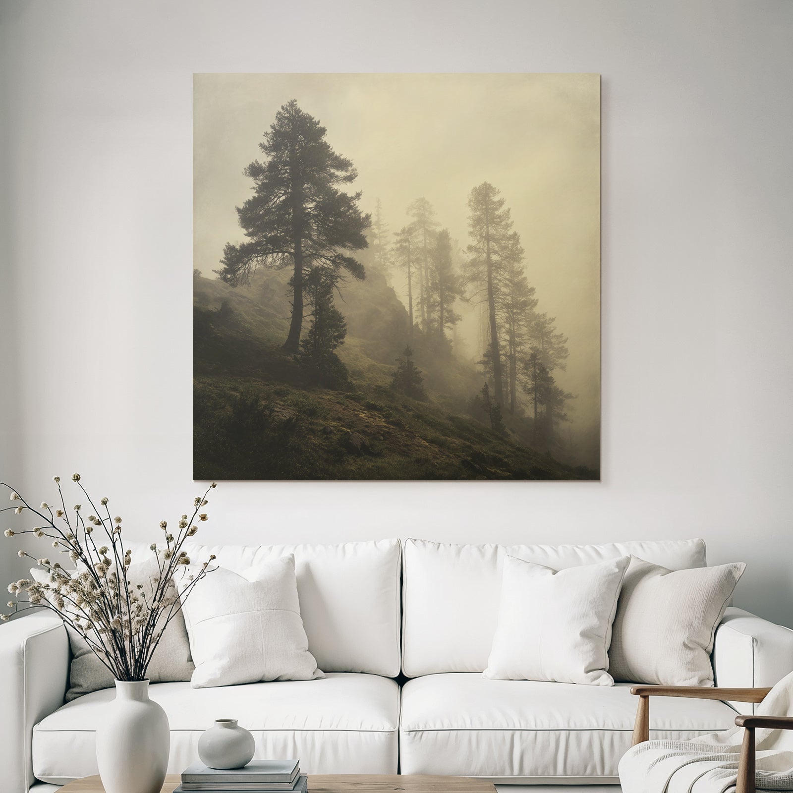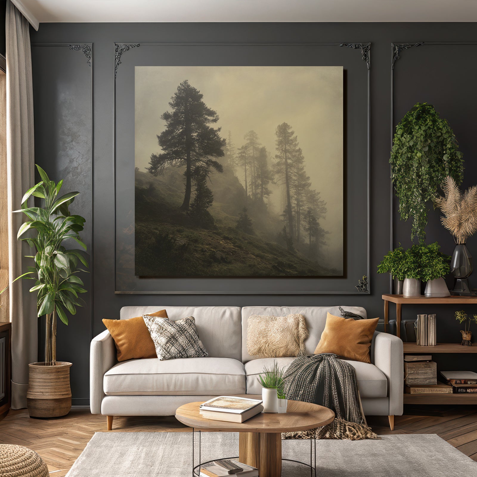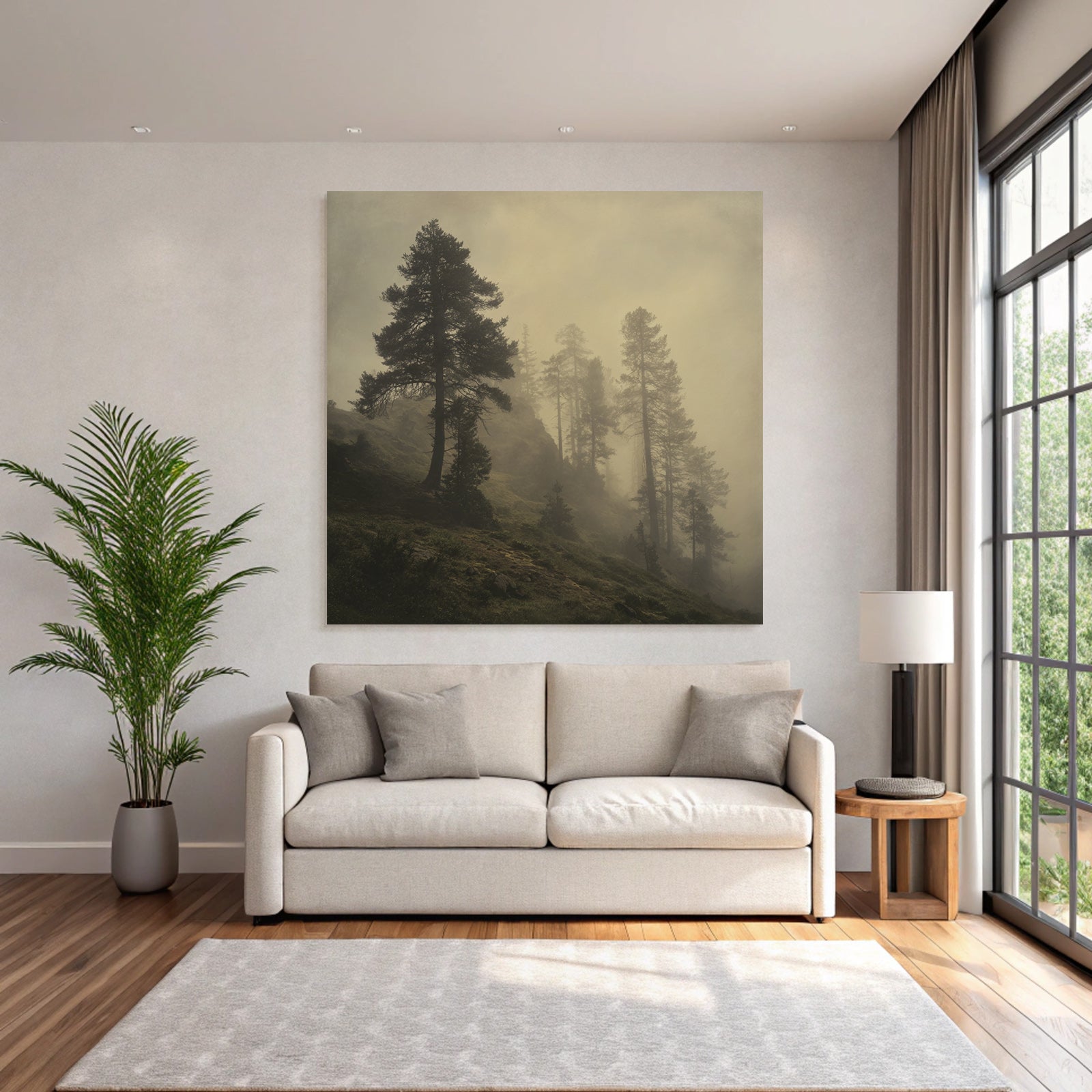 Bring die Atmosphäre von Nebel und Wetter in Dein Zuhause – mit „Nebliger Wald Mit Sanftem Licht“ auf Stoff im austauschbaren FameFrame.