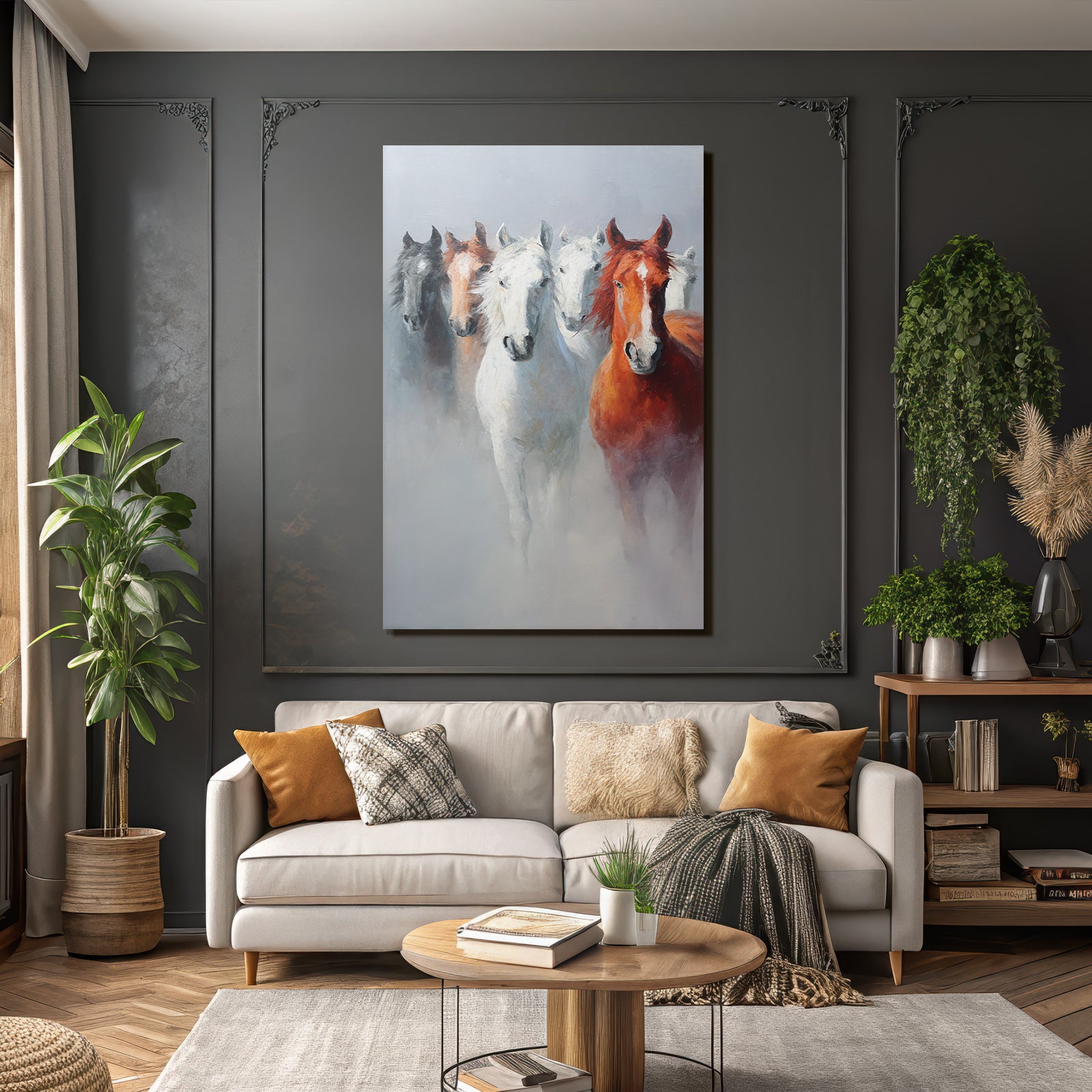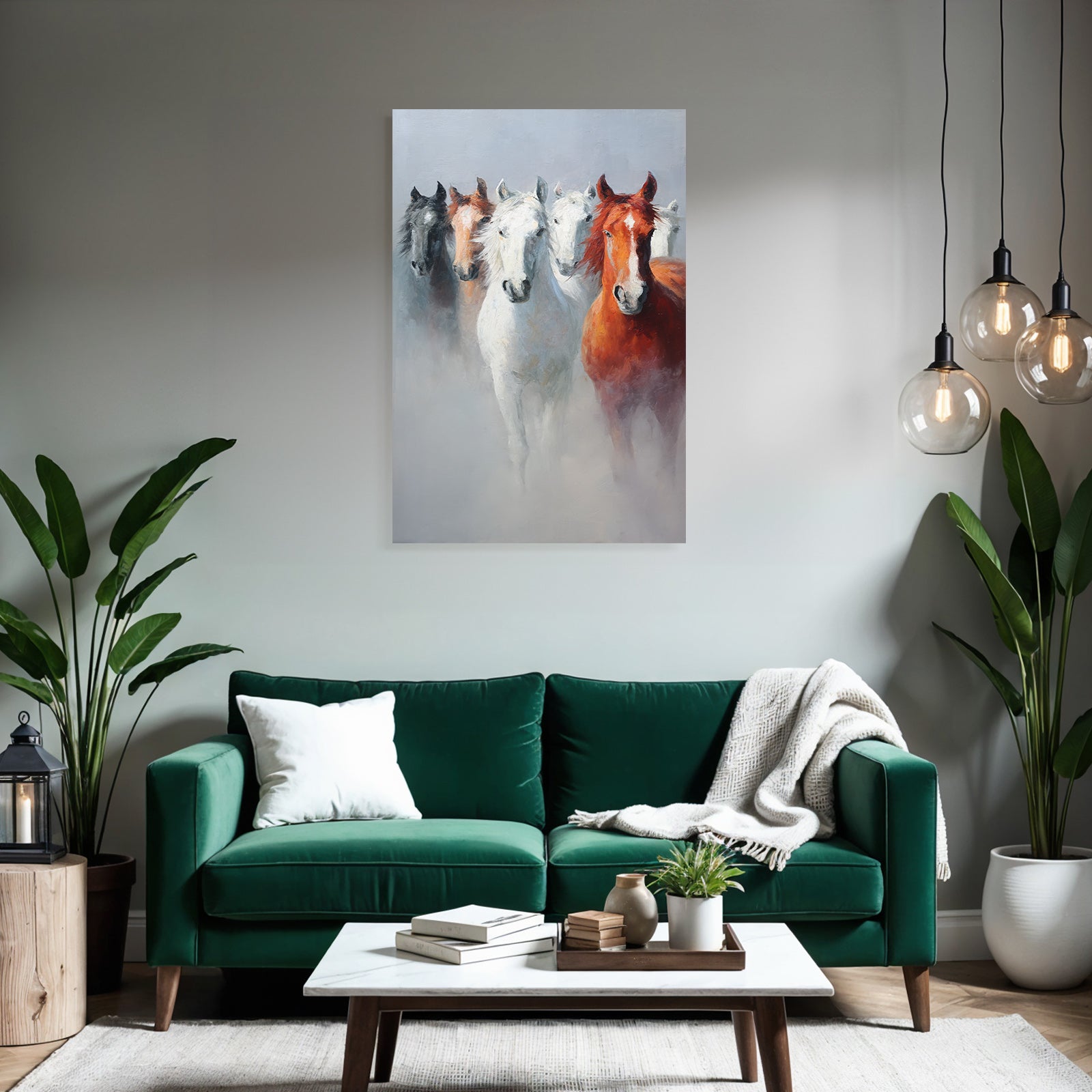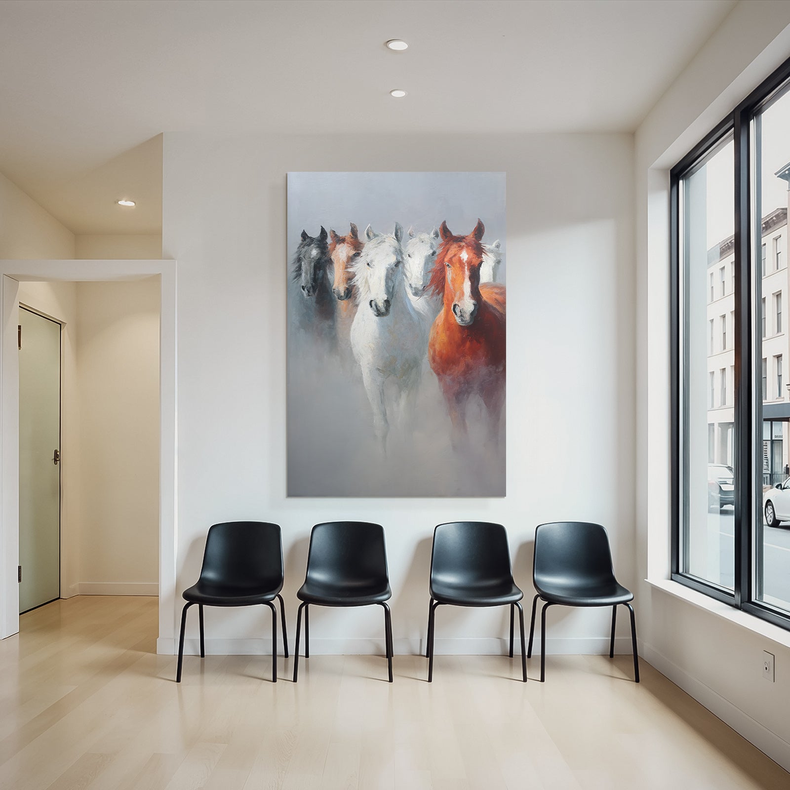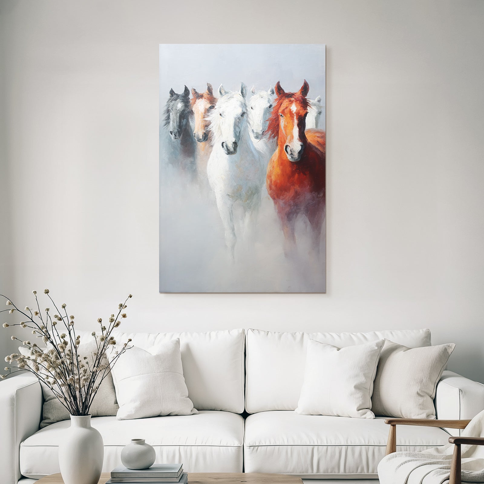 Ob Flur, Wohnraum oder Wartebereich – das Motiv „„Pferde Im Nebel Impressionistische Malerei““ im Stil Klassisch wirkt durch den hochwertigen FameFrame besonders modern.