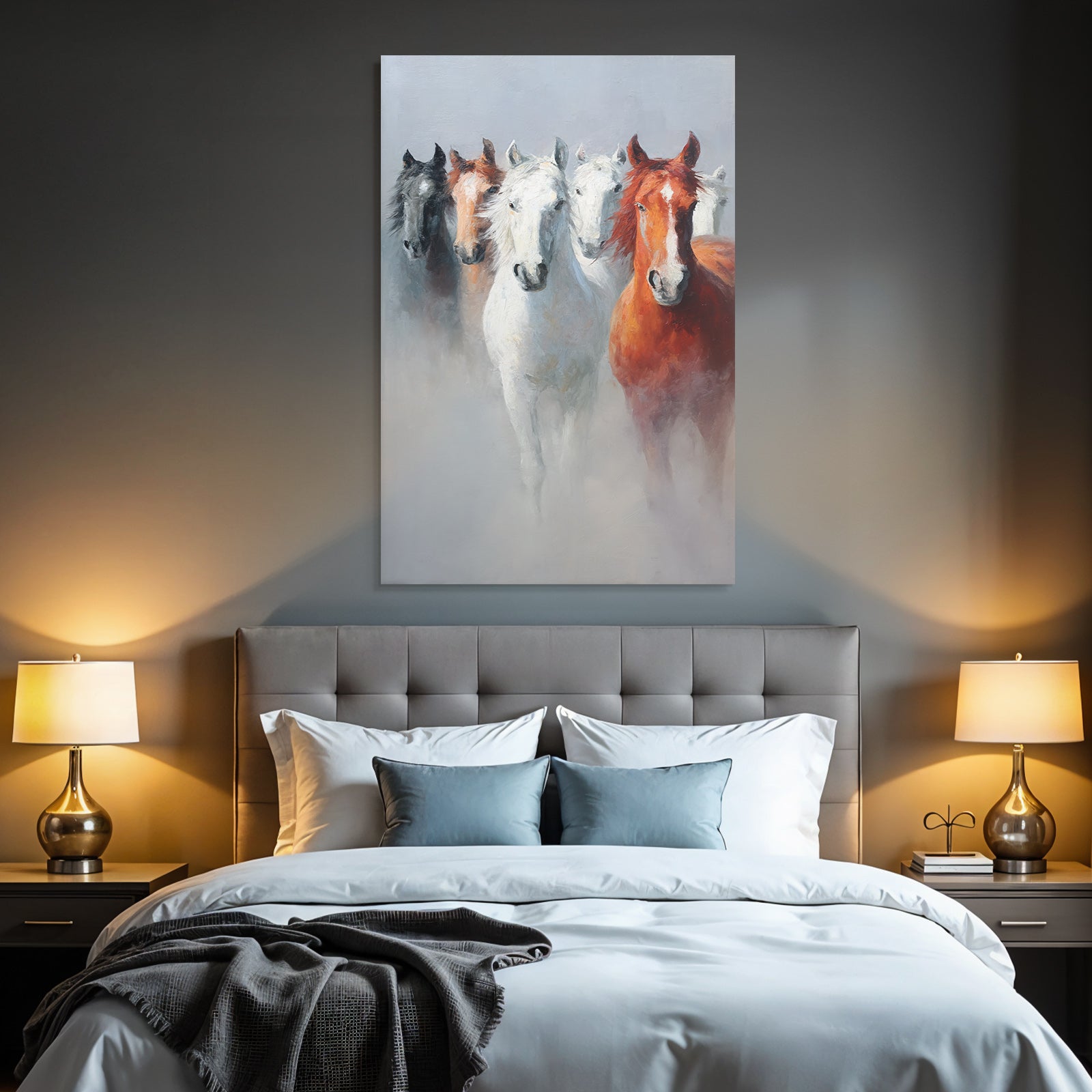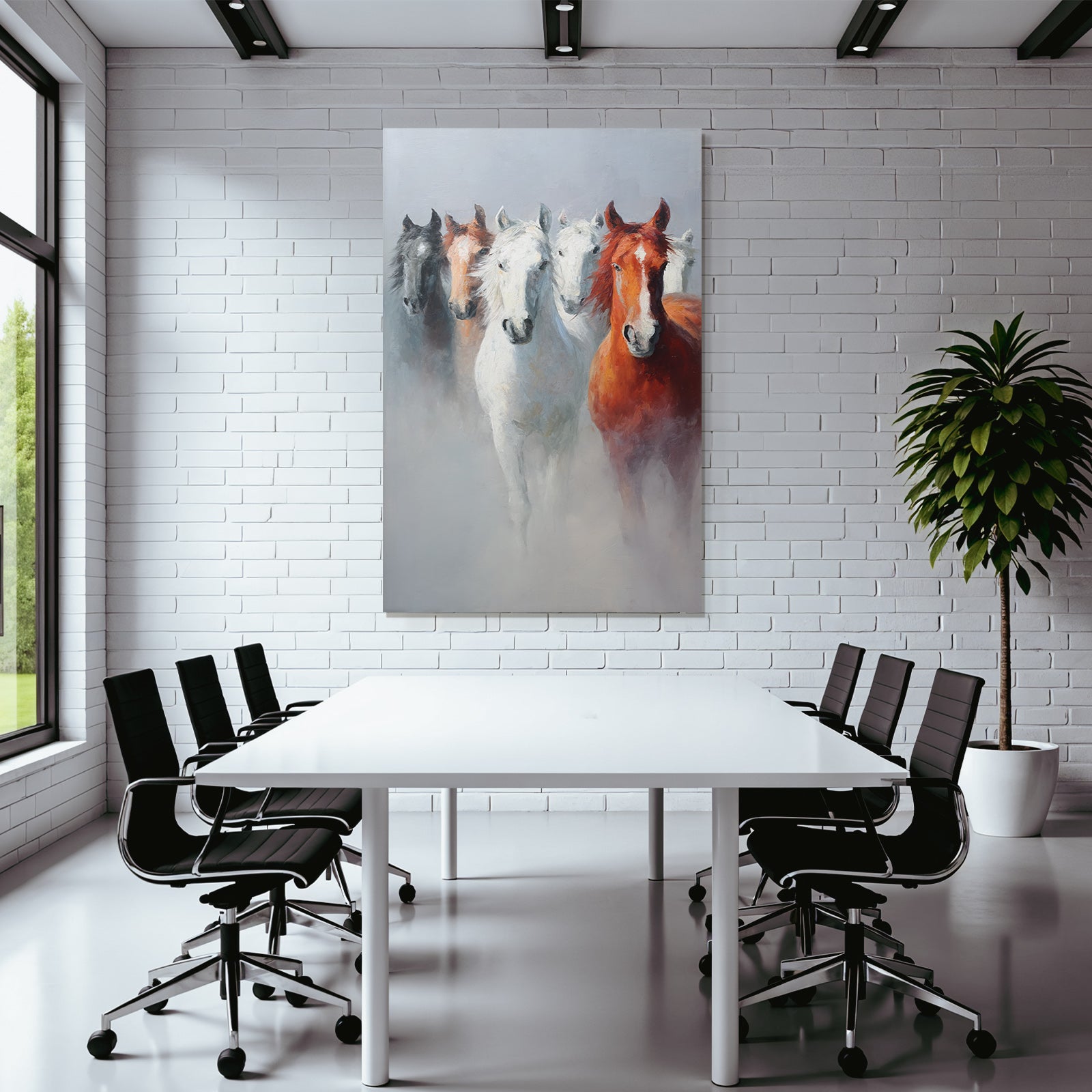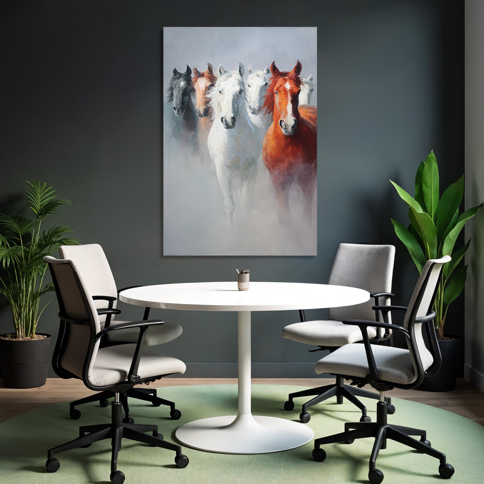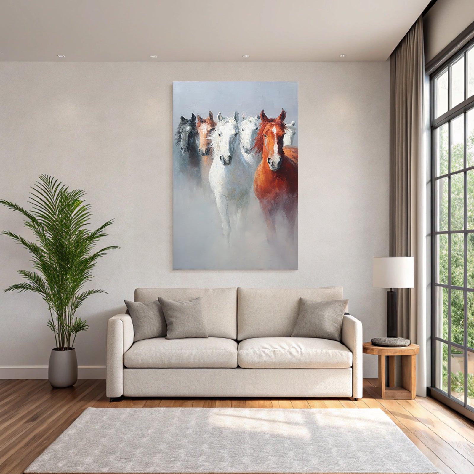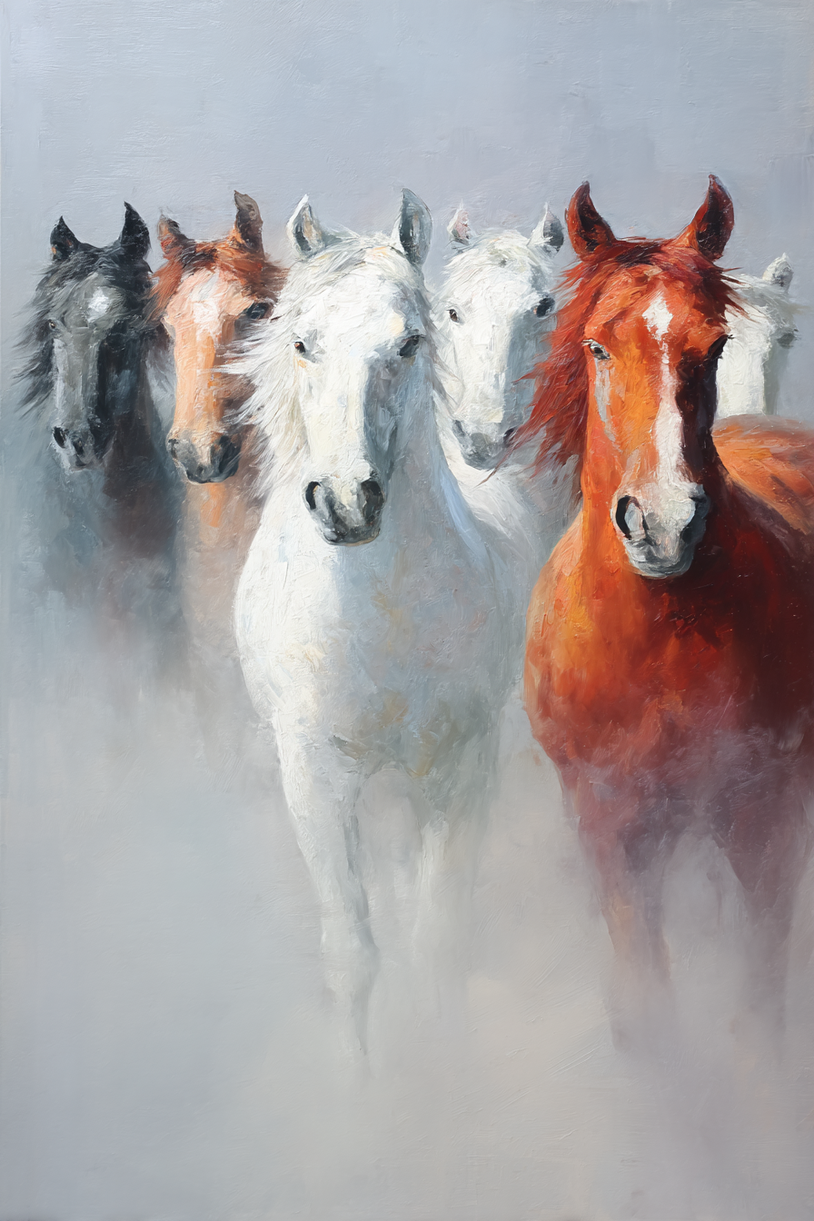 Ob Flur, Wohnraum oder Wartebereich – das Motiv „„Pferde Im Nebel Impressionistische Malerei““ im Stil Klassisch wirkt durch den hochwertigen FameFrame besonders modern.