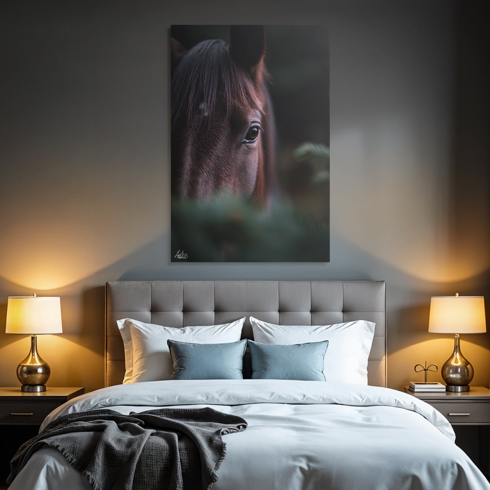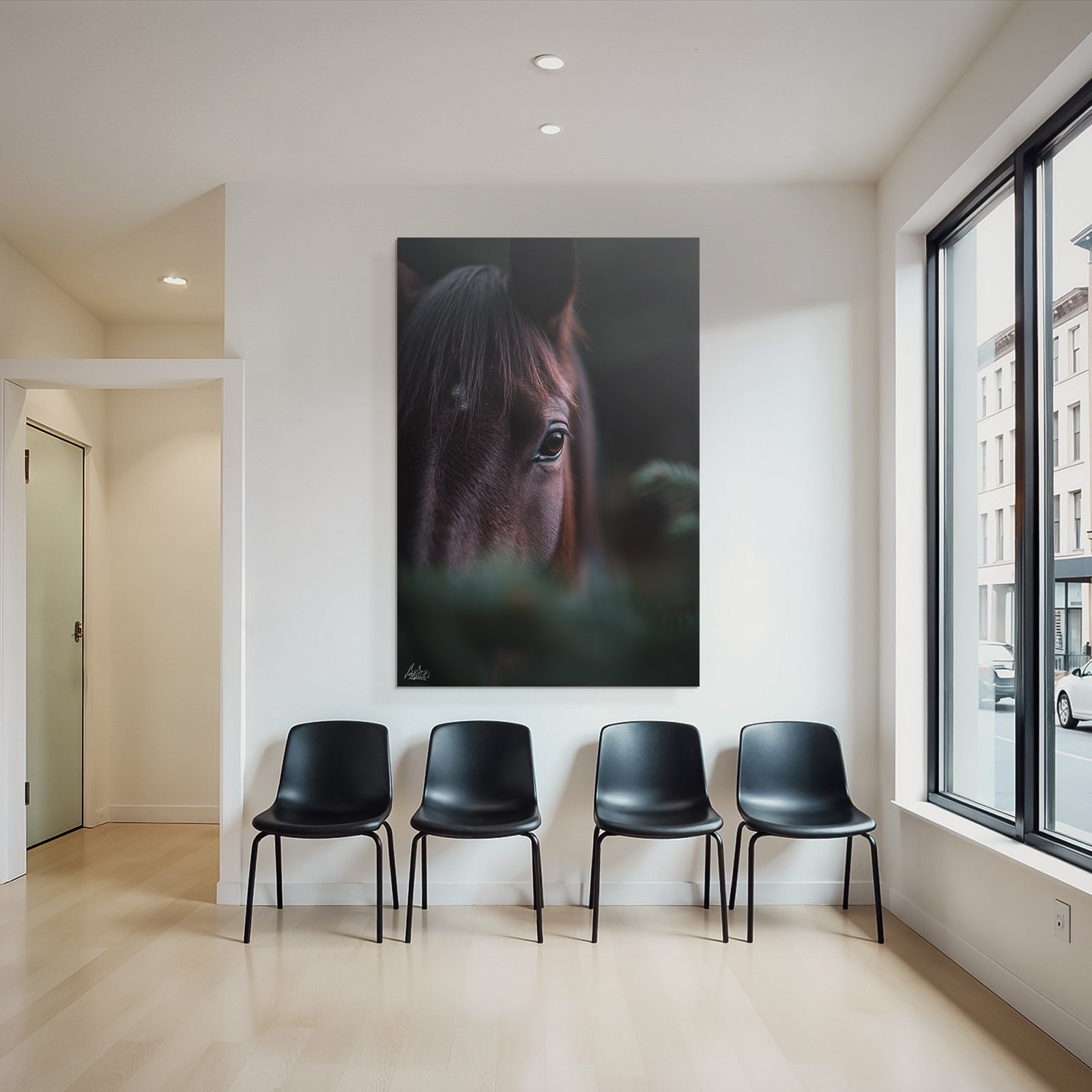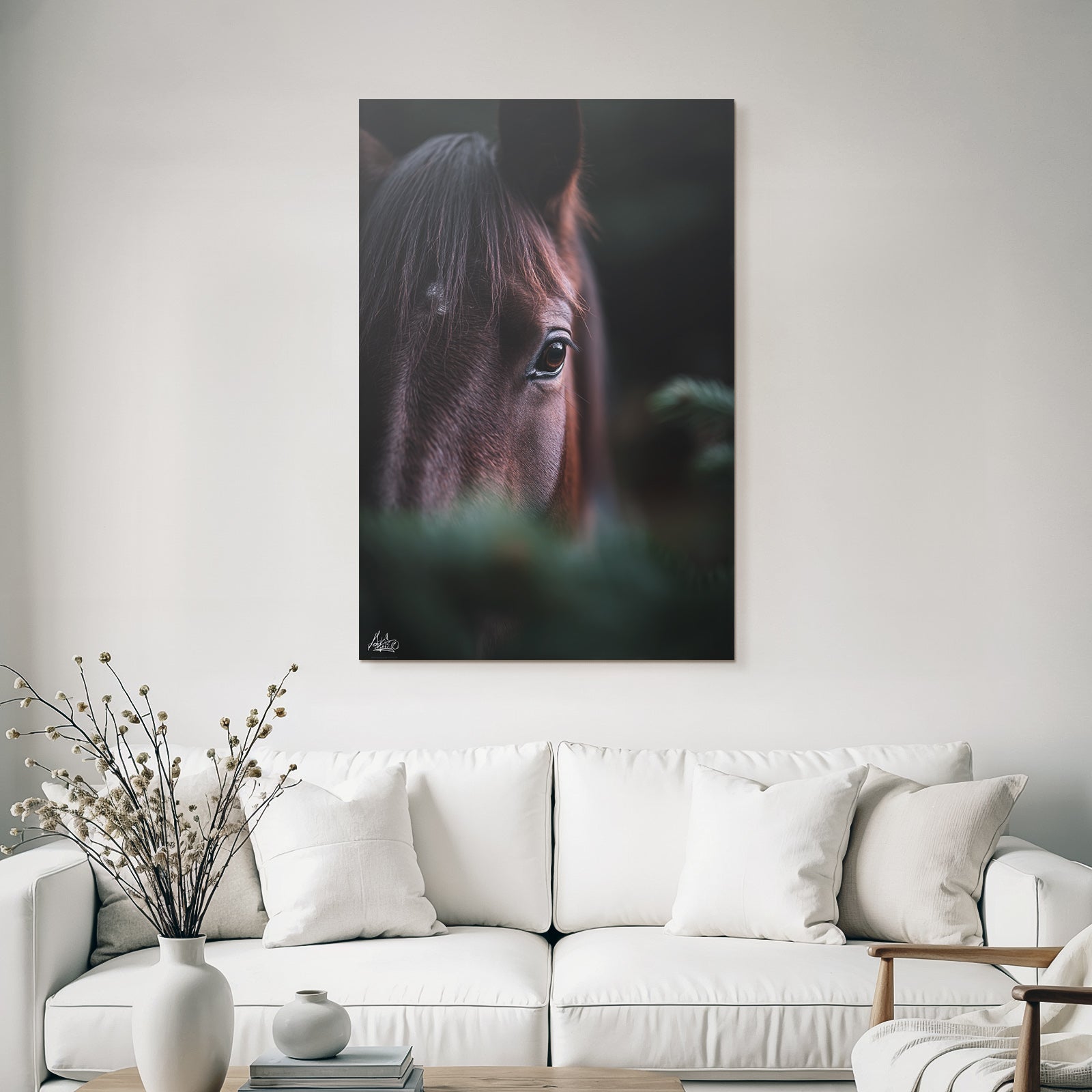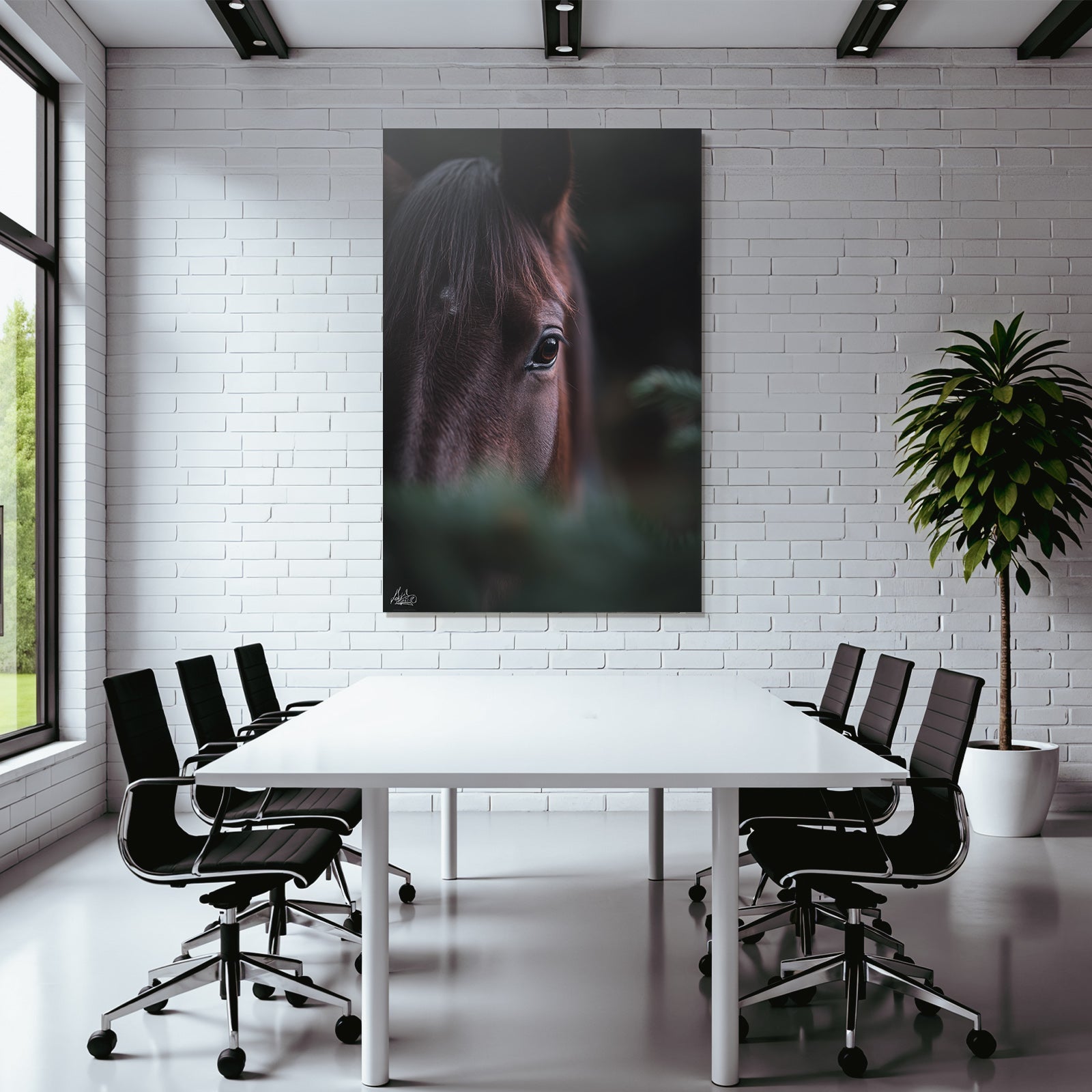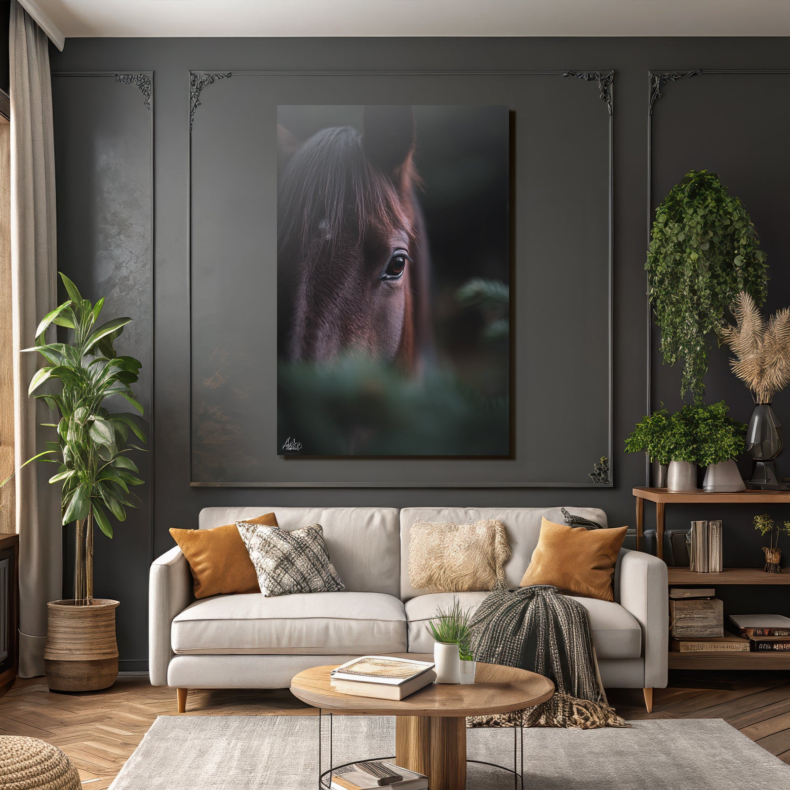 Mach mehr aus Deinem Wohnbereich oder Besprechungszimmer – „„Pferdeauge Und Fell Textur Im Gruenen““ im Stil Klassisch überzeugt als eleganter Textildruck im FameFrame.