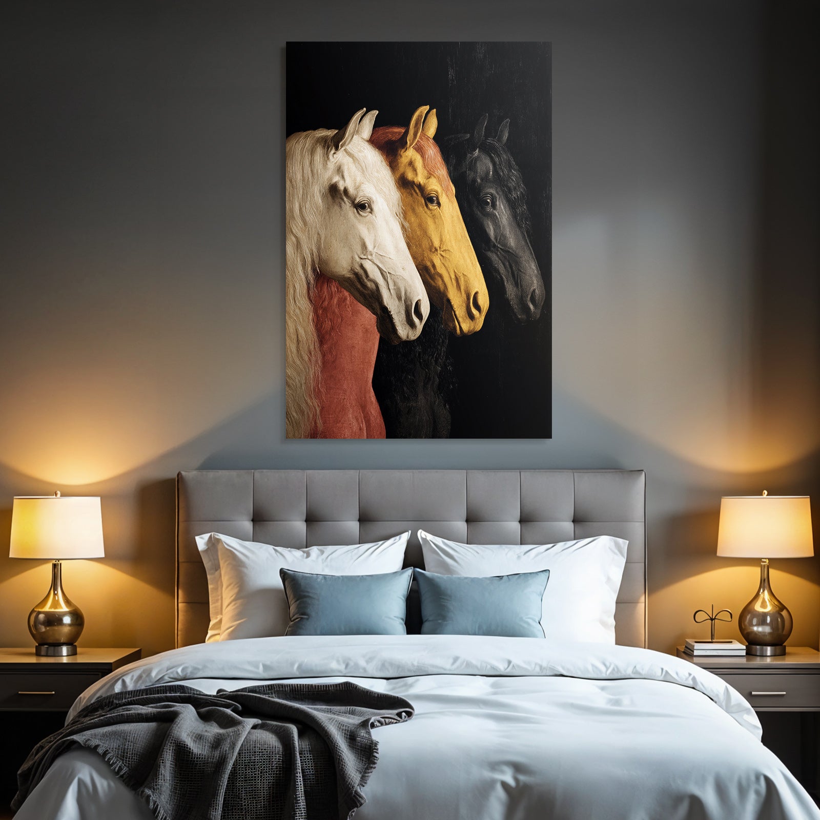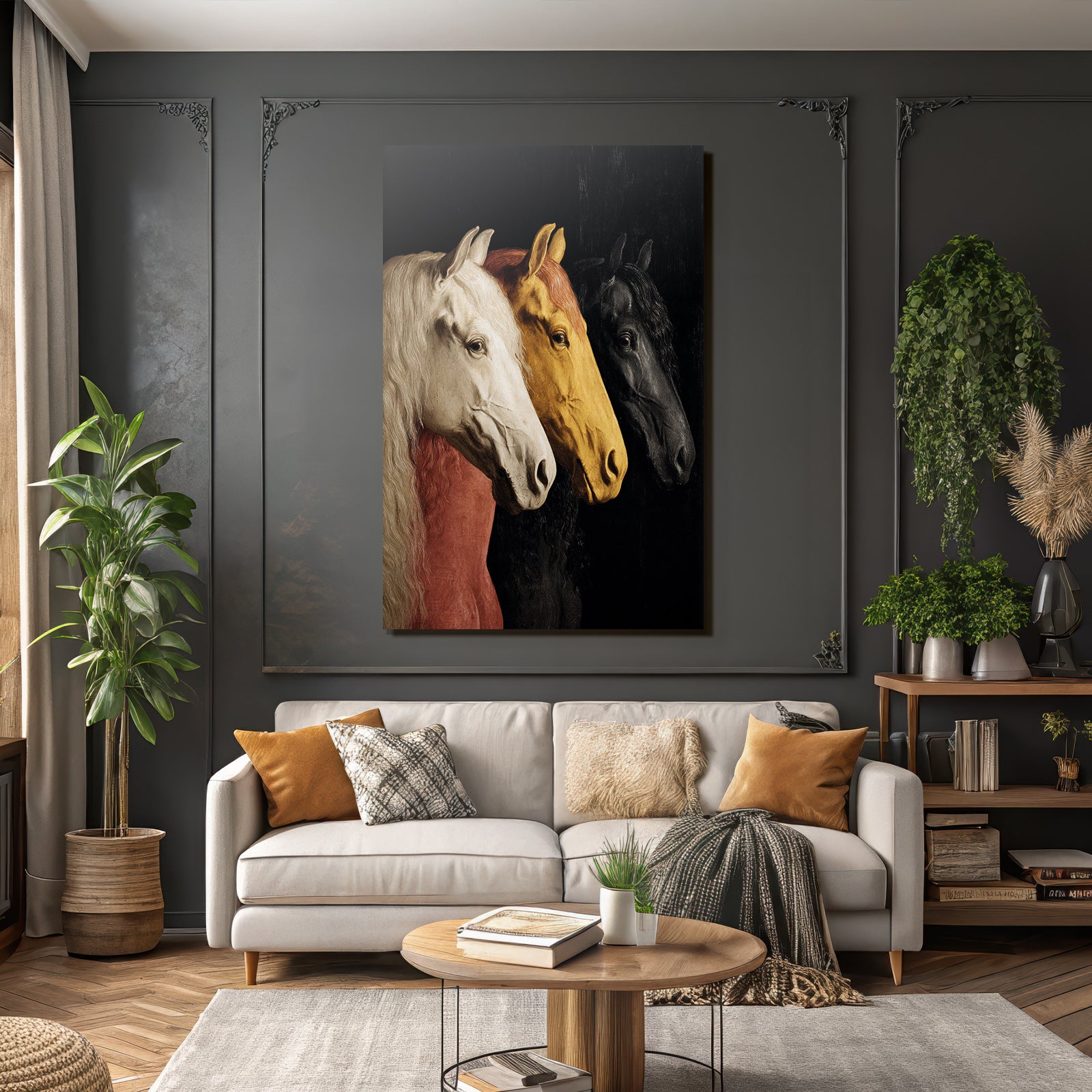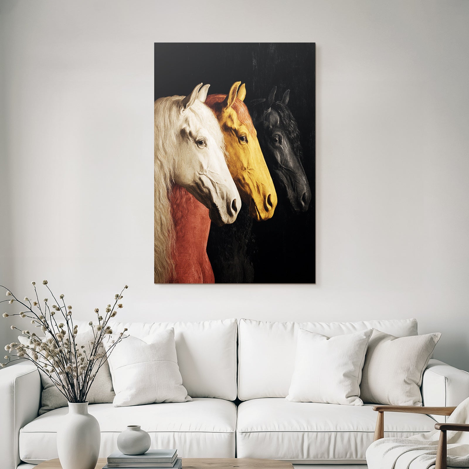 „„Pferdekopf Weiss Gold Schwarz Dunkler Hintergrund““ im Stil Klassisch sorgt für stilvolle Ruhe im Schlafzimmer oder inspirierende Energie im Büro – perfekt im FameFrame inszeniert.