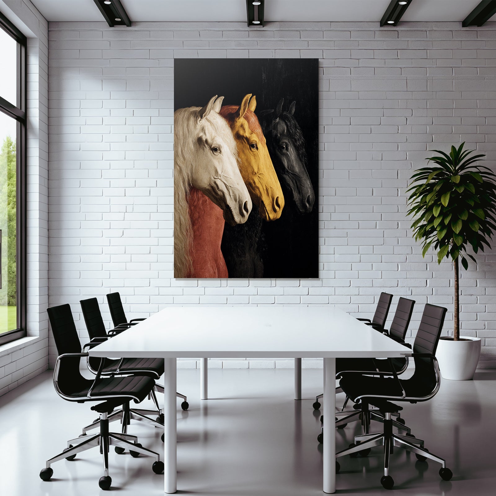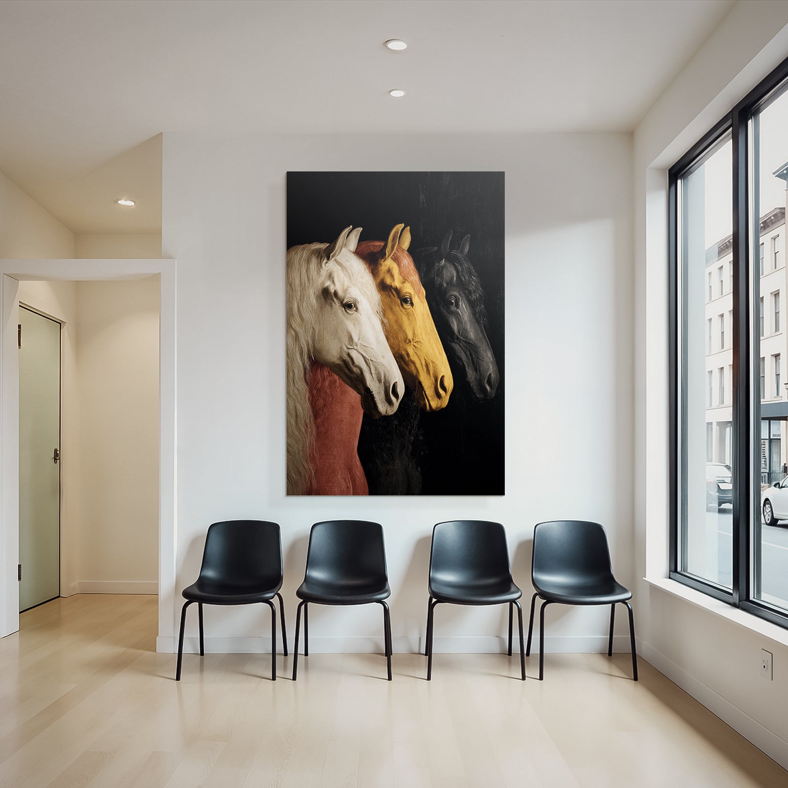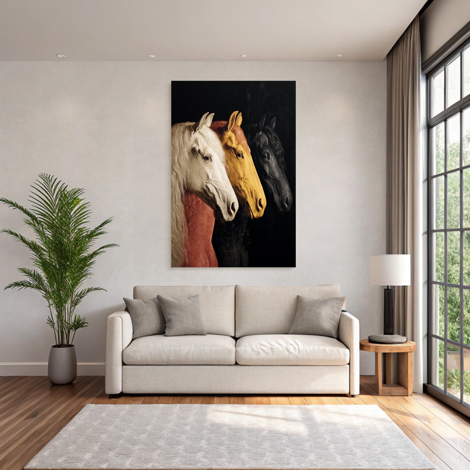 „„Pferdekopf Weiss Gold Schwarz Dunkler Hintergrund““ im Stil Klassisch sorgt für stilvolle Ruhe im Schlafzimmer oder inspirierende Energie im Büro – perfekt im FameFrame inszeniert.