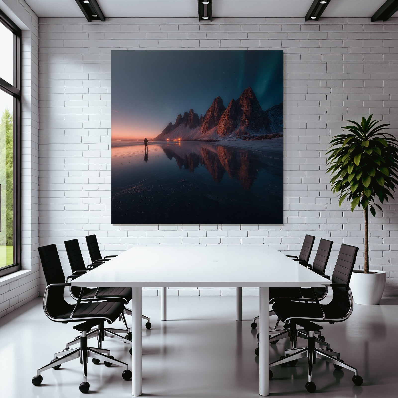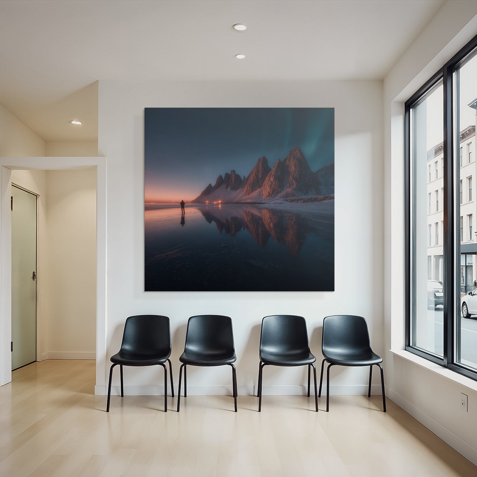Ein Highlight für jeden Besprechungsraum oder eine großzügige Lobby. Das Werk „Polarlicht Atemberaubende Landschaft Mit Bergen Und Reflektion Im Wasser Bei Twilight“ im Stil Fjorde und Gletscher demonstriert im FameFrame™ Stilbewusstsein und Klasse.