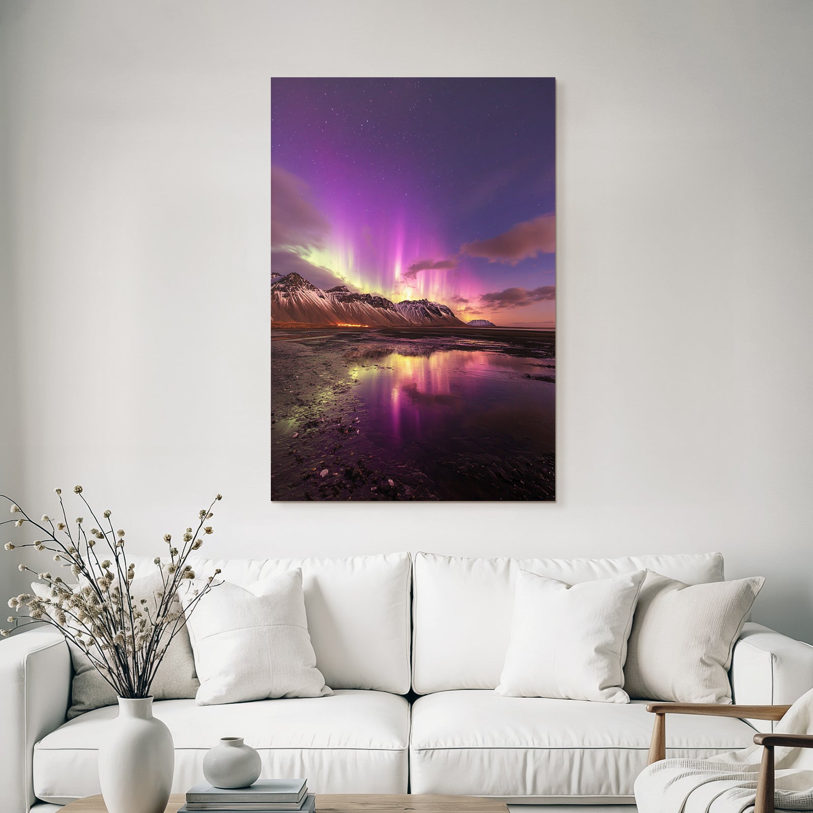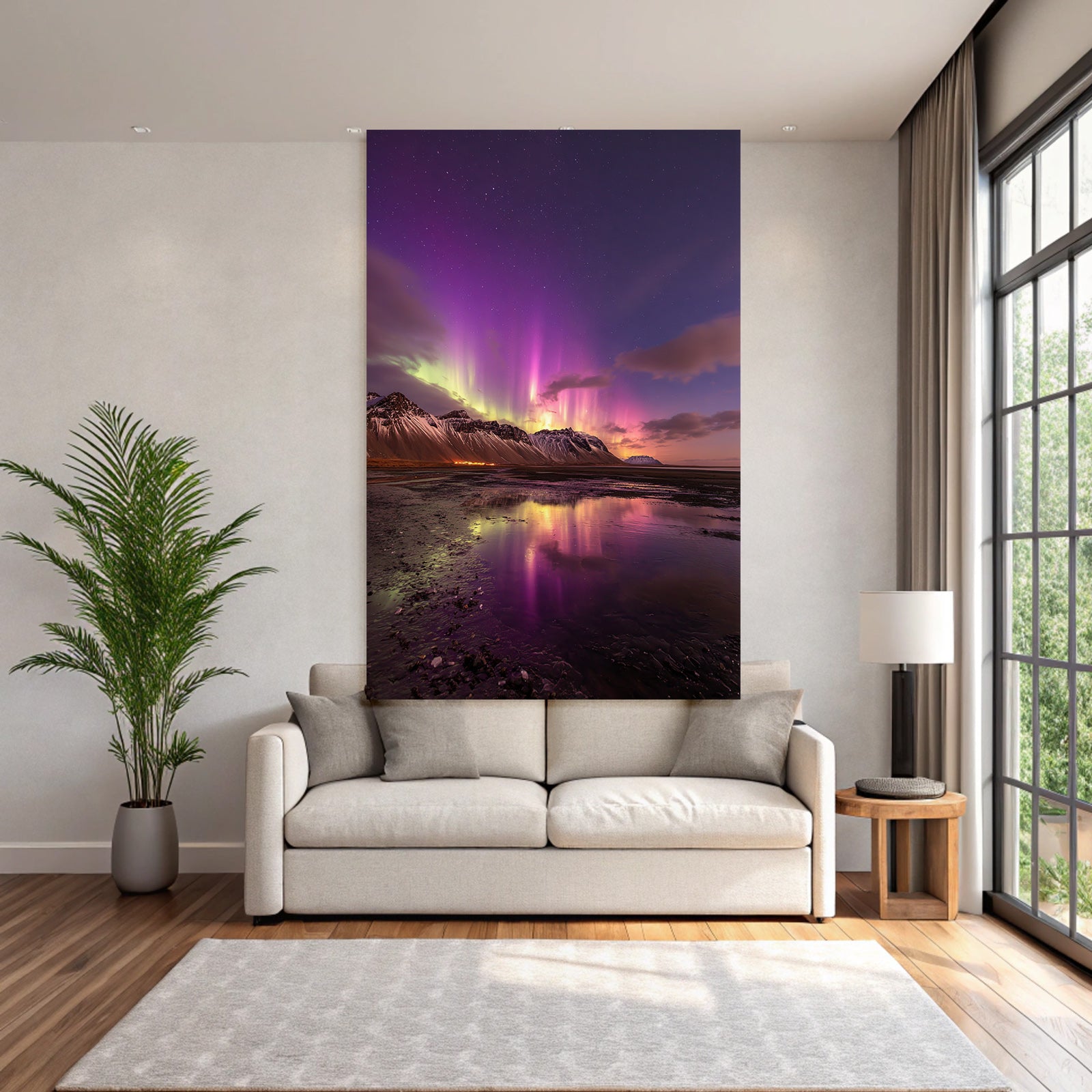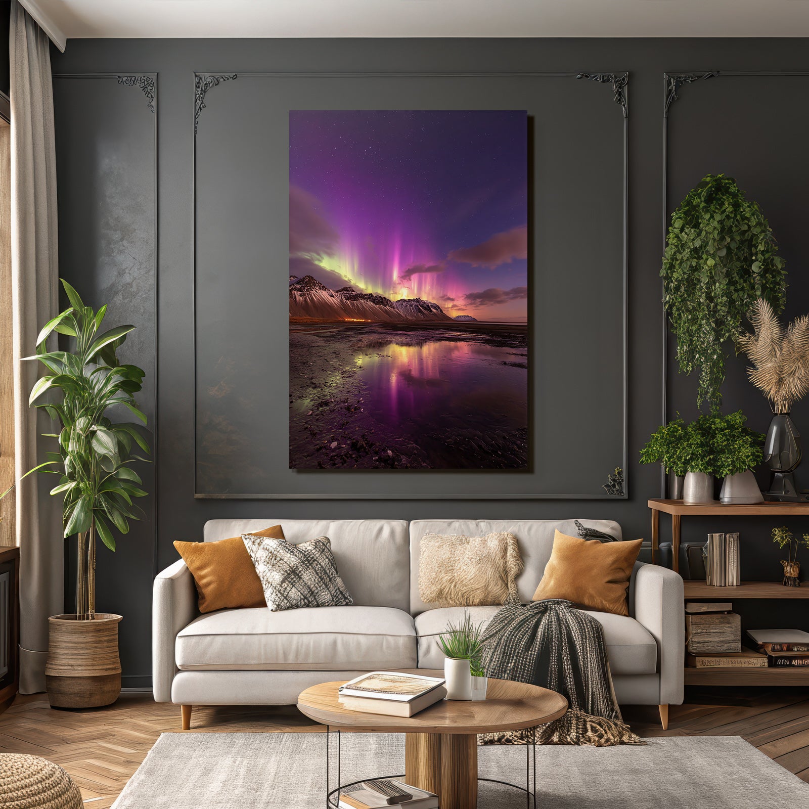 „Polarlicht Aurora Erscheinung Über Schneebedeckten Bergen Und Reflektierendem Wasser“ bringt den Stil Fjorde und Gletscher an Deine Wand – perfekt für Schlafzimmer, Homeoffice oder Besprechungsräume, edel gerahmt im FameFrame™.